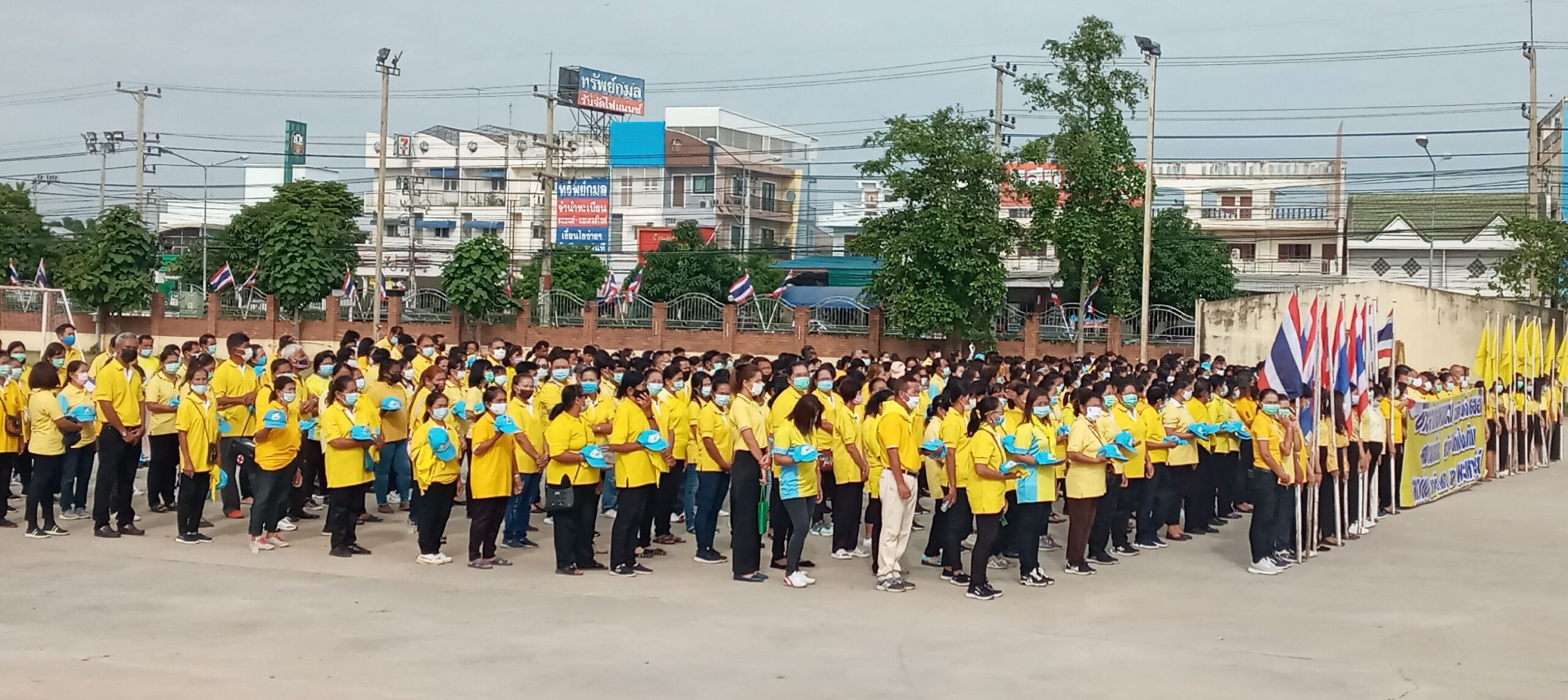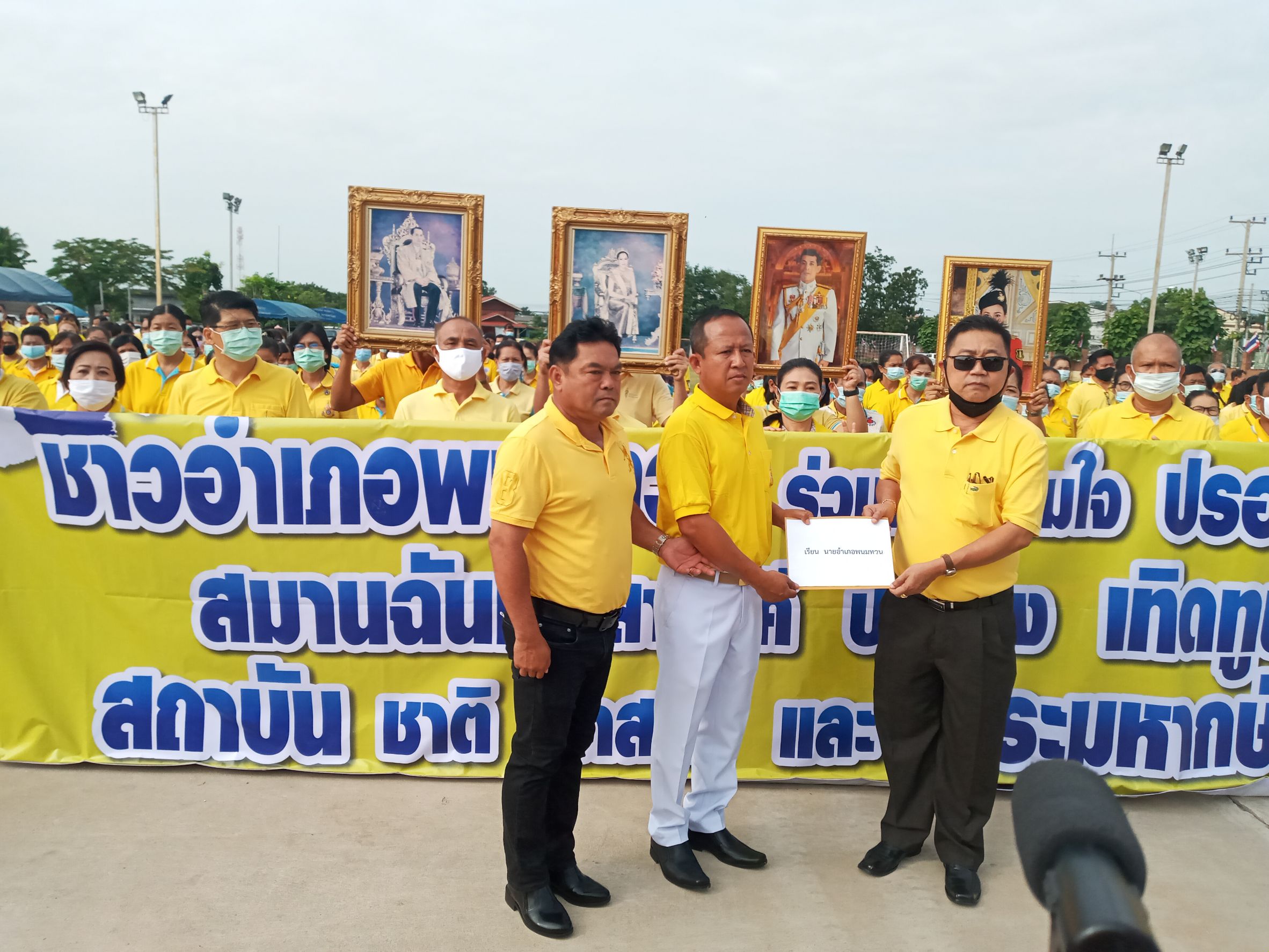 กาญจนบุรี ชาวพนมทวนกว่า 500 คน พร้อมใจสวมใส่เสื้อเหลืองออกมาแสดงจุดยืนปกป้องสถาบัันพระมหากษัตริย์