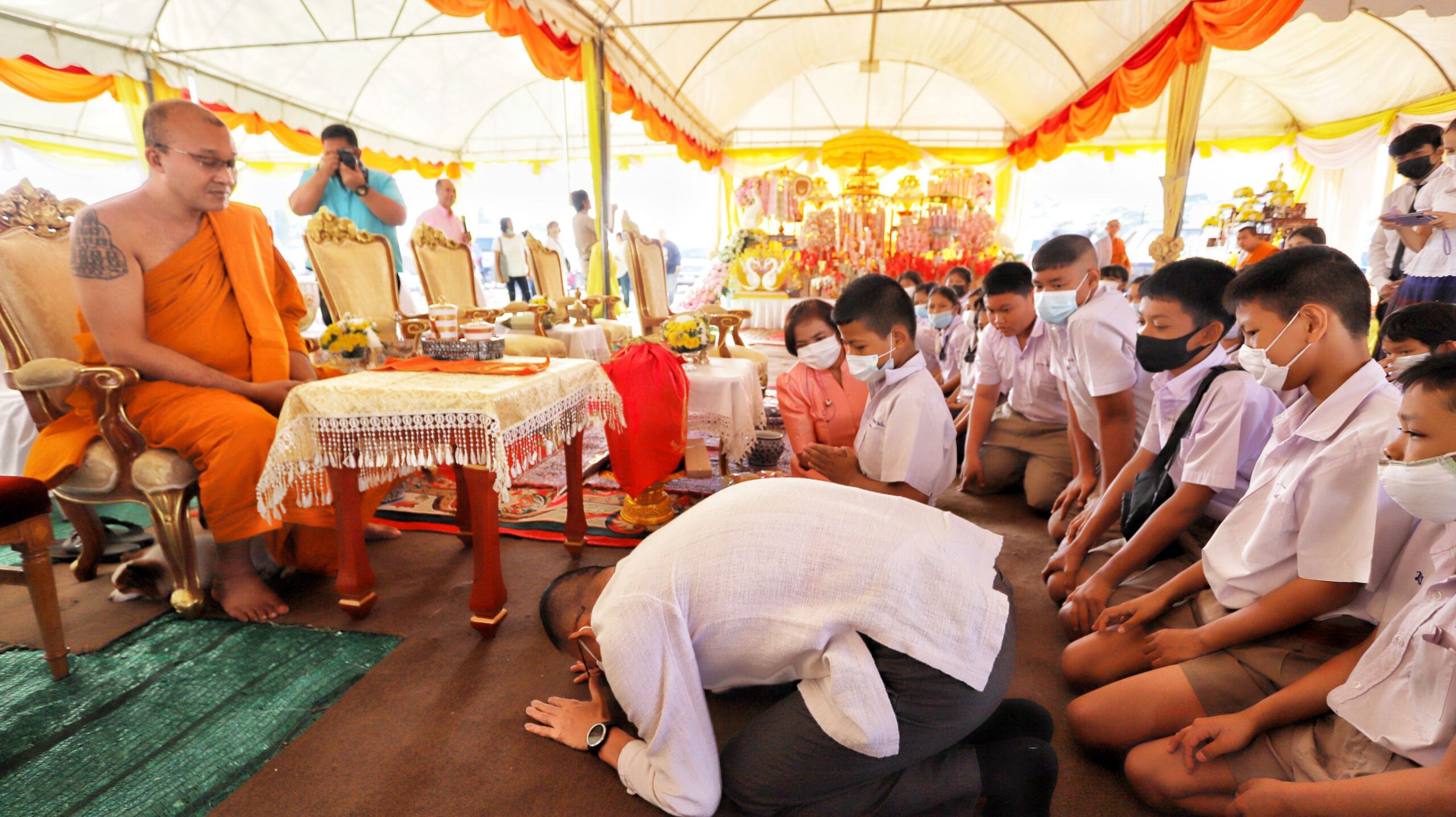 พ่อเมืองปทุมฯมอบอุปกรณ์การเรียนเด็กนักเรียนวัดชินวราราม พร้อมนำสอนการกราบพระแบบเบญจางคประดิษฐ์ ชาวบ้านแห่เซลฟี่ผู้ว่าติดดิน