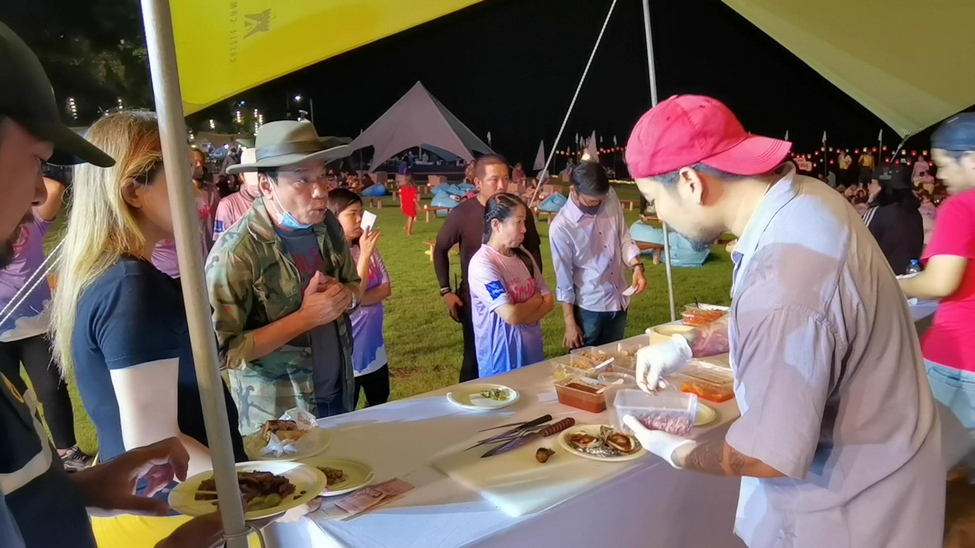 งานนี้ เซเลบริตี้เชฟ “บอส” พัฒนพงษ์ วงศ์วรรณ พร้อมด้วยเชฟชื่อดัง เปิดครัวปรุงอาหารกันแบบสดๆ จัดเมนูเด็ดสไตล์อเมริกัน ที่มาให้นักท่องเที่ยวและผู้ที่มาร่วมงาน ได้ชิมจากฝีมือที่เรียกว่าสุดยอดเชฟ ทุกเมนูเพียงแค่ 100 บาท เมนูแรก บาบีคิวหอยนางรมณ์ย่าง ราดซอสโฮมเมส ซึ่งเป็นสูตรเฉพาะของ เชฟ “บอส” จะให้รสชาติ หวาน เค็ม และเผ็ดนิดๆ เมนูที่ 2 คือ Hotdogไส้อั่ว เป็นการนำไส้อั่ว หรือ ไส้กอกอีสาน มาใส่ในขนมปังปิ้ง ทาด้วยซอสปรุงรสและผักดอง รสชาติจะผสมกันระหว่างไทยอีสานและเอมริกัน ส่วนเมนูที่ 3 คือ Hotdogเสือร้องไห้ เป็นเมนูที่นำเนื้อวัวมาย่างไฟ นำมาหั่นเป็นชิ้นทานคู่กับผักดอง