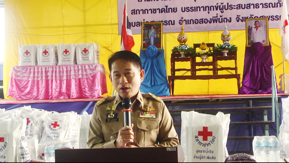 นายณัฐภัทร สุวรรณประทีป ผู้ว่าราชการจังหวัดสุพรรณบุรี กล่าวว่าเป็นที่ทราบกันดีว่า สมเด็จพระนางเจ้าสิริกิตกิติ์ พระบรมราชินีนาถ พระบรมราชนนีพันปีหลวง และสมเด็จพระกนิษฐาธิราชเจ้า กรมสมเด็จพระเทพรัตนราชสุดาฯสยามบรมราชกุมารี ทรงมีความห่วงใยราษฎรผู้มีความทุกข์ยากเดือดร้อนอยู่เสมอโดยจะเห็นได้จากการให้ความช่วยเหลือราษฎรในพื้นที่ต่าง ๆ ทั่วประเทศให้พ้นทุกภัยและอยู่ดีกินดี และในครั้งนี้ได้เกิดอุทกภัยในพื้นที่อำเภอสองพี่น้อง จังหวัดสุพรรณบุรี ราษฎรมีความทุกข์ร้อนในการดำรงชีวิต สภากาชาดไทย โดย สำนักงานบรรเทาทุกข์ และประชนามัยพิทักษ์ จึงได้นำชุดธารน้ำใจ สภากาชาดไทยพร้อมน้ำดื่มบรรจุขวด มามอบให้กับราษฎรที่ได้รับความเดือดร้อนจากอุทกภัยในพื้นที่อำเภอสองพี่น้อง เพื่อบรรเทาความเดือดร้อน ในเบื้องต้นผู้ที่ได้รับชุดธารน้ำใจ สภากาชาดไทยต่างสำนึกและปราบปลื้ม ในพระมหากรุณาธิคุณของสมเด็จพระนางเจ้าสิริกิตกิติ์ พระบรมราชินีนาถ พระบรมราชนนีพันปีหลวง และสมเด็จพระกนิษฐาธิราชเจ้า กรมสมเด็จพระเทพรัตนราชสุดาฯ สยามบรมราชกุมารี อย่างหาที่สุดมิได้และน้อมใจถวายพระพรให้พระองค์ทรงพระเกษมสำราญและทรงพระเจริญยิ่งยืนนาน