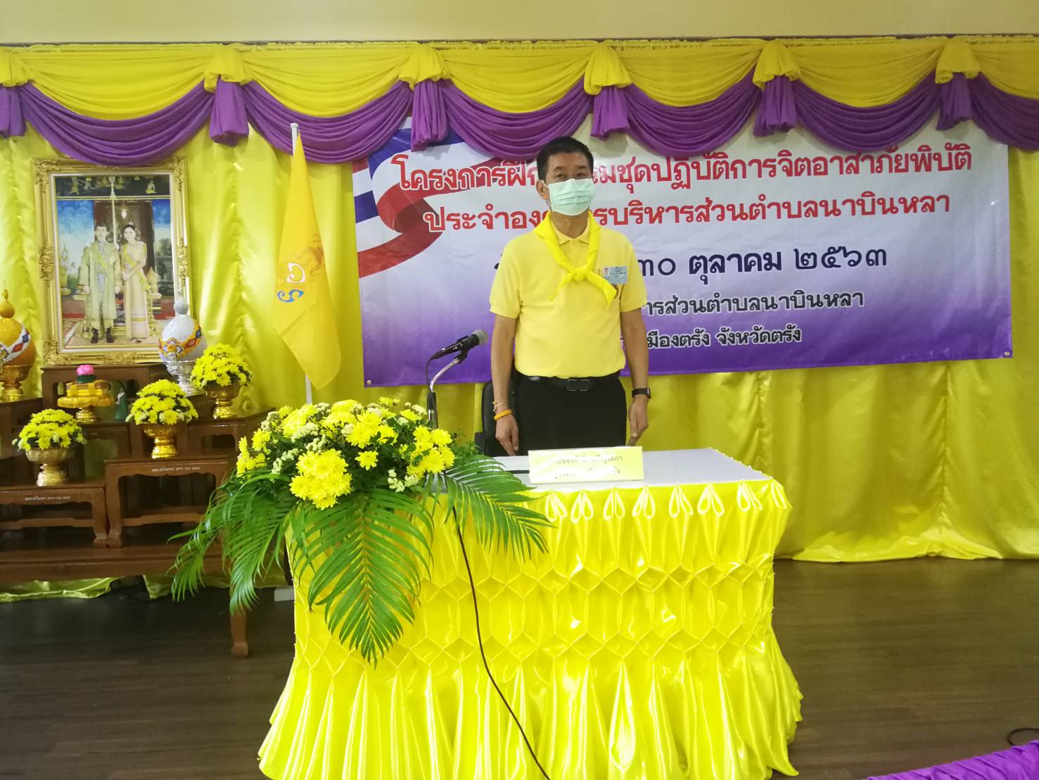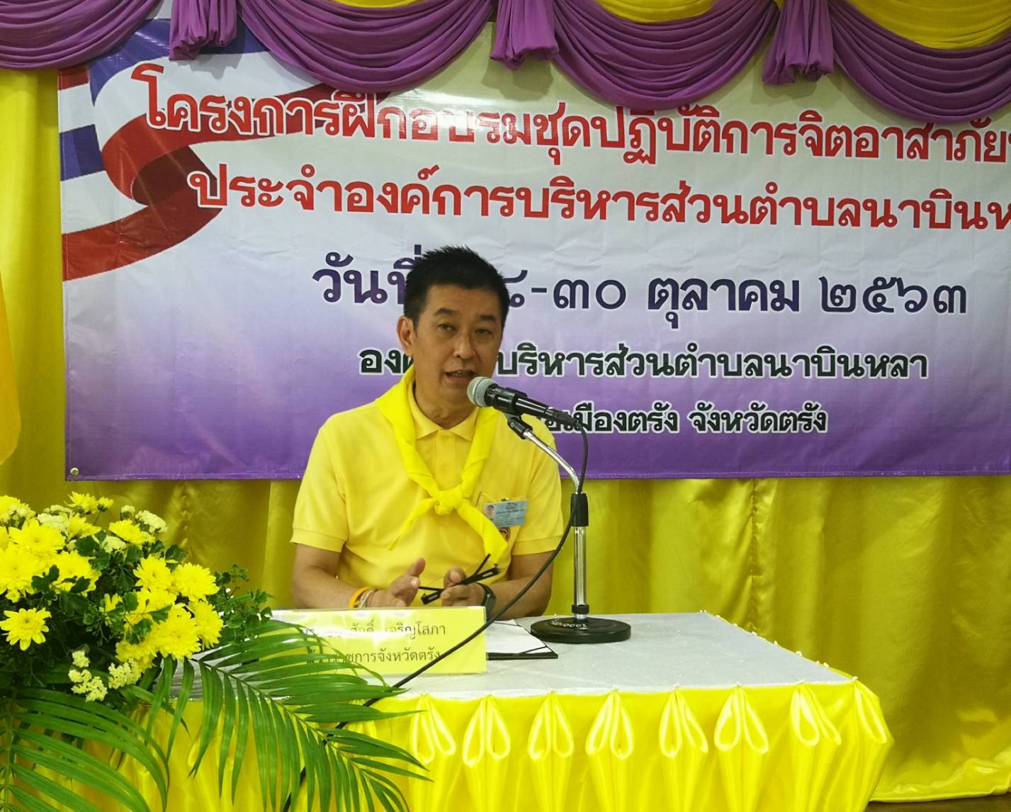 (28 ต.ค.) นายขจรศักดิ์ เจริญโสภา ผู้ว่าราชการจังหวัดตรัง เป็นประธานเปิดโครงการฝึกอบรมชุดปฏิบัติการจิตอาสาภัยพิบัติประจำองค์กรปกครองส่วนท้องถิ่น ณ องค์การบริหารส่วนตำบลนาบินหลา อ.เมืองตรัง