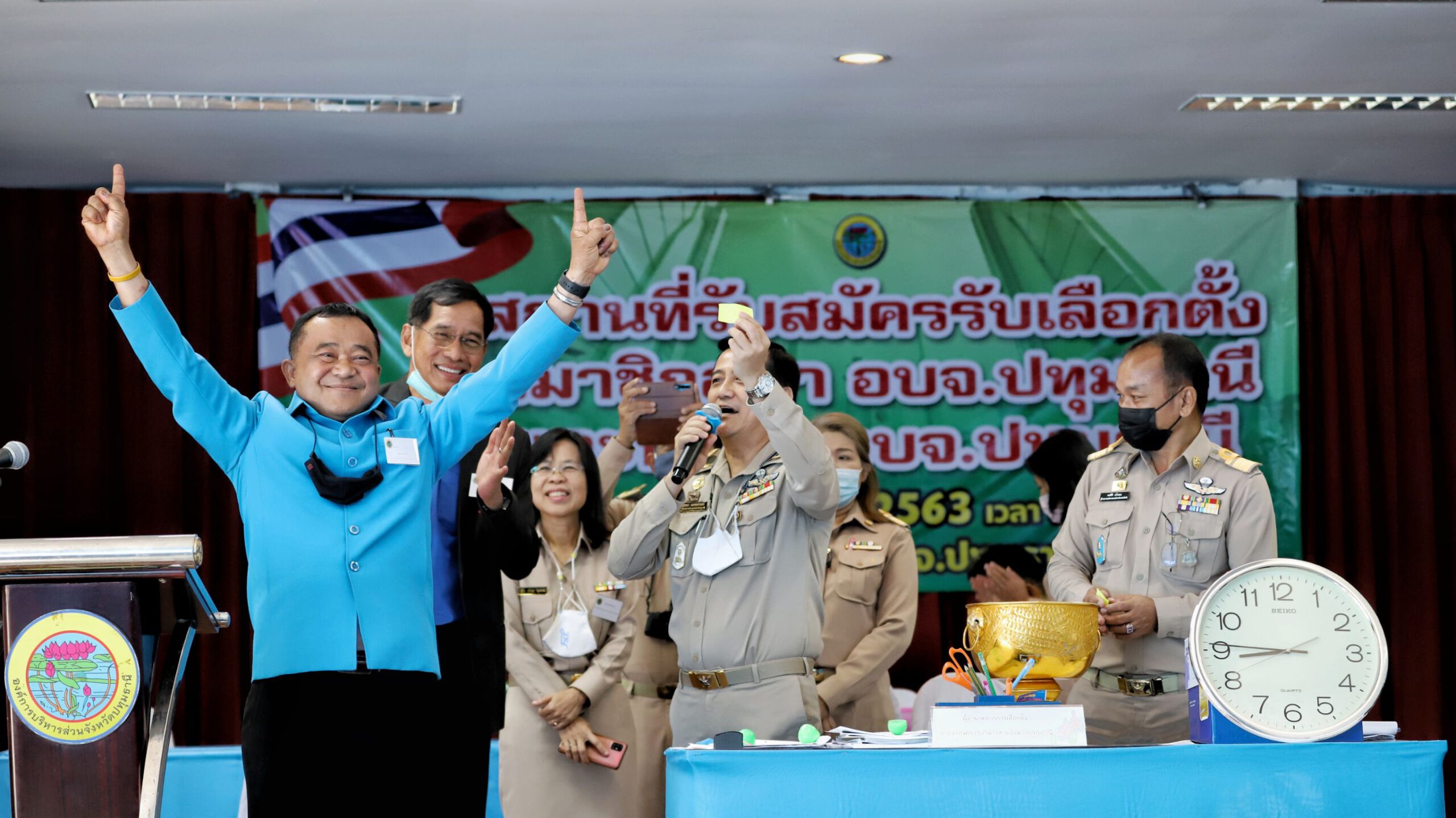 สำหรับในวันนี้มีผู้มาสมัครลงชิงชัยนายกองค์การบริหารส่วนจังหวัดปทุมธานี จำนวน 2 คน คือ นายชาญ พวงเพชร์ อดีตนายกองค์การบริหารส่วนจังหวัดปทุมธานี 3 สมัย และพล ต.ท.คำรณวิทย์ ธูปกระจ่าง อดีตผู้บัญาการตำรวจนครบาล แต่ทั้ง 2 คนไม่สามารถตกลงกันได้ จึงต้องมีการจับสลาก 2 ครั้ง ครั้งแรกจับว่าใครจะได้จับสลากเป็นคนแรก และครั้งที่ 2 เป็นการจับสลากว่าใครจะได้ยื่นใบสมัครก่อนและใช้ลำดับการยื่นใบสมัครเป็นหมายเลขในการหาเสียงโดย นายชาญ พวงเพชร์ ได้หมายเลข 1 ส่วน พล.ต.ท.คำรณวิทย์ จับได้หมายเลข 2 ภายหลังรู้หมายเลขแล้ว บรรดากองเชียร์ที่มารอด้านนอกต่างส่งเสียงเชียร์ให้กำลังใจกันอย่างสนุกสนาน โดยทั้งคู่ต่างมั่นใจคว้าชัยเลือกตั้งในครั้งนี้