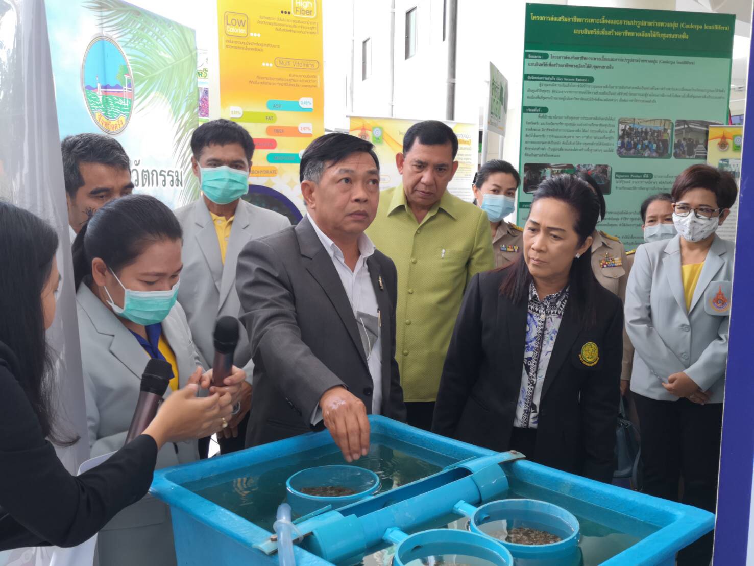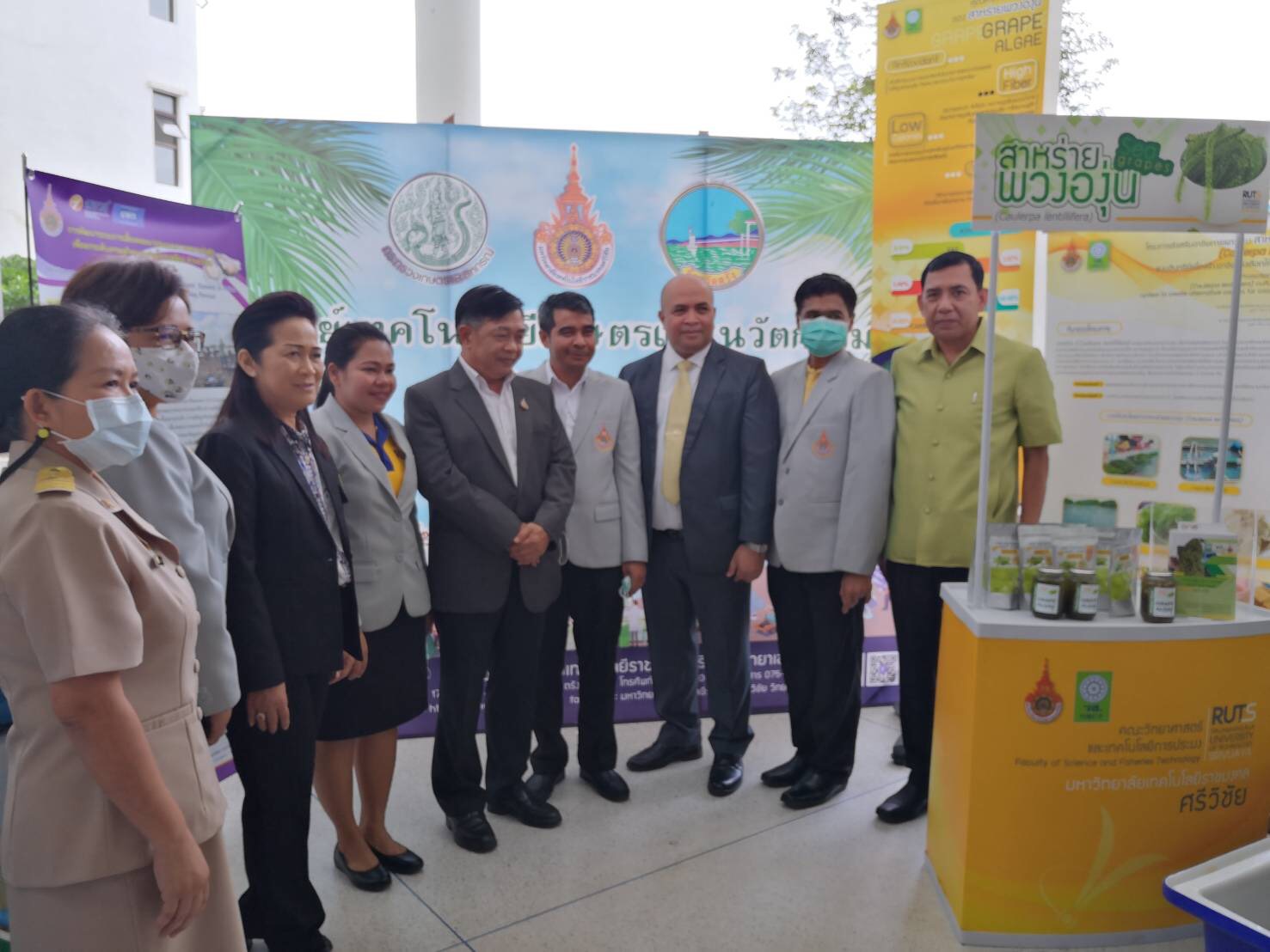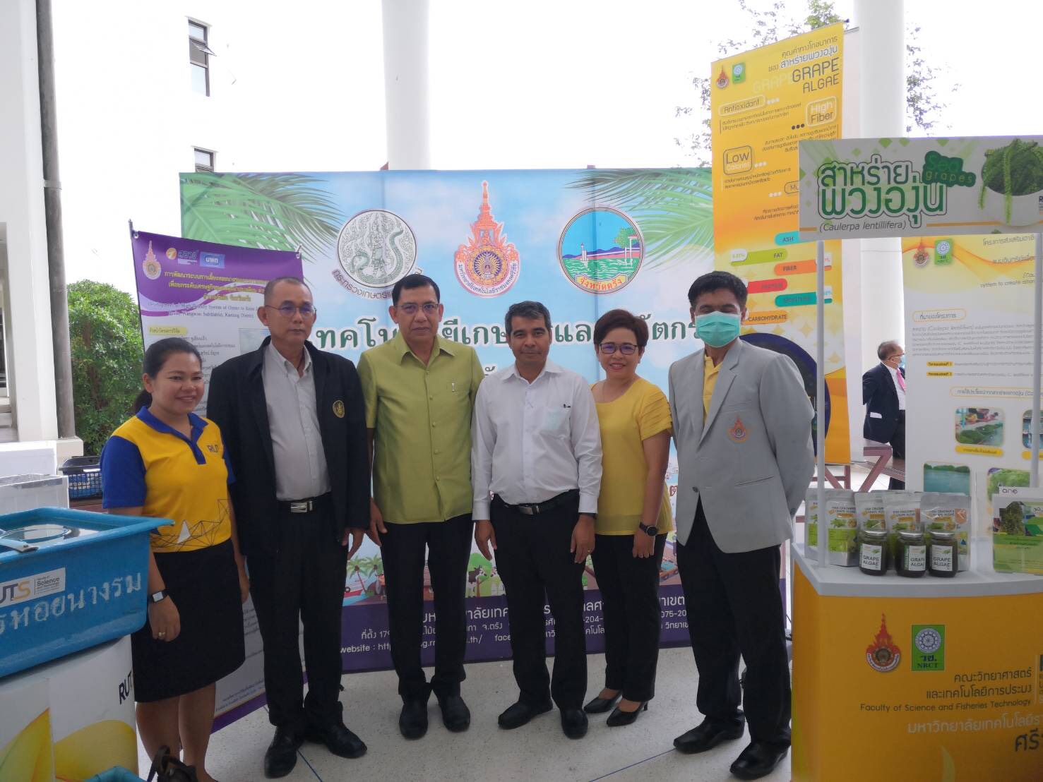 อธิการบดี มหาวิทยาลัยเทคโนโลยีราชมงคลศรีวิชัย ได้มอบหมายคณบดีคณะวิทยาศาสตร์และเทคโนโลยีการประมง ผศ.ดร.ประเสริฐ ทองหนูนุ้ย ในฐานะผู้อำนวยการศูนย์เทคโนโลยีเกษตรและนวัตกรรม (Agritech and Innovation Center : AIC) จังหวัดตรัง พร้อมด้วย ผศ.ดร.วรพร ธารางกูร ผศ. มาโนช ขำเจริญ และ ดร.สุพัชชา ชูเสียงแจ้ว ร่วมจัดนิทรรศการเรื่องผลผลิตหอยนางรมจากโรงเพาะฟักสู่เกษตรกร และเรื่องการเลี้ยงสาหร่ายพวงองุ่นแบบอินทรีย์เพื่อสร้างอาชีพเสริมให้กับชุมชนชายฝั่งจังหวัดตรัง