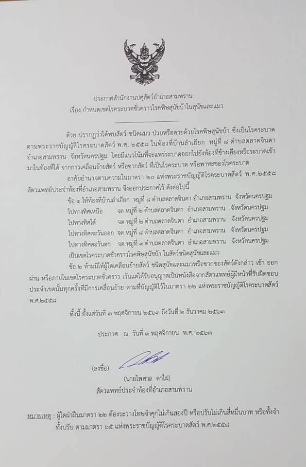 ซึ่ง นาย ประมวล โฆษิตชัยมงคล สาธารณสุขอำเภอสามพราน ได้กล่าวถึงการที่พบแมวป่วยหรือตายด้วยโรคพิษสุนัขบ้า ซึ่งเป็นโรคระบาดตามพระราชบัญญัติโรคระบาดสัตว์ 2558 ในท้องที่บ้านลำเอียก หมู่ที่ 8 ตำบลตลาดจินดา อำเภอสามพราน จังหวัดนครปฐม ซึ่งมีแนวโน้มที่จะแพร่ระบาดไปยังท้องที่ข้างเคียงและพื้นที่อื่นๆ จากการเคลื่อนย้ายสัตว์ หรือซากสัตว์ ที่เป็นโรคระบาด หรือเป็นพาหะของโรคระบาด