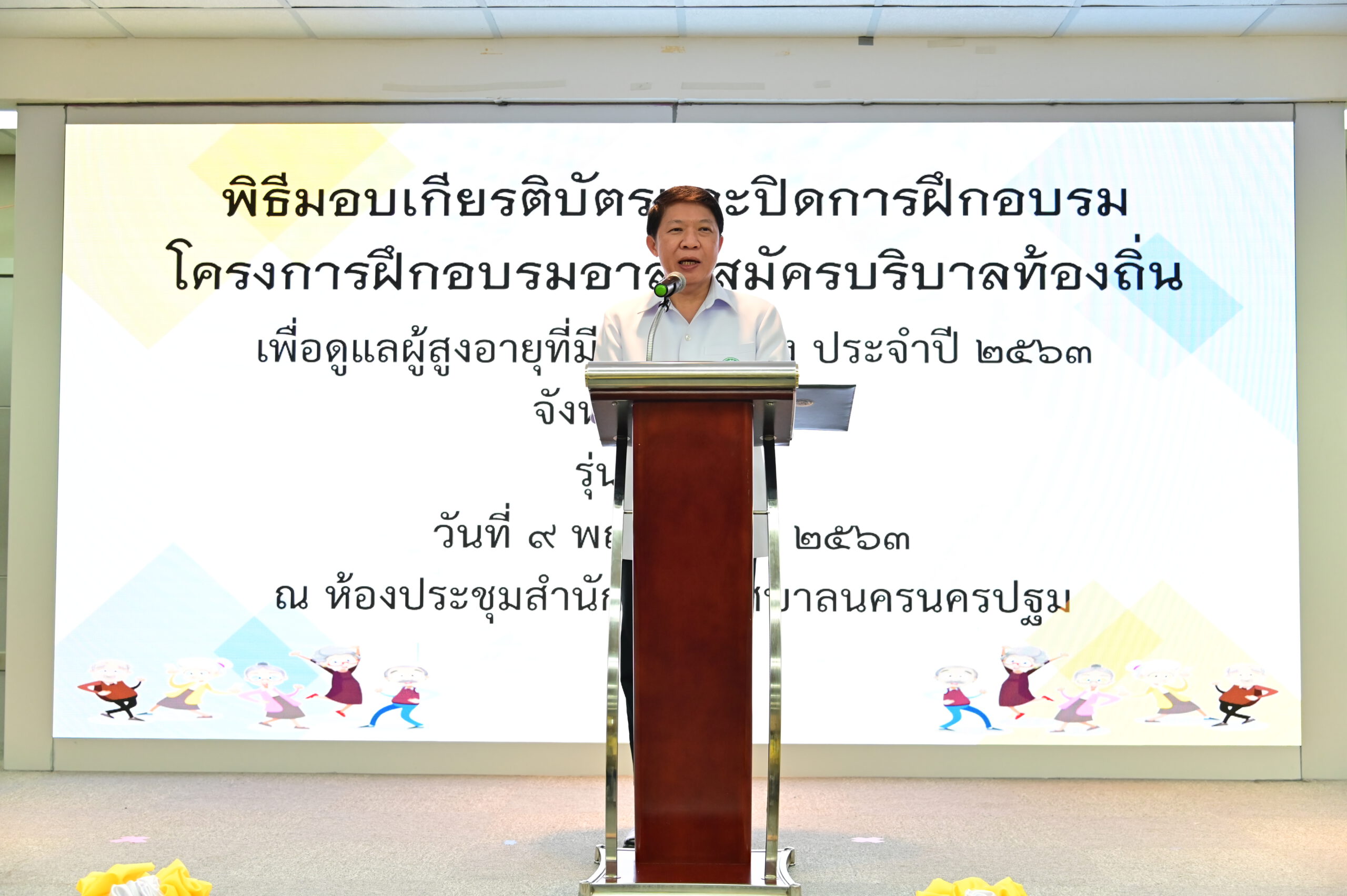 วันที่9 พฤศจิกายน 2563 เวลา 10.00 น. ณ ห้องประชุมชั้น 3 สำนักงานเทศบาลนครนครปฐม จังหวัดนครปฐม นายประยูร รัตนเสนีย์ อธิบดีกรมส่งเสริมการปกครองท้องถิ่น ร่วมกับ น.พ.สุวรรณชัย วัฒนายิ่งเจริญชัย อธิบดีกรมอนามัย เป็นประธานในพิธีมอบเกียรติบัตรให้แก่ผู้ผ่านการฝึกอบรมในโครงการอาสาสมัครบริบาลท้องถิ่น เพื่อดูแลผู้สูงอายุที่มีภาวะพึ่งพิง ประจำปี พ.ศ. 2563 รุ่นที่ 1 – 4 ของจังหวัดนครปฐม และมี นายขจร ศรีชวโนทัย รองอธิบดีกรมส่งเสริมการปกครองท้องถิ่น นายธีระยุทธ สำราญทรัพย์ ผู้ตรวจราชการกรม หัวหน้าส่วนราชการในจังหวัดนครปฐม นายกองค์กรปกครองส่วนท้องถิ่นในพื้นที่ ร่วมเป็นเกียรติในพิธี โดยมีนายหมวดเอกเอกพันธุ์ คุปตวัช นายกเทศมนตรีนครนครปฐม กล่าวรายงาน