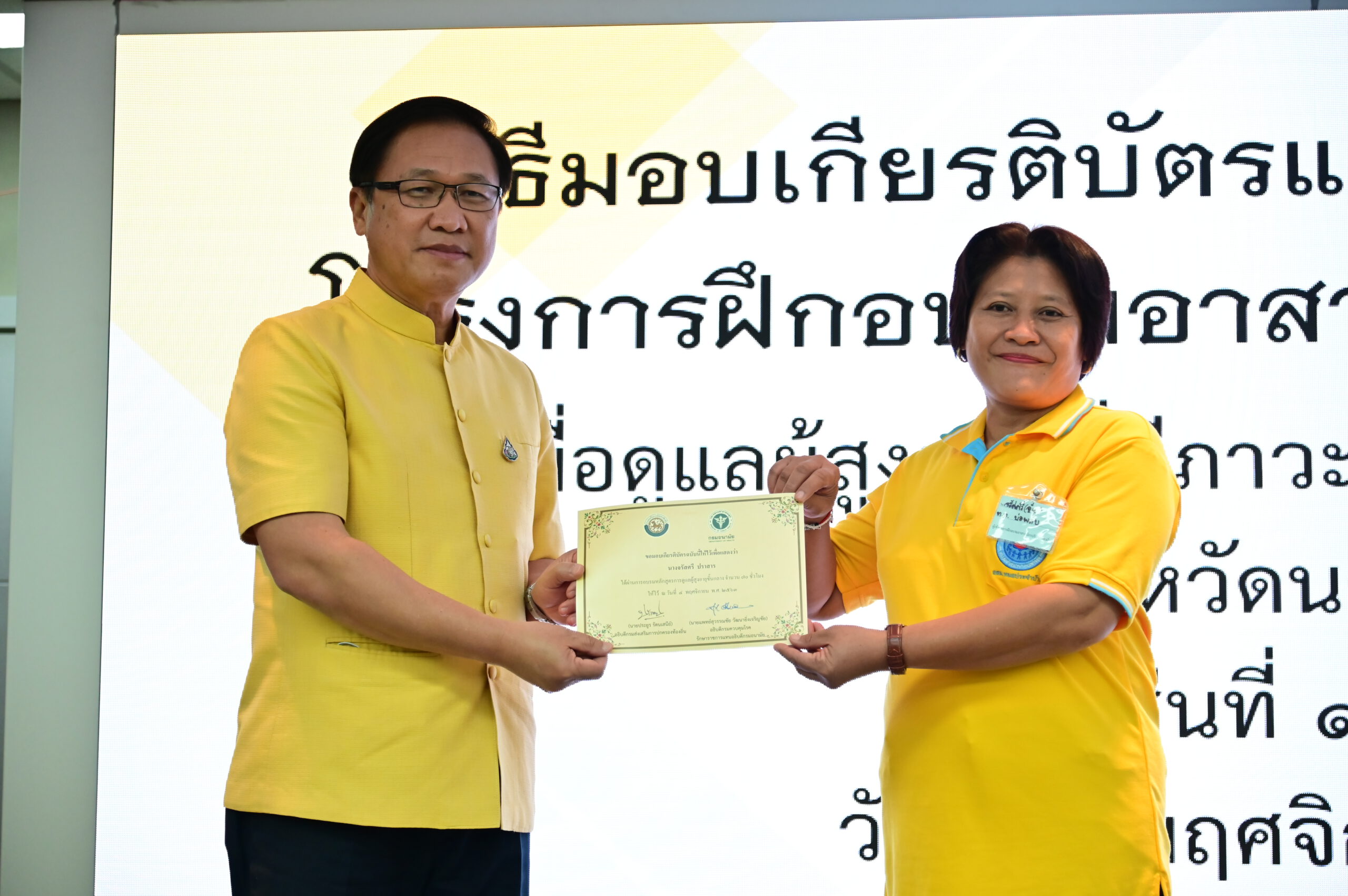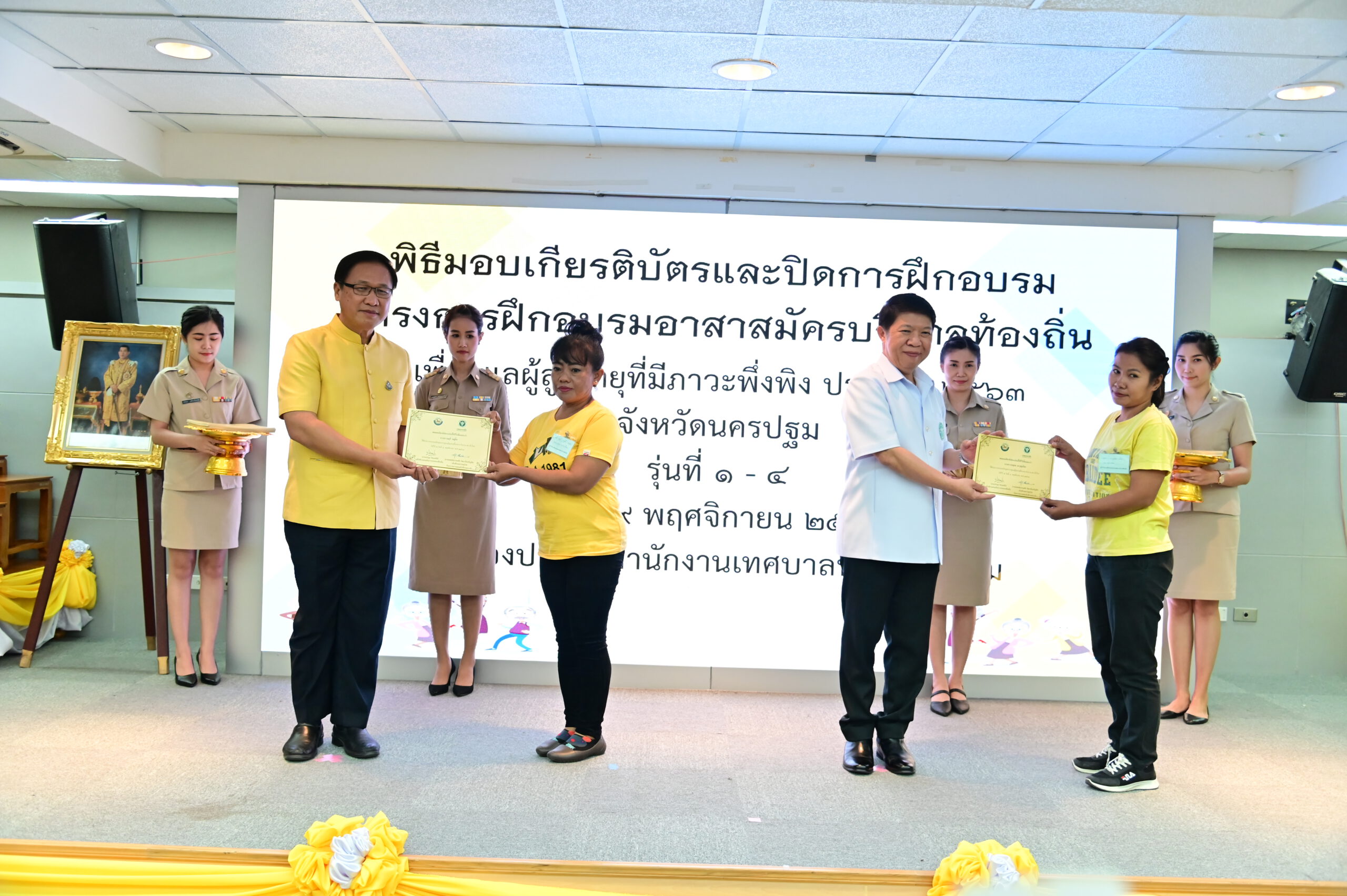 อธิบดี สถ. และอธิบดีกรมอนามัย ได้รับชมการนำเสนอผลงานของผู้ผ่านการฝึกอบรมอาสาสมัครบริบาลท้องถิ่นฯ รุ่นที่ 1 – 4 ของจังหวัดนครปฐม ซึ่งได้นำเสนอองค์ความรู้ และตัวอย่างกิจกรรม จากหลักสูตรผู้ดูแลผู้สูงอายุ (Caregiver) จำนวน 70 ชั่วโมงของกรมอนามัย อาทิ การดูแลปฏิบัติกิจวัตรประจำวันของผู้สูงอายุที่มีภาวะพึ่งพิง การอาบน้ำ การทำความสะอาดร่างกาย การแต่งตัว การรับประทานอาหาร การดูแลตามแผนการดูแลรายบุคคล การดูแลด้านสุขภาพพื้นฐาน การฟื้นฟูสมรรถภาพ การกายภาพบำบัด ไปจนถึงสันทนาการ หลังจากนั้นได้ร่วมกันมอบเกียรติบัตรให้กับผู้ผ่านการฝึกอบรมในโครงการอาสาสมัครบริบาลท้องถิ่น ฯ จำนวน 205 คน จากองค์กรปกครองส่วนท้องถิ่นจำนวน 105 แห่งในพื้นที่จังหวัดนครปฐม