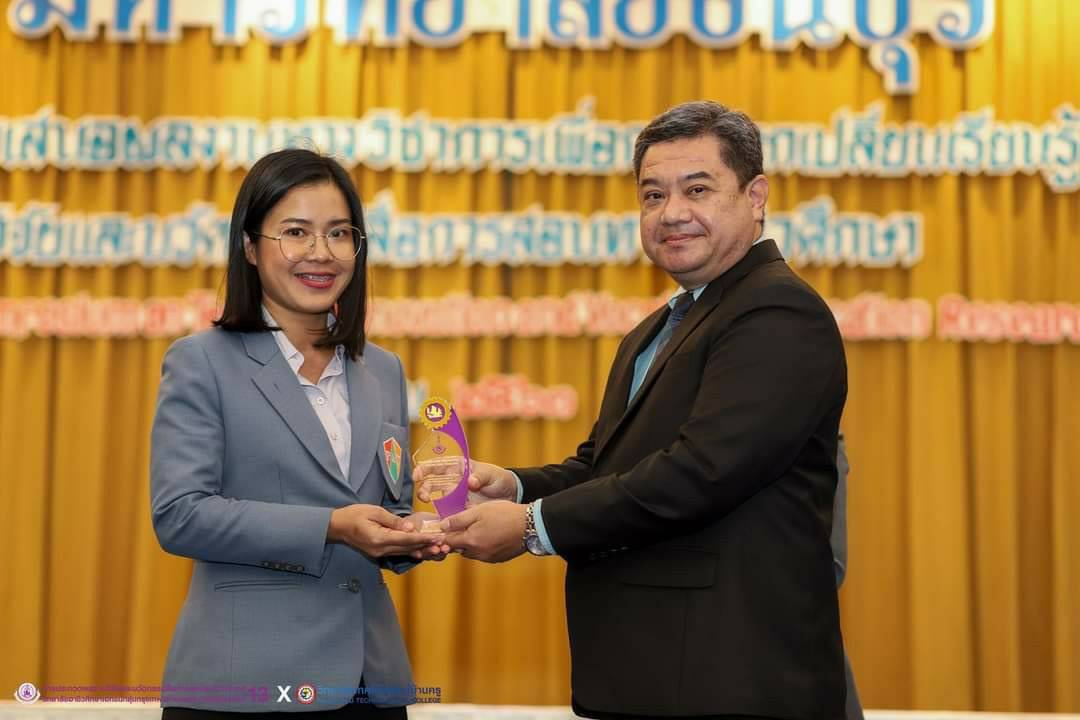 โอกาสนี้ ว่าที่ ร.ต.วรเชษฐ์ ธรรมวงศ์ ผู้อำนวยการสำนักวิชาการ วิทยาลัยเทคโนโลยีปัญญาภิวัฒน์ ได้นำคณะครูร่วมเสนอผลงานทางวิชาการ โดยเปิดเผยว่าวิทยาลัยฯให้ความสำคัญต่อการพัฒนาศักยภาพของครูผู้สอนมาอย่างต่อเนื่องเพื่อให้ครูมีวิสัยทัศน์ มีการพัฒนาตนเองคิดค้นงานวิจัยและนวัตกรรมสื่อสารการสอนทางอาชีวศึกษา และเพิ่มประสิทธิภาพ ประสิทธิผลในระบบการเรียนการสอนโดยในปีนี้วิทยาลัยฯส่งผลงานนำเสนอได้รับรางวัลทั้งสิ้น 60 ผลงาน เป็นรางวัลผลงานวิจัยประเภทสื่อคอมพิวเตอร์ ระดับดีเยี่ยม 1ผลงานคือ การพัฒนาบทเรียนออนไลน์เรื่อง สารสังเคราะห์และผลิตภัณฑ์ผ่านแอปพลิเคชั่น Nearpod สำหรับนักศึกษาระดับประกาศนียบัตรวิชาชีพชั้นสูง ปีที่1/2 ผลงานโดย น.ส.นฤมล บุญส่ง ครูผู้สอนรายวิชาวิทยาศาสตร์ ส่วนรางวัลอื่นๆประกอบด้วยรางวัลระดับดีมาก จำนวน 19ผลงาน , ระดับดี จำนวน 24ผลงาน , ระดับผ่าน จำนวน 16ผลงาน และยังได้รับโล่รางวัลการนำเสนอยอดเยี่ยมอีก 4 ผลงาน .