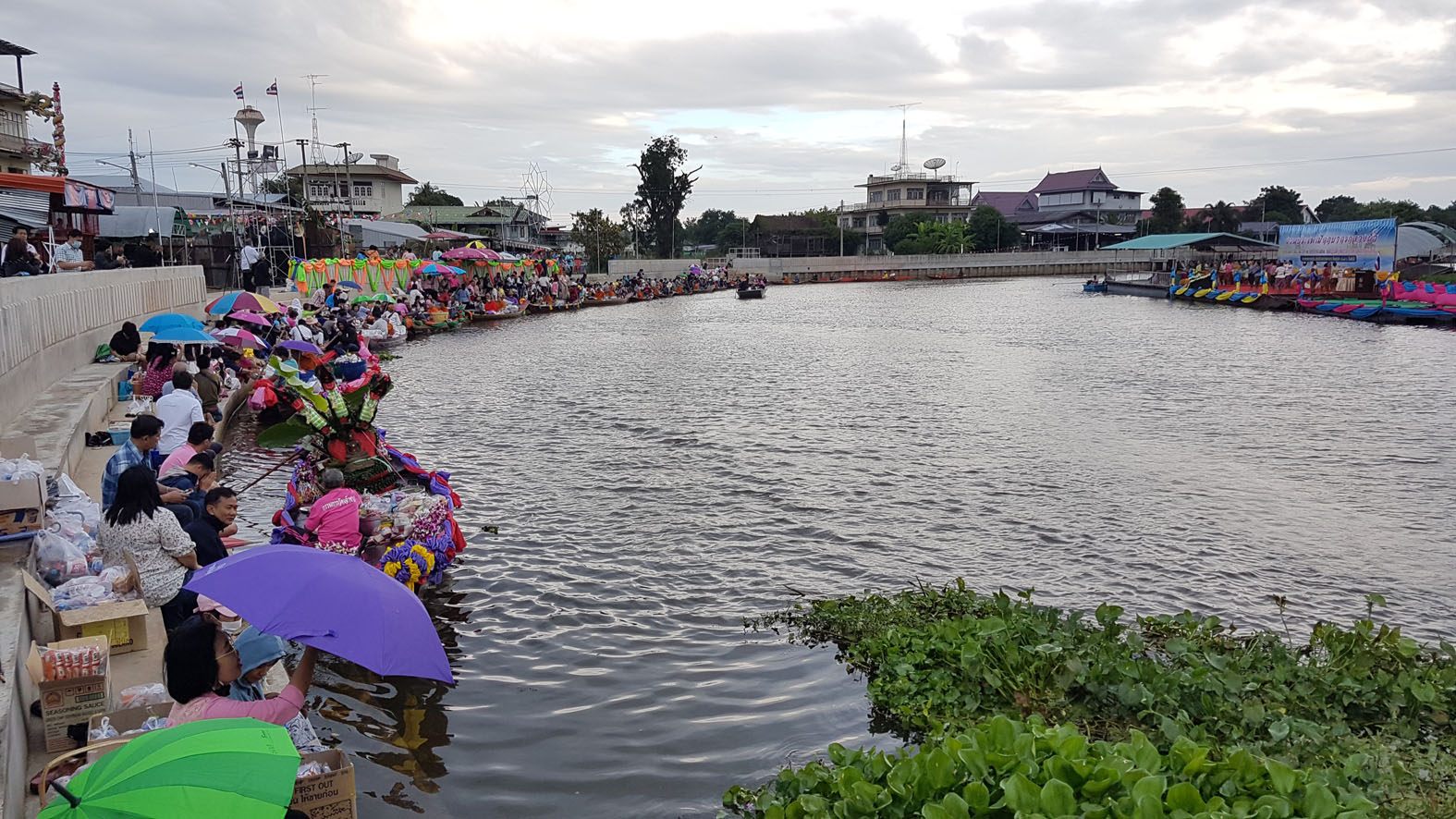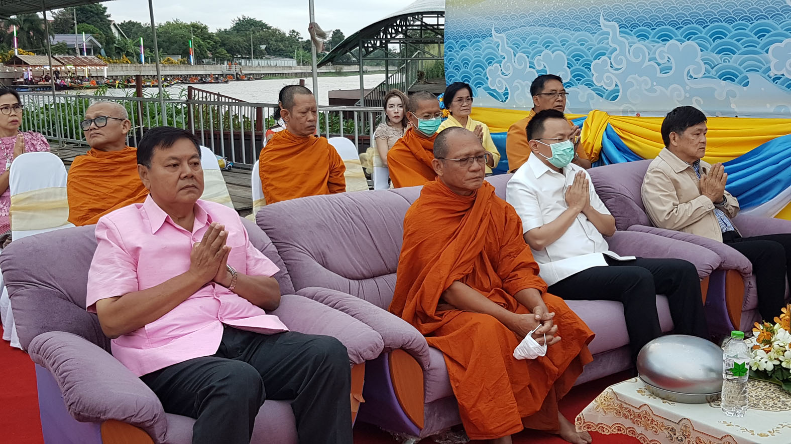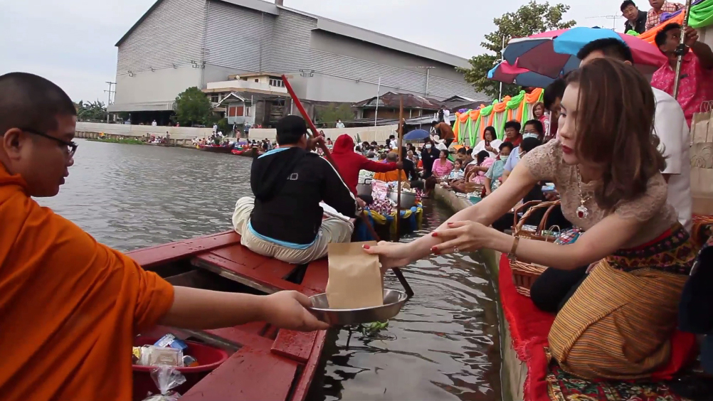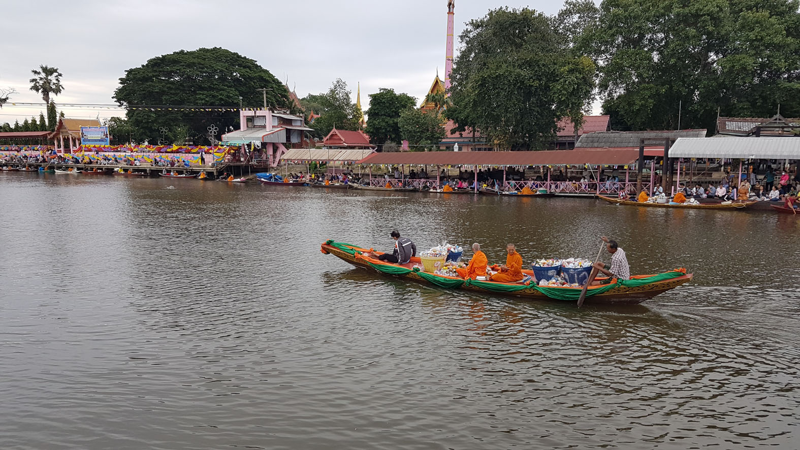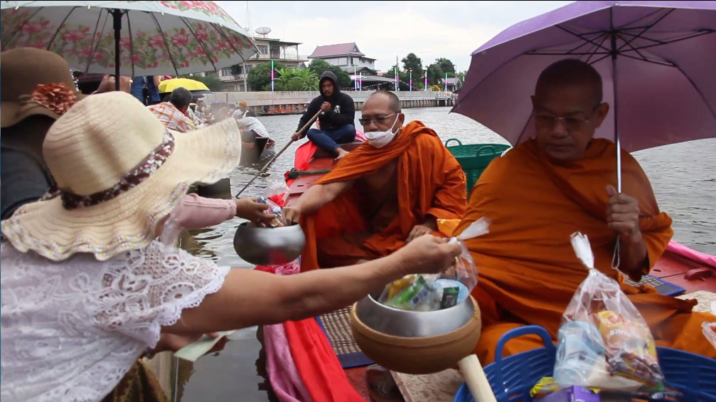 ซึ่งพระภิกษุสงฆ์สามเณร จากวัดที่อยู่ริมสองฝั่งแม่น้ำท่าจีน จำนวน 31 วัด กว่า 100 รูป พายเรือออกรับบิณฑบาต ชาวบ้านสองฝั่งแม่น้ำท่าจีนที่นำข้าวสารอาหารแห้งอาหารคาวหวานและน้ำดื่มมาใส่บาตรพระสงฆ์ ในงานได้มีการรณรงค์ให้ประชาชนและนักท่องเที่ยวแต่งกายชุดด้วยไทยย้อนยุค สวมใส่ผ้าไทยโบราณหรือชุดตามประเพณีนิยมสมัยโบราณ โดยมีผู้นำองค์กรปกครองส่วนท้องถิ่น กำนัน ผู้ใหญ่บ้าน ประชาชนและนักท่องเที่ยว ร่วมพิธีตักบาตรกลางน้ำกันอย่างคึกคัก