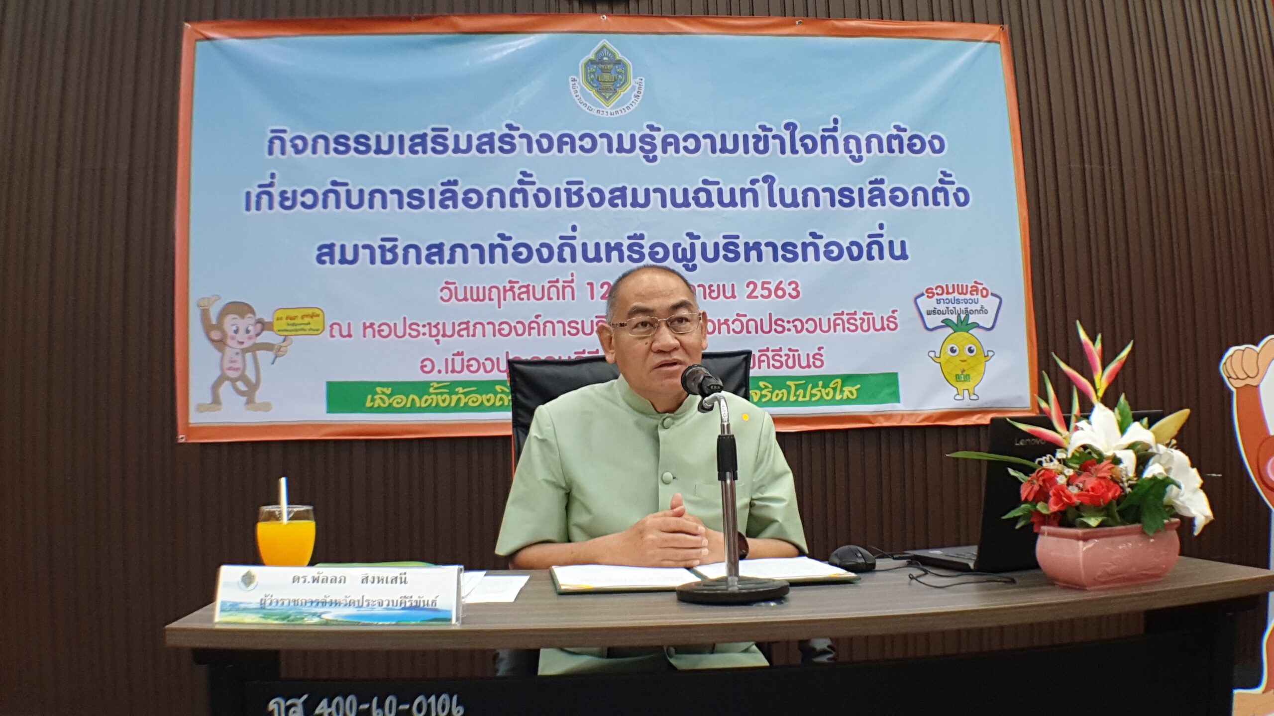 วันที่ 12 พฤศจิกายน 2563 ที่หอประชุมสภาองค์การบริหารส่วนจังหวัด ( อบจ.)ประจวบคีรีขันธ์ อ.เมือง จ.ประจวบคีรีขันธ์ ดร.พัลลภ สิงหเสนี ผู้ว่าราชการจังหวัดประจวบคีรีขันธ์ เป็นประธานในพิธีเปิดกิจกรรมเสริมสร้างความรู้ความเข้าใจที่ถูกต้องเกี่ยวกับการเลือกตั้งเชิงสมานฉันท์ ในการเลือกตั้งสมาชิกสภาท้องถิ่นหรือผู้บริหารท้องถิ่น โดยมี น.ส.ณากัญ กัณห์อุไร ผู้อำนวยการสำนักงานคณะกรรมการการเลือกตั้ง (กกต.)ประจำ จ.ประจวบฯ กล่าวรายงาน มี นายกิตติพงศ์ สุขภาคกุล ปลัดจังหวัดประจวบฯ ในฐานะประธานกรรมการการเลือกตั้งประจำ อบจ.ประจวบฯ คณะกรรมการการเลือกตั้งประจำ อบจ.ประจวบฯ ผู้ตรวจการเลือกตั้งประจำจังหวัดประจวบฯ เข้าร่วม