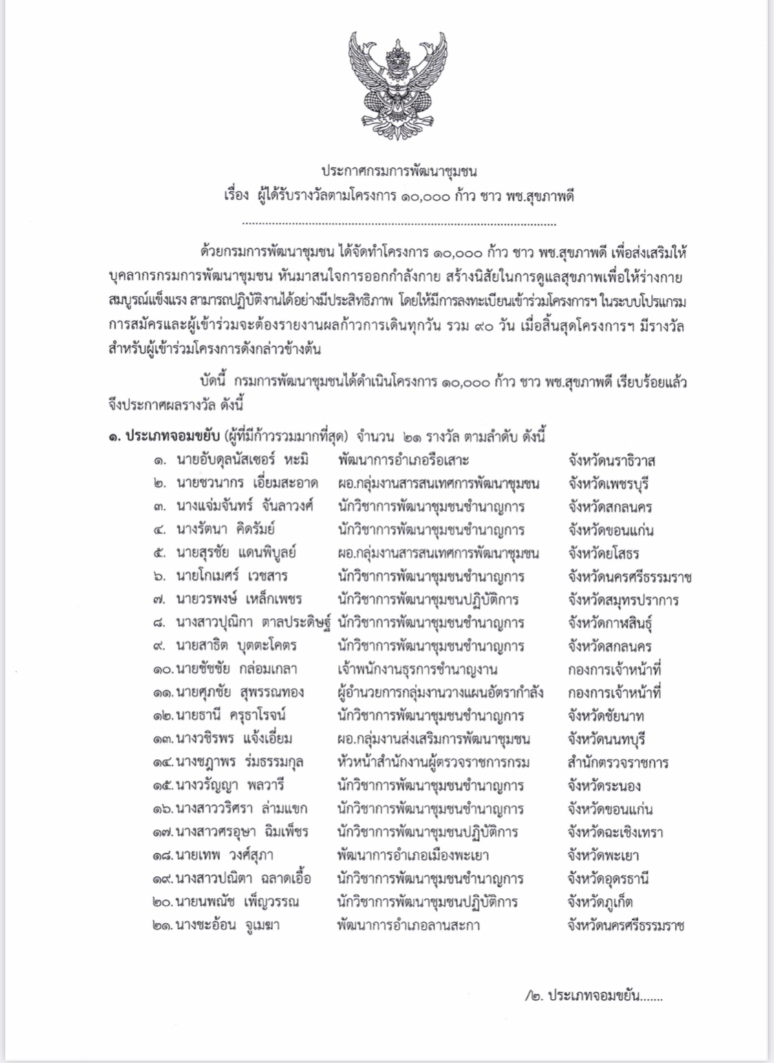อธิบดี พช.ปลื้มโครงการ “10,000 ก้าว ชาว พช. สุขภาพดี” สำเร็จตามเป้าหมาย กระตุ้นบุคลากร พช.หันมาออกกำลังกายเพื่อให้การปฏิบัติงาน “บำบัดทุกข์ บำรุงสุข” ประชาชนมีประสิทธิภาพ พร้อมแจกเงินรางวัล 57 รางวัลและเกียรติบัตรเชิดชูความตั้งใจ