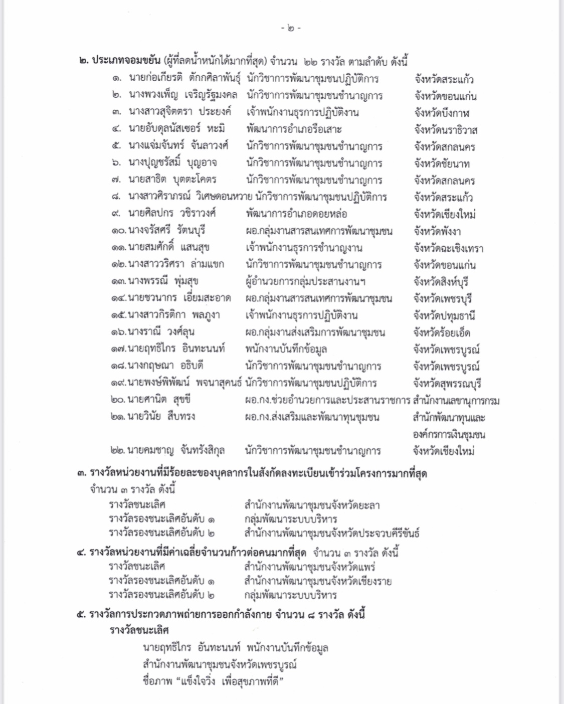 ส่วนประเภทรางวัลการประกวดภาพถ่ายการออกกำลังกาย จำนวน 8 รางวัล ผู้ได้รับรางวัลชนะเลิศ คือ นายฤทธิไกร อันทะนนท์ พนักงานบันทึกข้อมูล สำนักงานพัฒนาชุมชนจังหวัดเพชรบูรณ์ ชื่อภาพ “แข็งใจวิ่ง เพื่อสุขภาพที่ดี” ได้รับเงินรางวัล 2,000 บาท พร้อมเกียรติบัตร ส่วนรางวัลรองชนะเลิศอันดับ 1 คือนายพรหมมินทร์ โชติงาม เจ้าพนักงานพัฒนาชุมชนชำนาญงาน สำนักงานพัฒนาชุมชนอำเภอหันคา จังหวัดชัยนาท ชื่อภาพ “กล้าที่ก้าว ก้าวที่เลือก” ได้รับเงินรางวัล 1,500 บาท พร้อมเกียรติบัตร ส่วนรางวัลรองชนะเลิศ อันดับ 2 คือ นางสาวกิรติการต์ ขยายแก้ว นักวิชาการพัฒนาชุมชนชำนาญการ กลุ่มพัฒนาระบบบริหาร ชื่อภาพ “ฉันไม่ได้กำลังลดความอ้วน ฉันแค่กำลังเปลี่ยนชีวิตให้ดีขึ้น” ได้รับเงินรางวัล 1,000 บาท พร้อมเกียรติบัตร และมีรางวัลชมเชยอีก 5 รางวัล รับเงินรางวัลคนละ 500 บาท