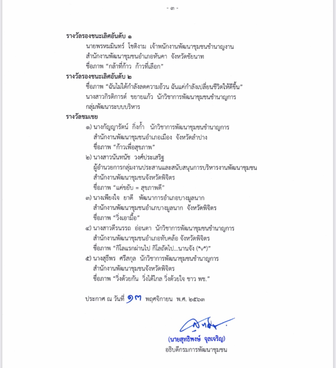 วันที่ 16 พฤศจิกายน 2563 นายสุทธิพงษ์ จุลเจริญ อธิบดีกรมการพัฒนาชุมชน เปิดเผยว่าตามที่กรมการพัฒนาชุมชนได้จัดทำ “โครงการ 10,000 ก้าว ชาว พช. สุขภาพดี” ช่วงระหว่างเดือนมิถุนายน – ตุลาคม 2563 โดยมีกลุ่มเป้าหมายประกอบด้วยบุคลากรกรมการพัฒนาชุมชนทั้งส่วนกลางและส่วนภูมิภาคทุกคน เพื่อส่งเสริมให้บุคลากรหันมาสนใจการออกกำลังกาย สร้างนิสัยในการดูแลสุขภาพเพื่อให้ร่างกายสมบูรณ์แข็งแรง สามารถปฏิบัติงานได้อย่างมีประสิทธิภาพ ซึ่งผู้เข้าร่วมโครงการฯ ต้องรายงานผลก้าวการเดินทุกวันรวม 90 วัน โดยผลการดำเนินโครงการฯ สำเร็จเป็นไปตามเป้าหมาย มีผู้ลงทะเบียนเข้าร่วมโครงการฯ ทั้งหมด จำนวน 3,134 คน มีผู้รายงานผลการเดิน 1,453 คน ผู้รายงานน้ำหนัก จำนวน 180 คน และมีน้ำหนักลดลง จำนวน 140 คน คิดเป็นร้อยละ 77.77 โดยคณะทำงานฯ ได้ตัดสินและมีมติเห็นชอบแจกรางวัลทั้งสิ้น จำนวน 57 รางวัล