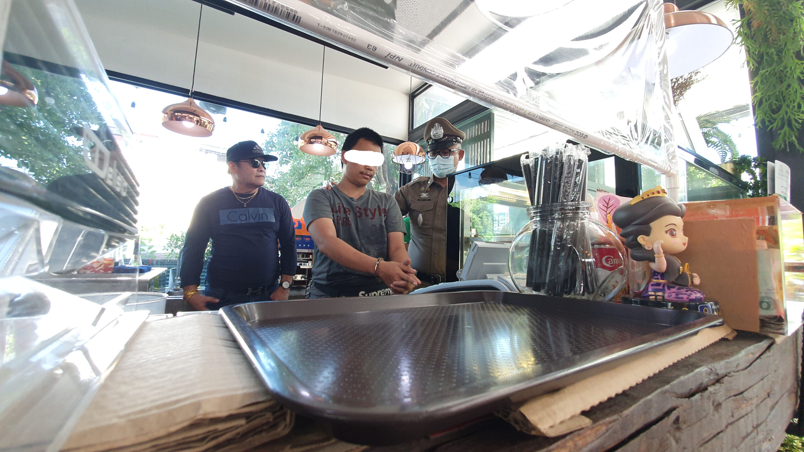 *****สืบเนื่องจาก เจ้าหน้าที่ตำรวจชุดจับกุมได้รับแจ้งว่าร้านกาแฟมอนสเตอร์ ภายในตลาดนัดลุงโป๊ะ ถนนบัวนครินทร์ ตำบลบางแก้ว อำเภอบางพลี จังหวัดสมุทรปราการ ได้มีคนร้ายสวมหมวกนิรภัย ขี่จักรยานยนต์มาจอดไว้ใกล้ร้าน เข้ามาก่อเหตุทุบกระจกร้านกาแฟดังกล่าว และลักทรัพย์สินภายในร้านไป จากการตรวจสอบจากกล้องวงจรปิดพบคนร้าย มีลักษณะคล้ายกับที่เคยก่อเหตุมาแล้วหลายครั้ง เจ้าหน้าที่ชุดสืบสวนจึงสืบสวนติดตาม จนทราบว่าคนร้ายที่ก่อเหตุมาพักอาศัยที่ คอนโดแห่งหนึ่ง หมู่ที่ 7 ซอยวัดศรีวารีน้อย ตำบลบางโฉลง อำเภอบางพลี จังหวัดสมุทรปราการ จึงเข้าจับกุมตัวได้พร้อมของกลาง นำตัวมาสอบสวนที่ สภ.บางแก้ว และนำตัวไปทำแผนประกอบคำรับสารภาพ