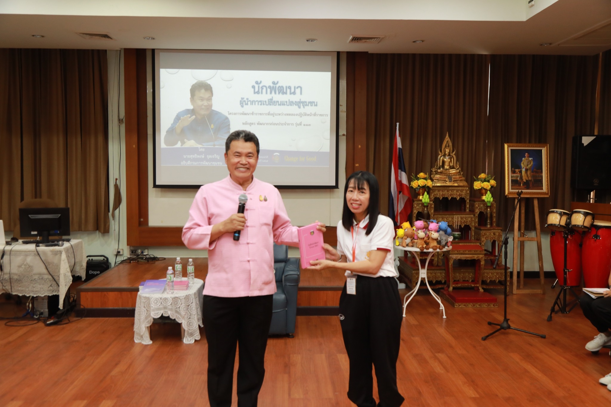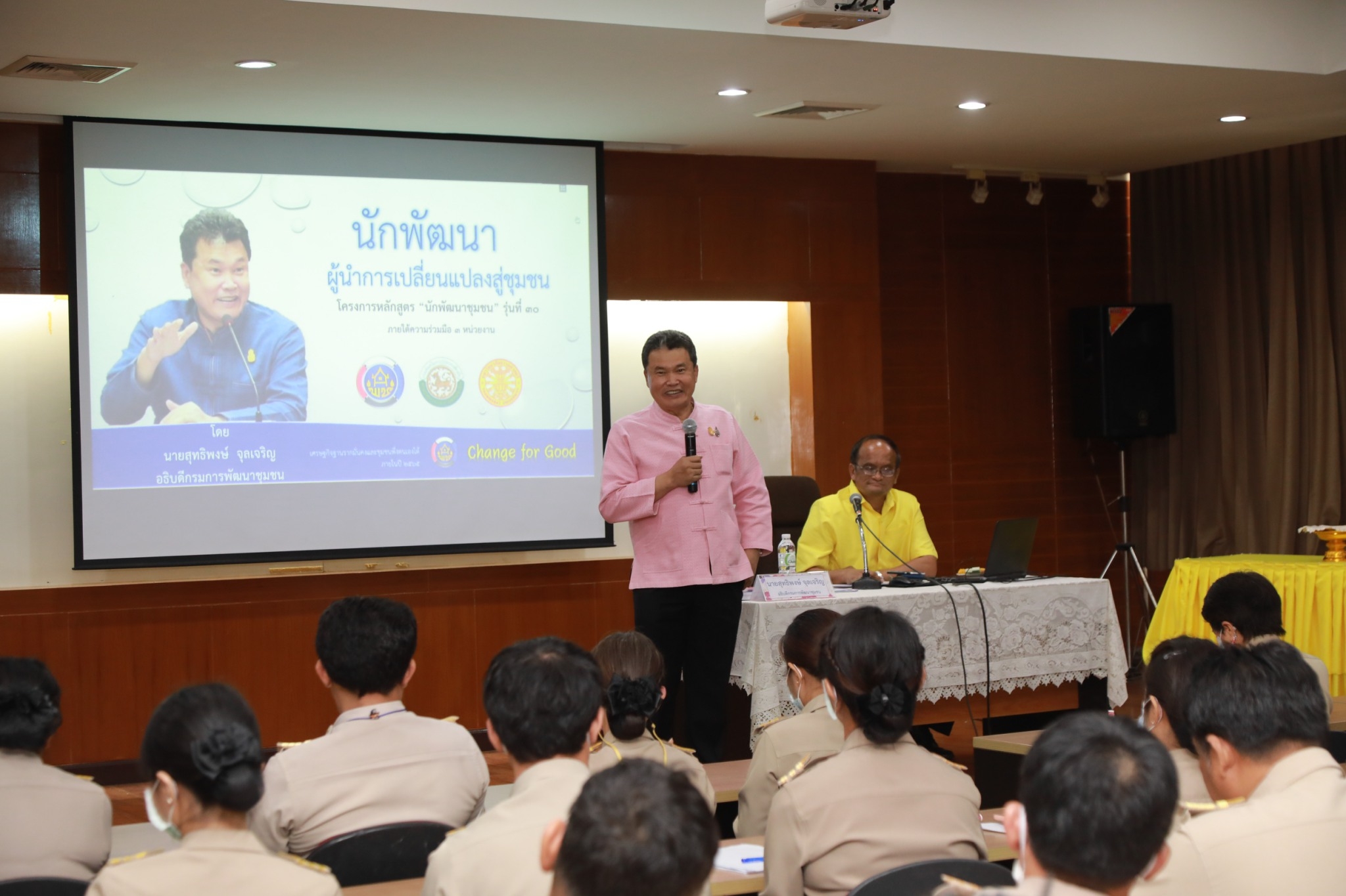 นายสุทธิพงษ์ จุลเจริญ อธิบดีกรมการพัฒนาชุมชน กระทรวงมหาดไทย บรรยายพิเศษในหัวข้อ “นักพัฒนาผู้นำการเปลี่ยนแปลงสู่ชุมชน” ตามโครงการฝึกอบรมหลักสูตร “นักพัฒนาชุมชน” รุ่นที่ 30 ภายใต้ความร่วมมือของ 3 หน่วยงาน ได้แก่ กรมการพัฒนาชุมชน กรมส่งเสริมการปกครองท้องถิ่น และมหาวิทยาลัยธรรมศาสตร์