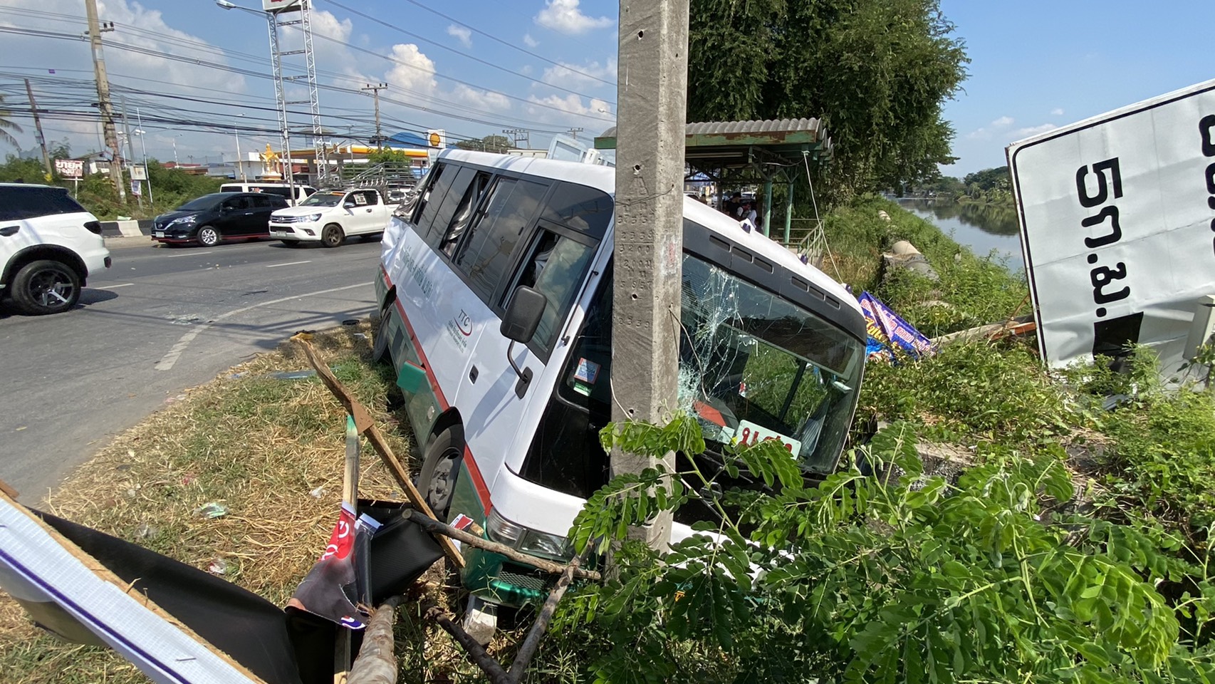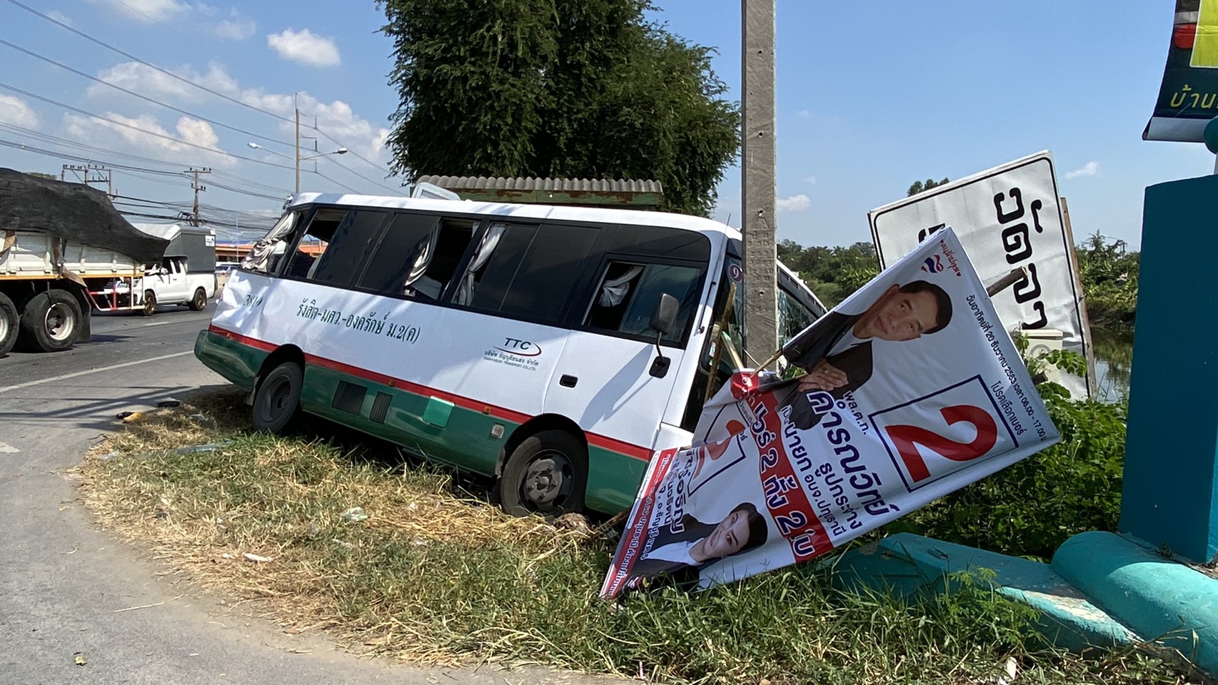 ในที่เกิดเหตุ บริเวณป้ายรถตรงทางขึ้นสะพานหน้าหมู่บ้าน พบรถโดยสารประจำทางยี่ห้อนิสสัน สีขาวเขียว หมายเลข10-2283 ปทุมธานี ของบริษัท ธัญบุรีขนส่ง จำกัด วิ่งระหว่าง รังสิต-มสว-องครักษ์ หมายเลขข้างรถ 381-9 ตกอยู่ข้างถนนด้านหน้าชนกับเสาไฟฟ้า ด้านท้ายข้างขวามีรอยถูกชน จากการตรวจสอบในเบื้องต้นพบผู้โดยสารทั้งหมด 15 คน ถูกนำตัวลำเลียงออกมาแล้ว 14 คนอีก 1 คนติดอยู่ภายในรถไม่สามารถออกมาได้ เจ้าหน้าที่กู้ภัยจำต้องใช้อุปกรณ์ตัด-ถ่าง เพื่อนำตัวผู้ได้รับบบาดเจ็บเป็นชายออกมา ก่อนนำตัวส่งโรงพยาบาลใกล้เคียง ห่างไปประมาณ 20 เมตร พบรถบรรทุกยี่ห้อฮีซูซุ สีขาว หมายเลขทะเบียน 70-2706 ตาก ของบริษัทแห่งหนึ่งได้รับความเสียหายบริเวณด้านซุ้มล้อหน้า