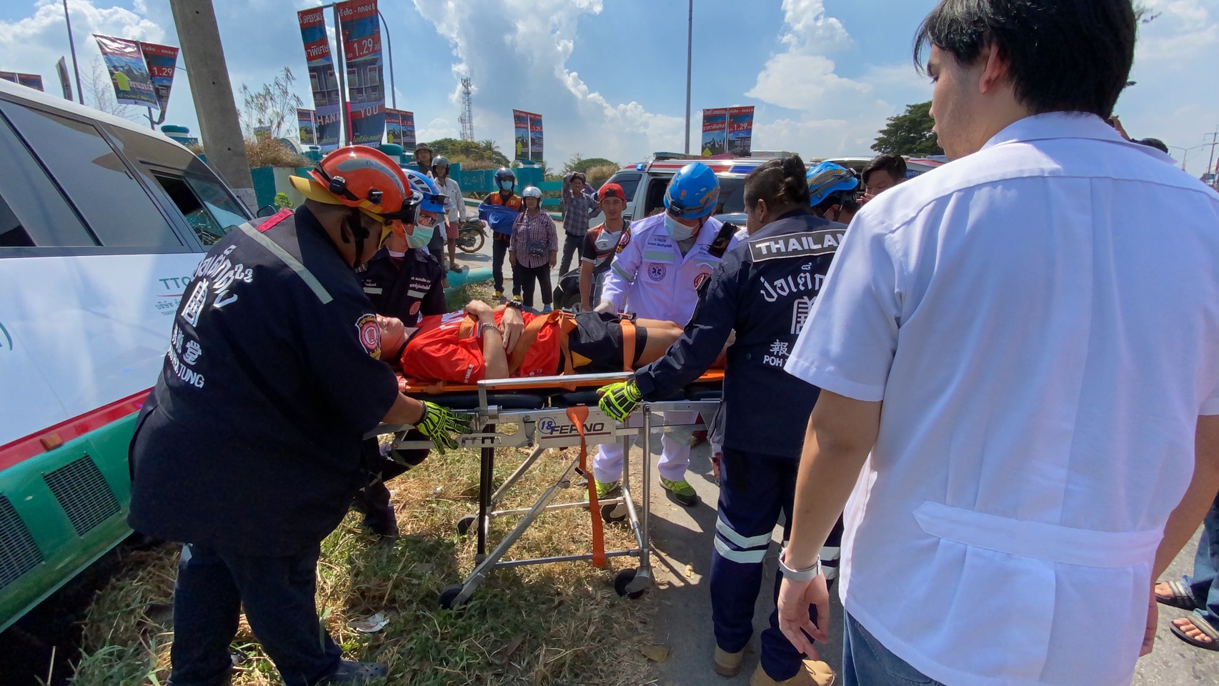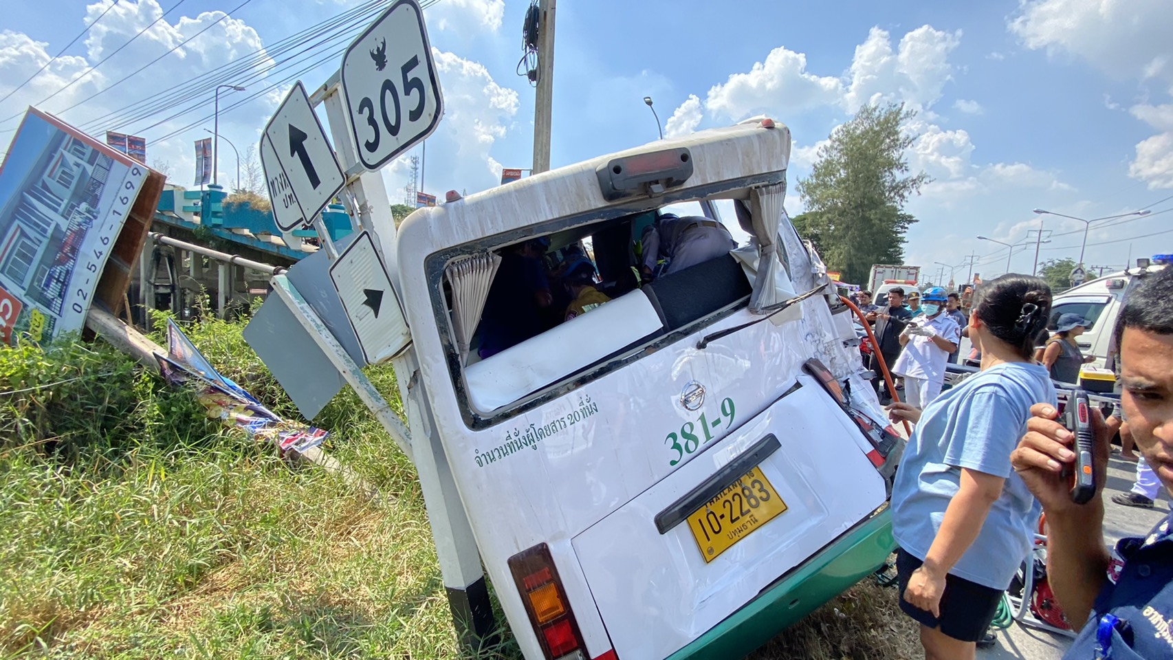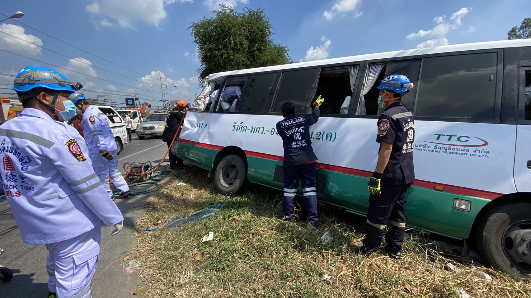 ปทุมธานี 15 ชีวิตหวิดดับ 10 ล้อชนรถประจำทาง เจ็บติดภายใน 1