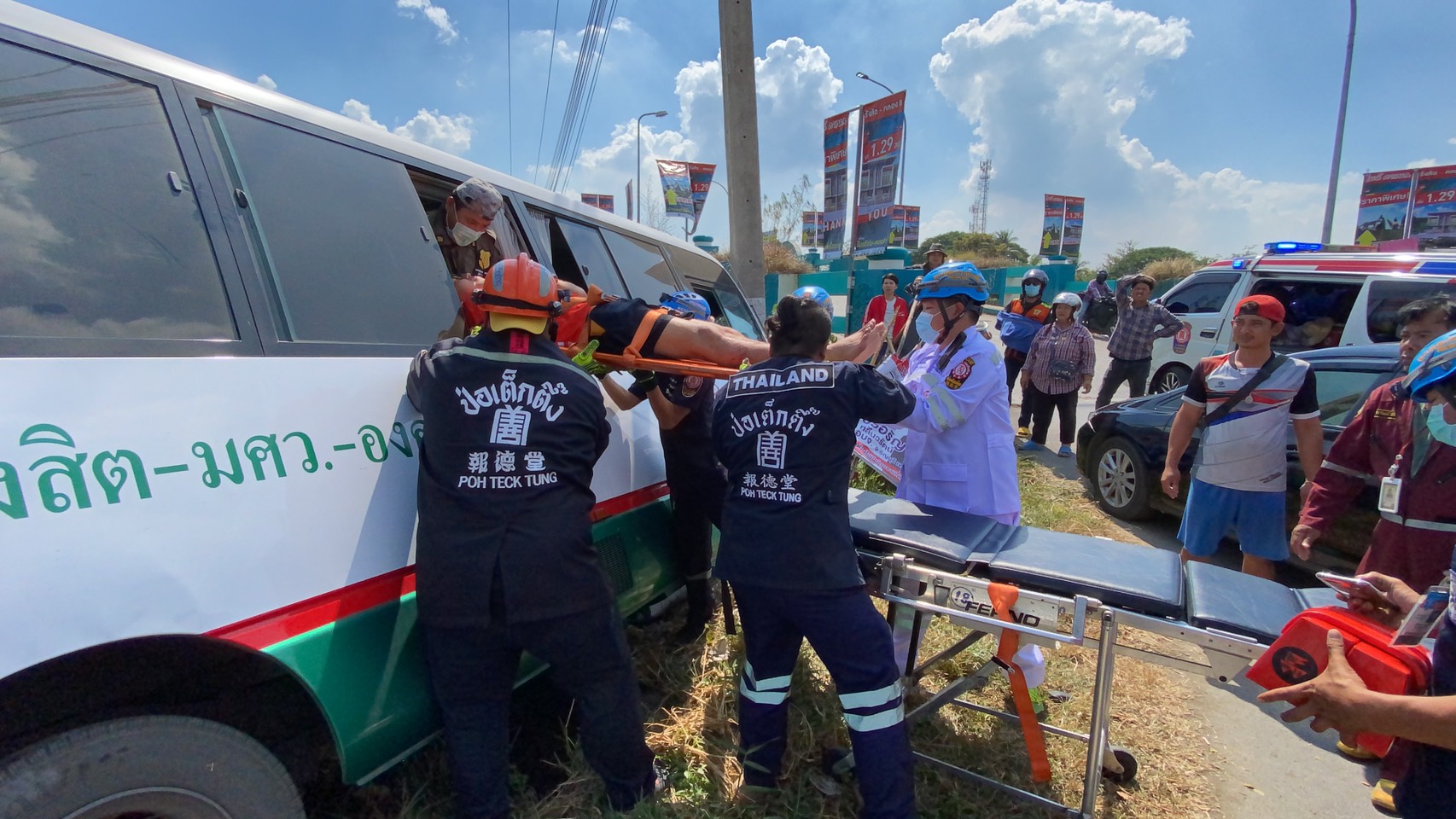 เมื่อเวลา 12.00 น. วันที่ 20 พ.ย. พ.ต.ท.ยุทธภูมิ โพธิ์อุดม สารวัตรสอบสวน สภ.ธัญบุรี จ.ปทุมธานี ได้รับแจ้งว่ามีอุบัติเหตุ รถบรรทุก 10 ล้อชนท้ายรถบัสประจำทาง ตกข้างทาง เหตุเกิดบริเวณป้ายรถประจำทางหน้าหมู่บ้านเรือนสุข 2 ถนนรังสิต-นครนายก ตำบลลำผักกูด อำเภอธัญบุรี จังหวัดปทุมธานี เป็นเหตุให้มีผู้ได้รับบาดเจ็บหลายราย และ ติดค้างในรถจำนวน 1 ราย หลังรับแจ้งจึงประสานเจ้าหน้าที่กู้ภัย พร้อมทั้งรุดไปตรวจสอบที่เกิดเหตุพร้อมด้วย อาสาสมัครมูลนิธิป่อเต็กตึ๊ง และ อุปกรณ์ตัด-ถ่าง