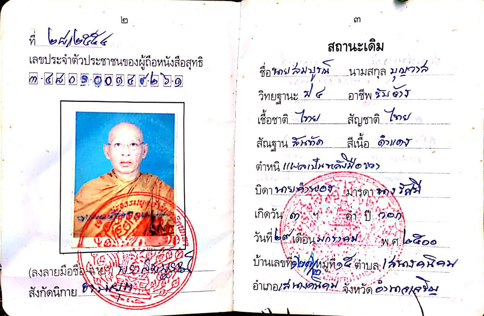 จากการตรวจสอบเอกสาร เป็นบัตรประจำตัวประชาชน ทราบชื่อคือ พระสมบูรณ์ บุญวาส อายุ 64 ปี อยู่บ้านเลขที่ 152 หมู่ที่ 11 ต.ขามเฒ่า อ.เมืองนครพนม จ.นครพนม และหนังสือสุทธิสำหรับพระภิกษุและสามเณร สังกัดวัดสุมังคลาราม อ.เลิงนกทา จ.ยโสธร บรรพชา/อุปสมบท เมื่อวันที่ 18 ตุลาคม 2554 (9 พรรษา)