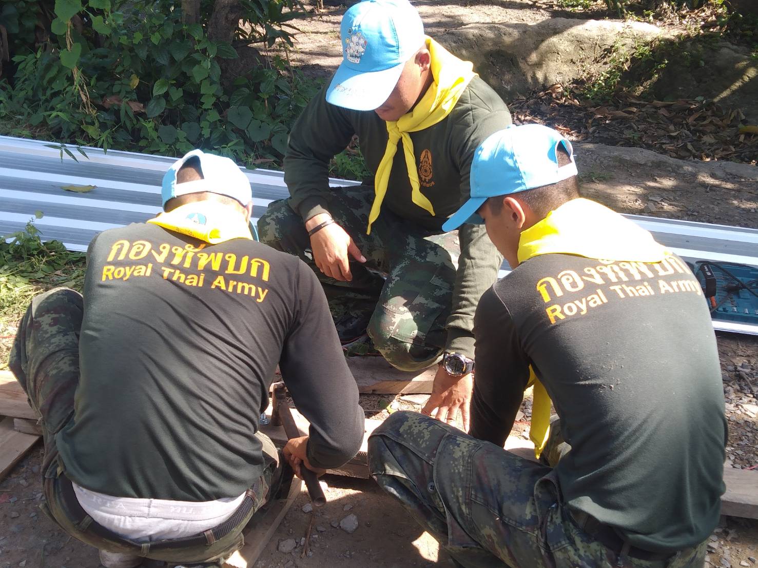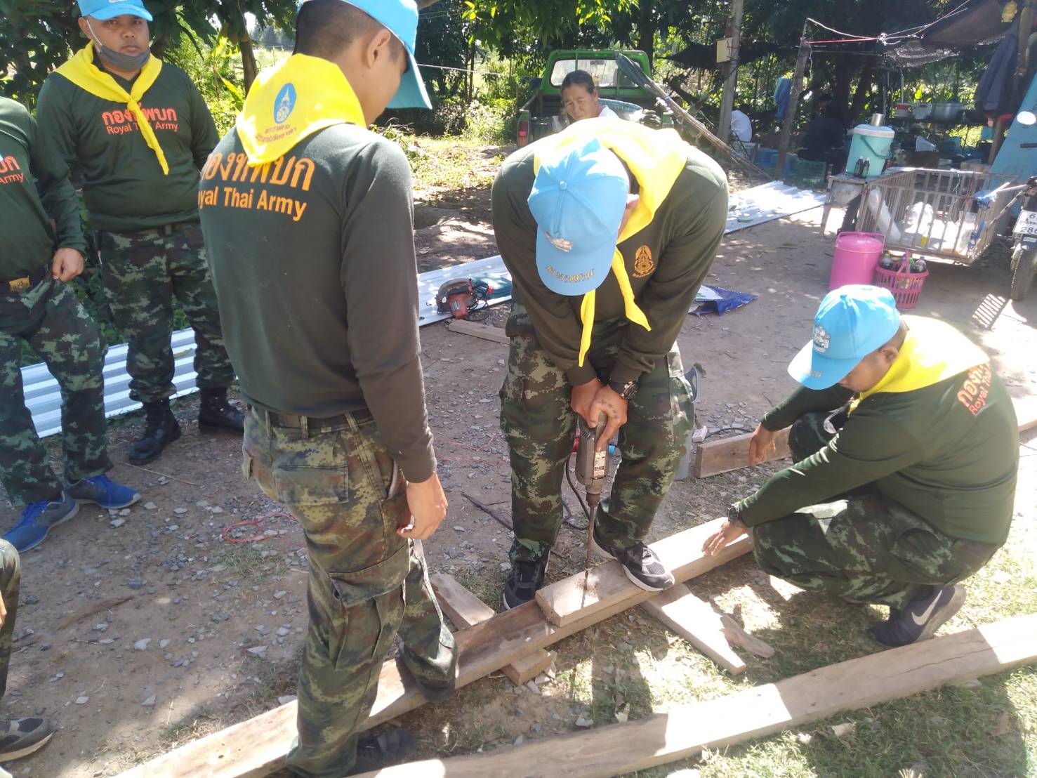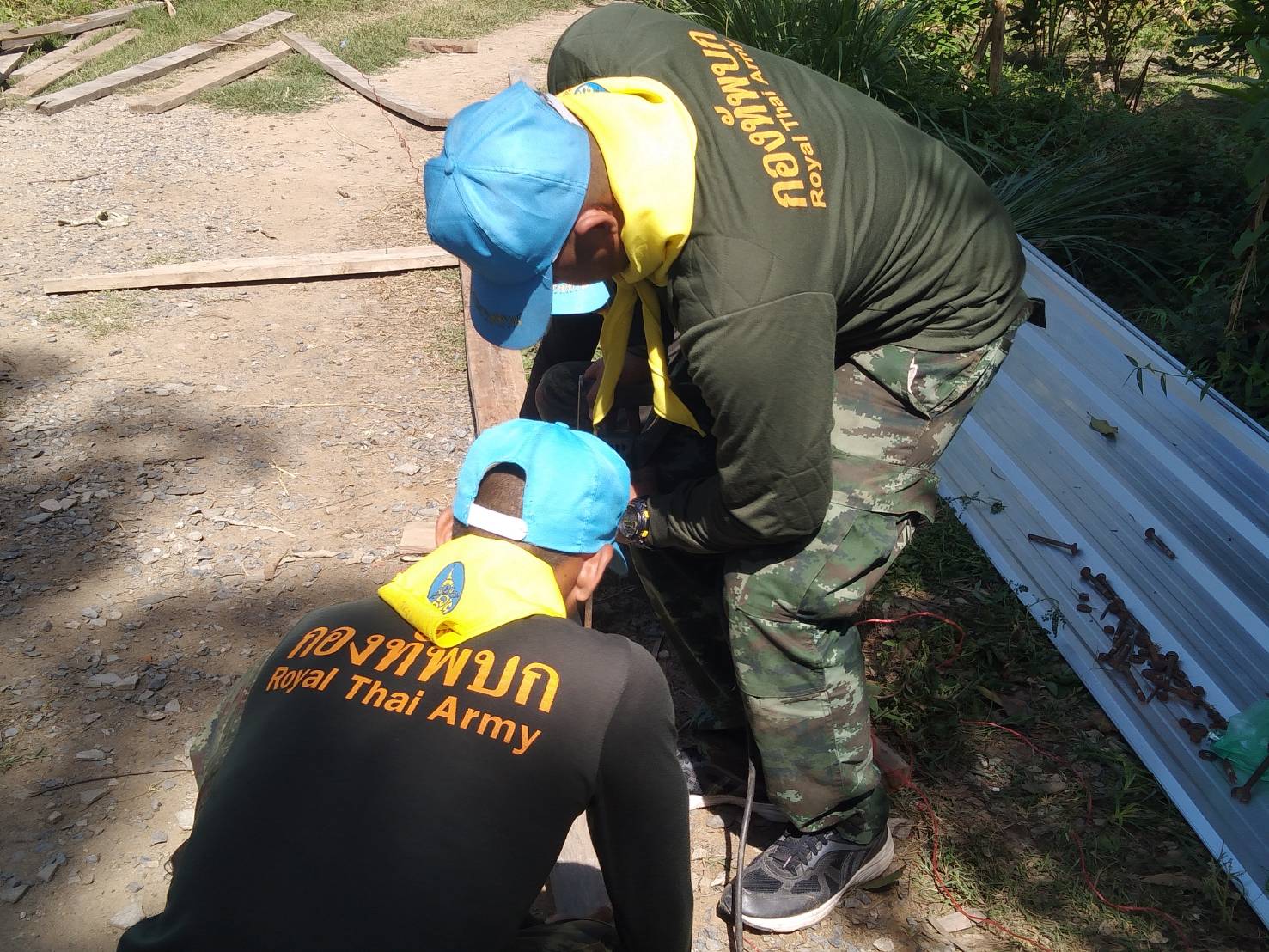 โดย พ.อ.ชายธนัญชา วาจรัต รอง ผอ.กอ.รมน. (ฝ่ายทหาร) และ นางอรุณี จุลเจริญ นายอำเภอค่ายบางระจัน ได้มาตรวจเยี่ยมบ้านพร้อมให้กำลังใจประชาชนที่ได้รับความเสียหาย และทหารชุดซ่อมแซมบ้าน โดยมี นางถนอม ธรรมศรีสวัสดิ์ ผู้ใหญ่บ้าน หมู่ที่ 12 ให้การช่วยเหลือดูแลชุดกำลังพลที่มาช่วยซ่อมแซมบ้าน ชาวบ้านหลายคนต่างดีใจที่มีทหาร และผู้ใจบุญท่านอื่นมาช่วยเหลือผู้ที่ได้รับความเดือดร้อนในครั้งนี้