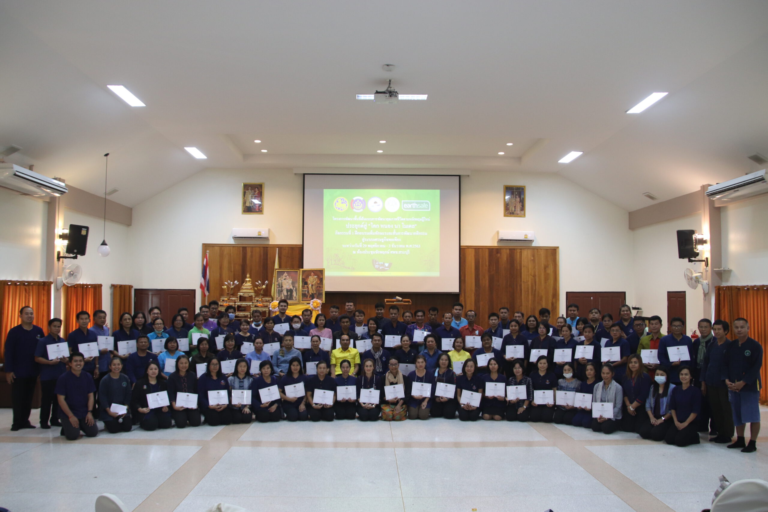 โดยโครงการพัฒนาพื้นที่ต้นแบบการพัฒนาคุณภาพชีวิตตามหลักทฤษฎีใหม่ ประยุกต์สู่ “โคก หนอง นา โมเดล” กิจกรรมที่ 1 ฝึกอบรมเพิ่มทักษะระยะสั้นการพัฒนากสิกรรมสู่ระบบเศรษฐกิจพอเพียง รูปแบบ โคก หนอง นา โมเดล ที่ได้ดำเนินการมาตลอด 5 วัน ตั้งแต่วันที่ 29 พฤศจิกายน – 3 ธันวาคม 2563 ณ ศูนย์ศึกษาและพัฒนาชุมชน ทั้ง 7 แห่ง ได้แก่ ศูนย์ศึกษาและพัฒนาชุมชนนครนายก ศูนย์ศึกษาและพัฒนาชุมชนสระบุรี ศูนย์ศึกษาและพัฒนาชุมชนอุบลราชธานี ศูนย์ศึกษาและพัฒนาชุมชนอุดรธานี ศูนย์ศึกษาและพัฒนาชุมชนลำปาง ศูนย์ศึกษาและพัฒนาชุมชนนครศรีธรรมราช และศูนย์ศึกษาและพัฒนาชุมชนนครราชสีมา โดยกลุ่มเป้าหมายทุกคนผ่านการอบรม และฝึกปฏิบัติในรูปแบบการบรรยาย การแบ่งกลุ่มอภิปราย การฝึกปฏิบัติฐานเรียนรู้ ถอดบทเรียนผ่านสื่อ การฝึกครูกระบวนการ ครูประจำฐานเรียนรู้ ครูพาทำ จิตอาสาพัฒนาเอามื้อสามัคคีพัฒนาพื้นที่ตามหลักทฤษฎีใหม่ เพื่อให้ผู้เข้าร่วมสามารถเป็นแกนนำขับเคลื่อนการน้อมนำหลักปรัชญาของเศรษฐกิจพอเพียงและทฤษฎีใหม่ประยุกต์สู่การปฏิบัติในรูปแบบ โคก หนอง นา โมเดลในพื้นที่เป้าหมายได้ต่อไป