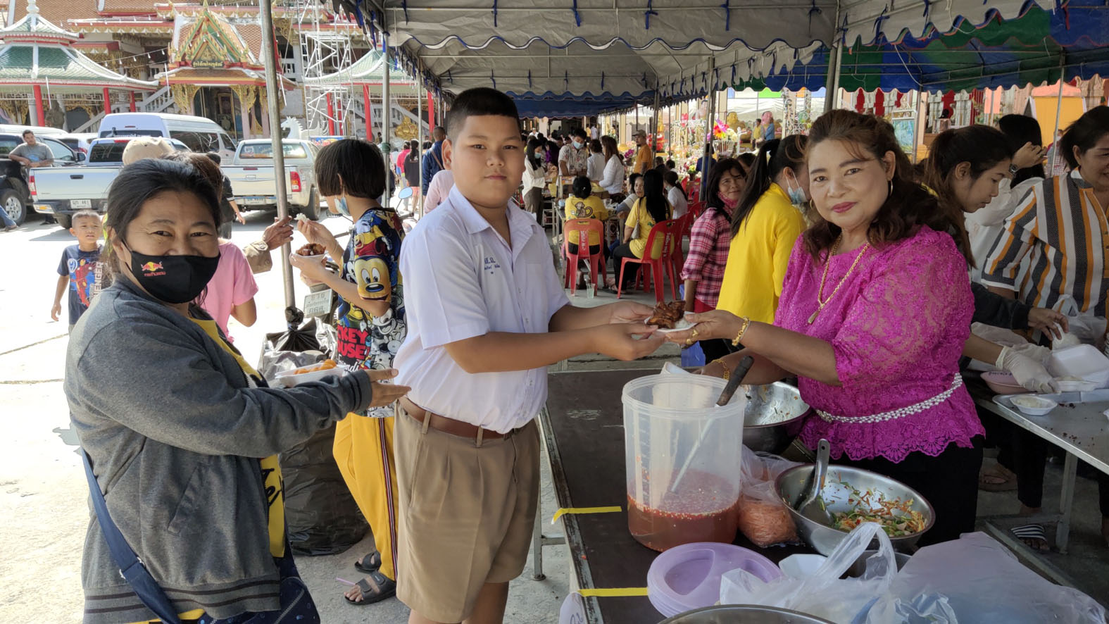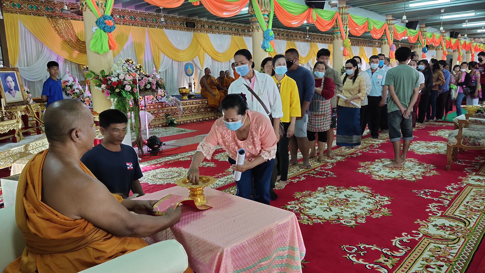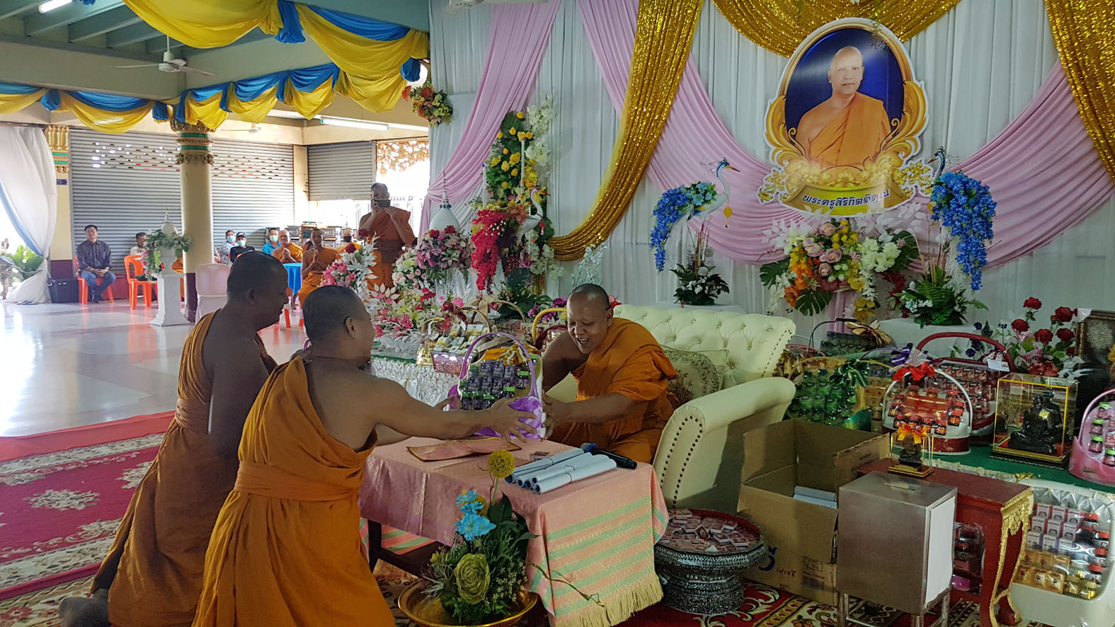 โดยพระครูสิริกิตติคุณ เจ้าคณะตำบลสระแก้ว เจ้าอาวาสวัดสังฆจายเถรได้บริจาคเงินให้กับวัดในปกครอง และมอบเงินสมทบทุนอาหารกลางวันให้กับโรงเรียนในพื้นที่ พร้อมกันนี้ได้มอบทุนการศึกษาให้เด็กนักเรียนที่เรียนดีแต่ฐานะยากจน พร้อมกับแจกวัตถุมงคลและปฏิทินปีใหม่เป็นของขวัญให้กับญาติโยมและประชาชนนักท่องเที่ยวที่มาร่วมงาน ขณะเดียวกันชาชนและลูกศิษย์ลูกหาที่มาร่วมงานได้ไปกราบไหว้ขอพรพระสังกัจจายน์องค์ใหญ่ที่สุดในประเทศไทยเพื่อความเป็นมงคลให้กับตัวเองและครอบครัวชาวบ้านบางคนได้ใช้มือลูบไล้ที่สะดือพระสังกัจจายน์ พร้อมอธิษฐานขอโชคขอเลขพร้อมกับใช้โทรศัพท์มือถือถ่ายส่องหาเลขเด็ด