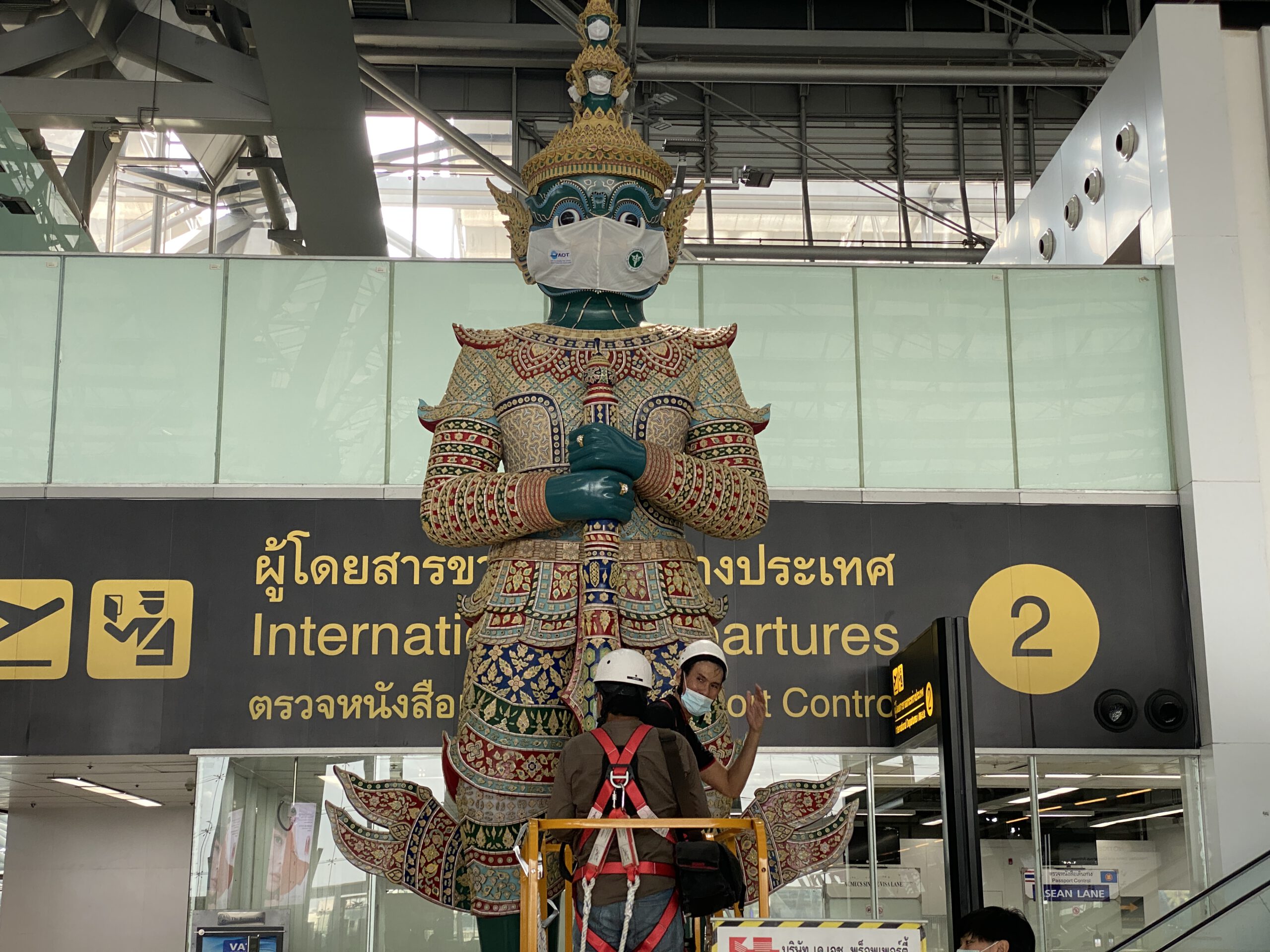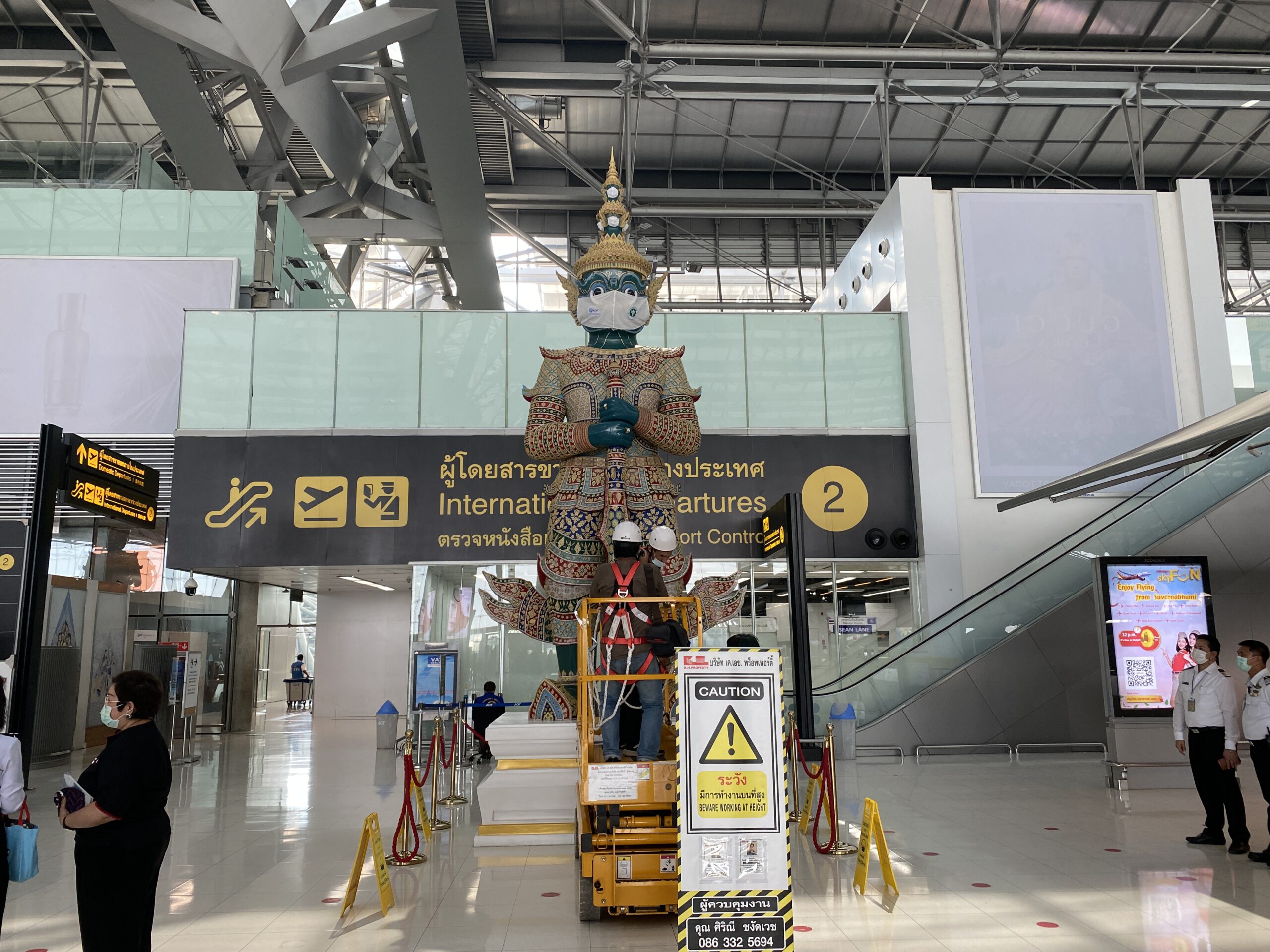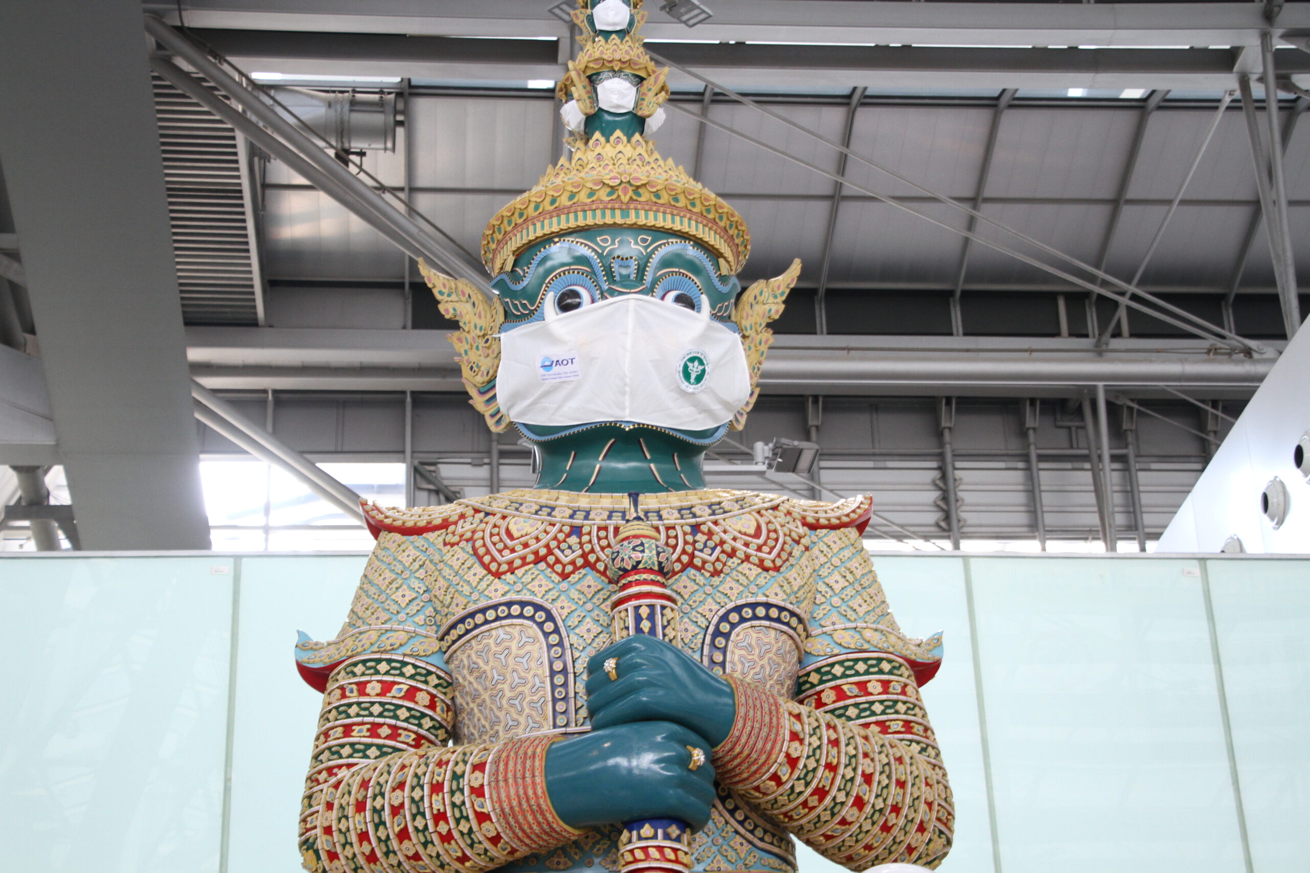 สมุทรปราการ สธ.-ทอท. ผนึกกำลังเข้มมาตรการป้องกันโควิด 19 ขนาดยักษ์ยังสวมเลย