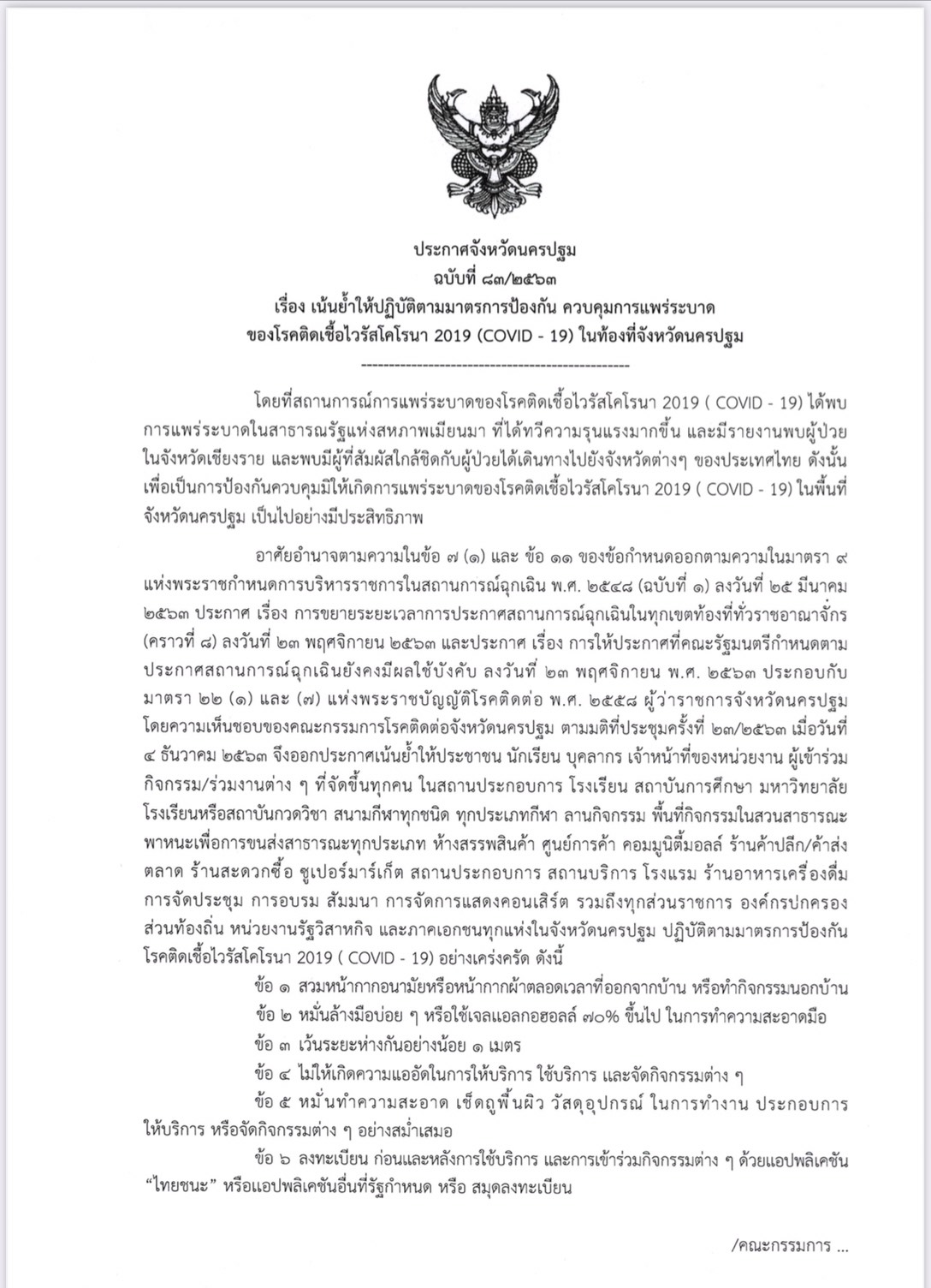 ทั้งนี้ จังหวัดนครปฐมได้มีประกาศจังหวัดนครปฐม ฉบับที่ 83/2563 เน้นย้ำให้ภาคประชาชนและภาคประชาสังคม ทั้งผู้ให้บริการ ผู้ใช้บริการ ผู้จัดกิจกรรม และผู้ร่วมกิจกรรมในพื้นที่สาธารณะ ปฏิบัติตามมาตรการป้องกันควบคุมการแพร่ระบาดของโรคติดเชื้อไวรัสโคโรนา 2019 อย่างเคร่งครัด โดยให้สวมหน้ากากอนามัยหรือหน้ากากผ้าตลอดเวลาที่ออกจากบ้าน หรือทำกิจกรรมนอกบ้าน หมั่นล้างมือบ่อยๆ หรือใช้เจลแอลกอฮอล์ 70 เปอร์เซ็นต์ขึ้นไป ในการทำความสะอาดมือ เว้นระยะห่างกันอย่างน้อย 1 เมตร ไม่ให้เกิดความแออัดในการให้บริการ ใช้บริการ และจัดกิจกรรมต่างๆ หมั่นทำความสะอาด เช็ดถูพื้นผิว วัสดุอุปกรณ์ในการทำงาน ประกอบการ ให้บริการ หรือจัดกิจกรรมต่างๆ อย่างสม่ำเสมอ