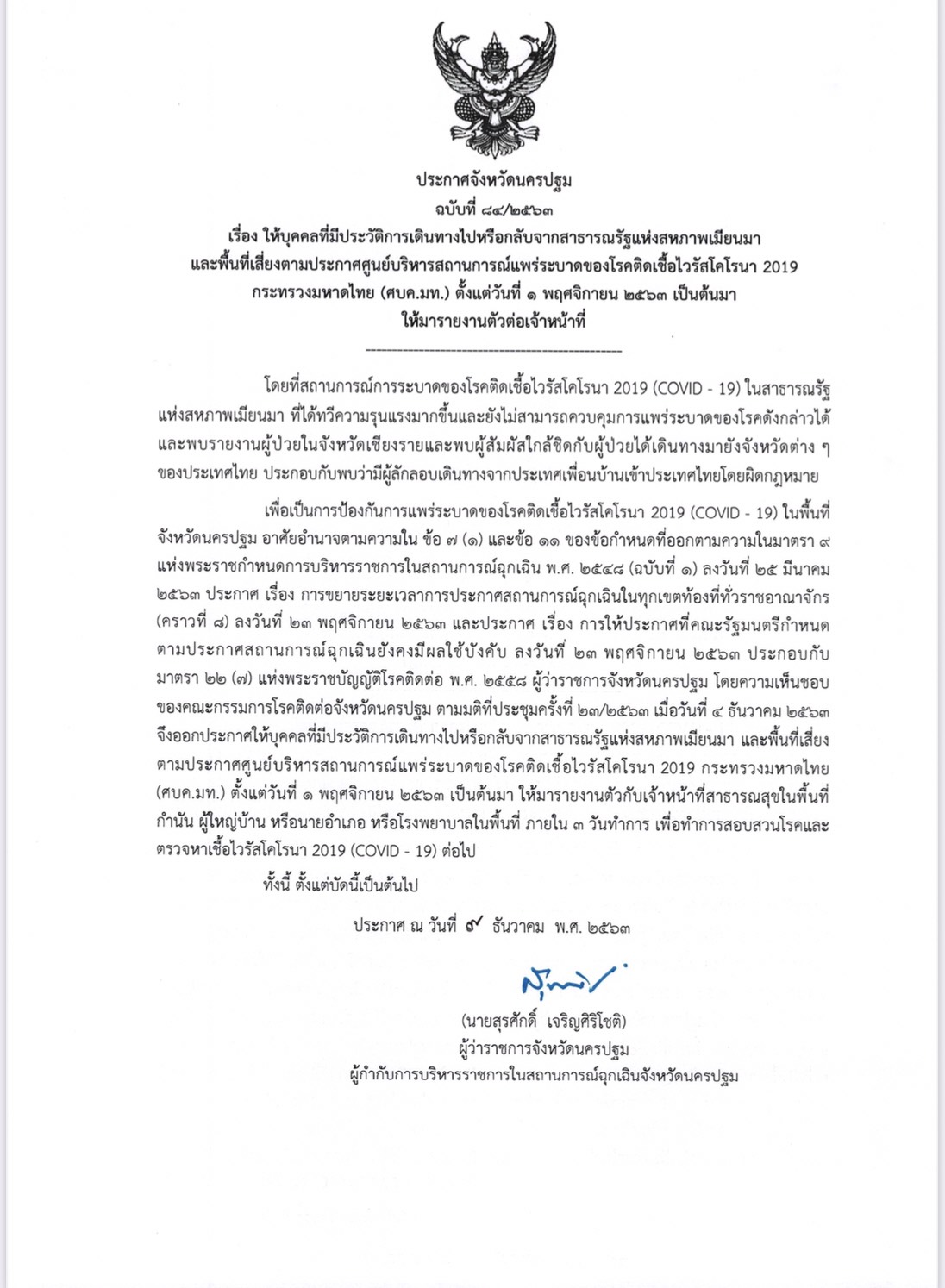 ส่วนประกาศจังหวัดนครปฐม ฉบับที่ 84/2563 ให้บุคคลที่มีประวัติการเดินทางไปหรือกลับจากสาธารณรัฐแห่งสหภาพเมียนมา และพื้นที่เสี่ยงตามประกาศศูนย์บริหารสถานการณ์แพร่ระบาดของโรคติดเชื้อไวรัสโคโรนา 2019 กระทรวงมหาดไทย ตั้งแต่วันที่ 1 พฤศจิกายน 2563 เป็นต้นมา ให้มารายงานตัวกับเจ้าหน้าที่สาธารณสุขในพื้นที่ กำนัน ผู้ใหญ่บ้าน หรือนายอำเภอ หรือโรงพยาบาลในพื้นที่ ภายใน 3 วันทำการ เพื่อทำการสอบสวนโรคและตรวจหาเชื้อไวรัสโคโรนา 2019 ต่อไป