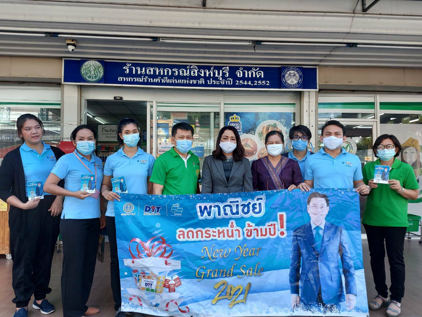 ซึ่งรองนายกรัฐมนตรีและรัฐมนตรีว่าการกระทรวงพาณิชย์ (นายจุรินทร์ ลักษณวิศิษฏ์ ) จึงได้มีโครงการ “พาณิชย์ลดกระหน่ำข้ามปี New Year Grand Sale 2021” ขึ้นมาเพื่อลดค่าครองชีพและเป็นของขวัญให้กับประขาชนในช่วงเทศกาลปีใหม่ 2564 ระหว่างวันที่ 16 ธันวาคม 2563 ถึงวันที่ 31 มกราคม 2564 กระทรวงพาณิชย์ ได้จับมือกับร้านค้าธงฟ้าพัฒนาเศรษฐกิจท้องถิ่นเข้าร่วมโครงการในจังหวัดต่างๆ ทั่วประเทศ สำหรับจังหวัดสิงห์บุรีกำหนดเปิดตัวโครงการฯ ไปเมื่อวันที่ 16 ธันวาคม 2563