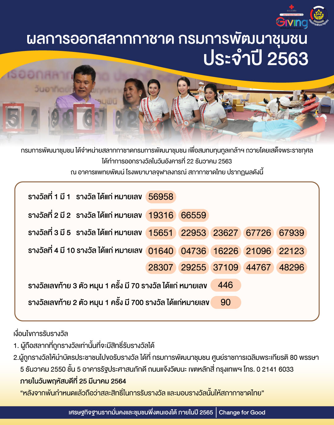 โดยผลการออกสลากกาชาดกรมการพัฒนาชุมชน ประจำปี 2563 ปรากฏผล ดังนี้