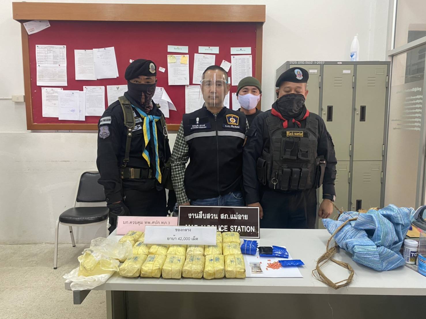 เพราะเป็นพื้นที่ติดต่อประเทศเมียนมา ทางเจ้าหน้าที่ชุดปฏิบัติการจึงเข้าตรวจสอบพื้นที่ดังกล่าว พบเป้ (ดัดแปลง) จำนวน 1เป้ จากการตรวจสอบเป็นยาเสพติดให้โทษประเภทที่ 1(ยาบ้า) จำนวน 21มัด รวม 42,000 เม็ด จึงได้นำส่งพนักงานสอบสวนสถานีตำรวจภูธรแม่อาย จังหวัดเชียงใหม่ เพื่อดำเนินคดีตามกฏหมายต่อไป