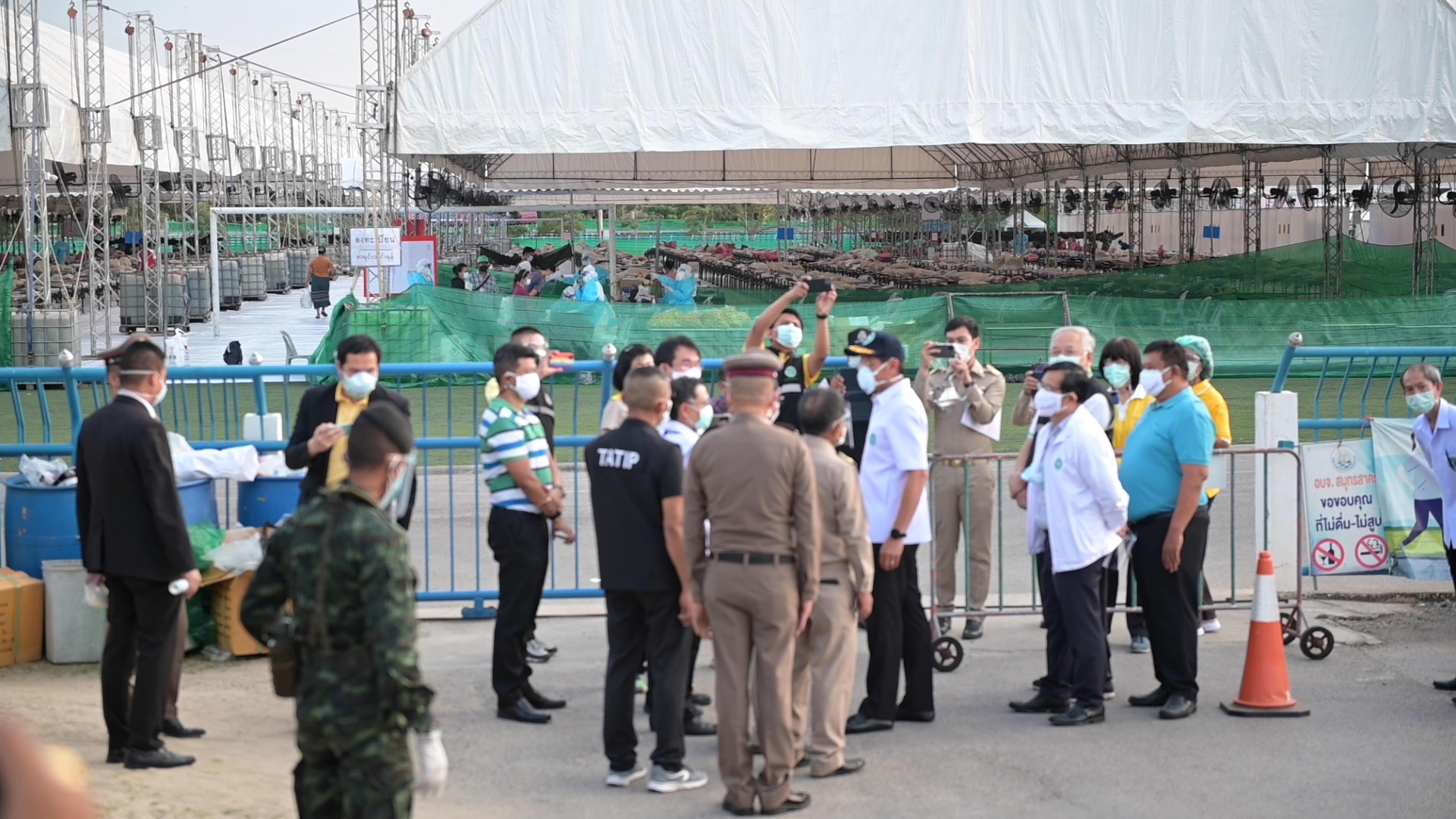 ในส่วนของโรงพยาบาลสนามที่สนามกีฬาแห่งนี้ก็เตรียมไว้ 700 ที่และทางจังหวัดก็ได้เตรียมสถานที่ไว้อีกหลายแห่งรวมเป็น 2,000 ที่และผมได้ประสานที่ค่ายภาณุรังสีที่ราชบุรี อีก1,000เตียง นั่นคือสถานที่ที่ตั้งสดๆร้อนเลยที่เพิ่งคุยกันเมื่อสักครู่เราก็จะเตรียมความพร้อมและจัดการให้สามารถโอเปอร์เรตได้ภายใน 48 ชั่วโมง ก็เดี๋ยวต้องดูครับว่าต้องทำให้ได้เร็วที่สุด ข้อสั่งการของท่านรองนายกฯอนุทินเมื่อเช้านี้ที่ประชุมร่วมกัน ว่าในทุกจังหวัดต้องประเมินแผน เคสทุกจังหวัดต้องเตรียมโรงพยาบาลสนามไว้แล้วก็ผ่านทางท่านผู้ตรวจเขตพื้นที่ต้องไปดำเนินการไปประชุมต่อ เมื่อเช้าก็มีข้อสั่งการไปแล้วและผมก็กำกับดูแล ขอท่านรองนายกฯยังต้องกักตัวอยู่ ที่มานี่ก็เพื่อกำกับให้เป็นไปตามที่เรากำหนดแผนไว้