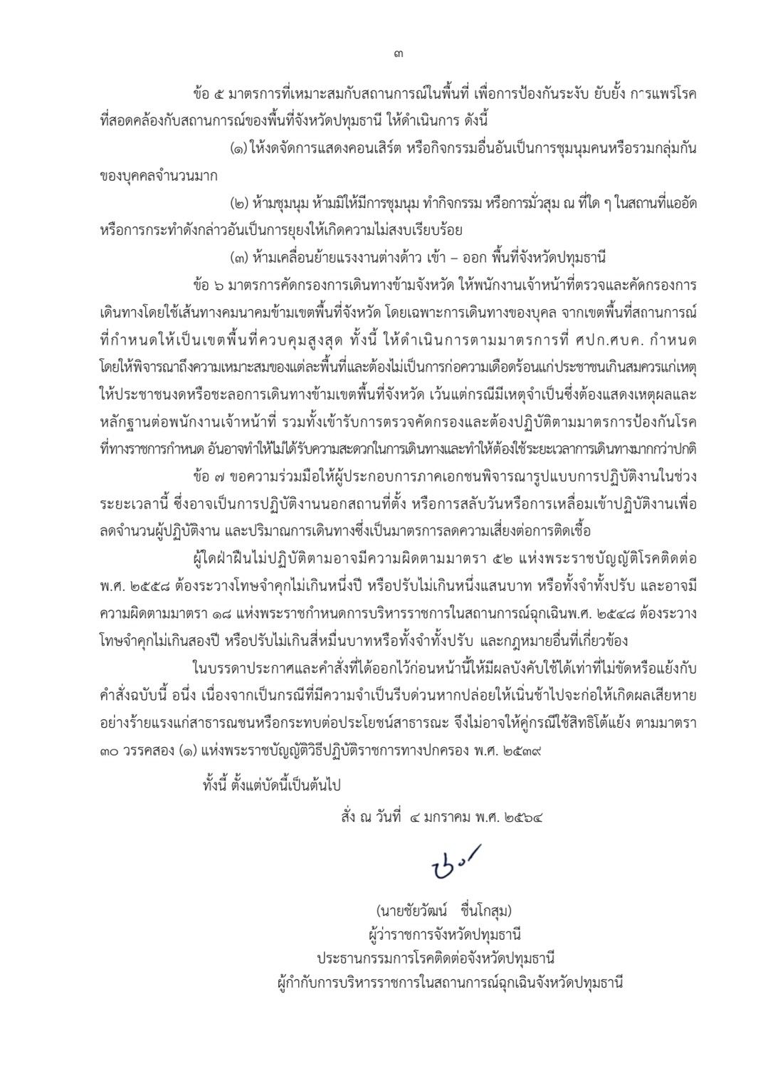 สั่ง ณ วันที่ 4 มกราคม2564 นายชัยวัฒน์ ชื่นโกสุม ผู้ว่าราชการจังหวัดปทุมธานีและประธานคณะกรรมการโรคติดต่อจังหวัดปทุมธานี