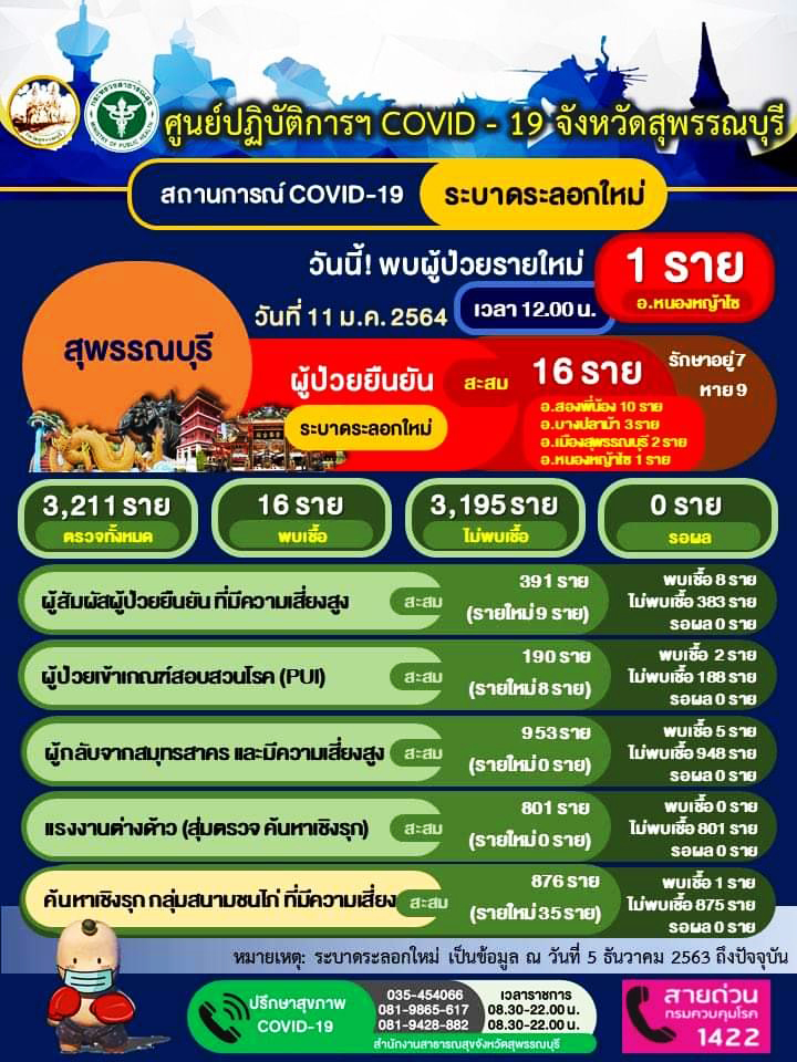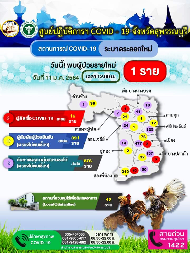 สถานการณ์โควิด 19 จังหวัดสุพรรณบุรี พบผู้ป่วยเพิ่ม 1 ราย จากเดิม 15 ราย รวมเป็น 16 ราย จากการตรวจรวม 3,211 ราย ตรวจไม่พบจำนวน ,195 ราย โดยผู้ป่วยรายที่ 16 ราย เป็นเด็กหญิงอายุ 8 ปีบ้านอยู่ตำบลหนองราชวัตร อำเภอหนองหญ้าไซ จังหวัดสุพรรณบุรี พ่อแม่พาไปสนามชนไก่ท่าแดง อ.เมือง จ.อ่างทอง ตาม Timeline วันที่ 27 ธ.ค. 63 ติดตามพ่อแม่ไปสนามชนไก่ท่าแดง อ.เมือง จ.อ่างทอง ผลการตรวจพบแม่และลูก ติดเชื้อโควิด ส่วนพ่อไม่พบเชื้อโดยแม่เข้ารักษาตัวที่ รพ.สิงห์บุรี ซึ่งทางคณะกรรมการศูนย์ปฏิบัติการควบคุมโรคจังหวัดสุพรรณบุรี กำลังเร่งติดตามกลุ่มเสี่ยง ตาม Timeline ของผู้ป่วยรายที่16 เพื่อให้มาตรวจหาเชื้อและกักกันตัวที่ Local Quarantine 14 วันล่าสุดมีผู้สัมผัสเสี่ยงสูงกับผู้ป่วยยืนยันรายที่16 ได้เข้า Local Quarantine ที่โรงแรมกีฬาจำนวน 6 ราย
