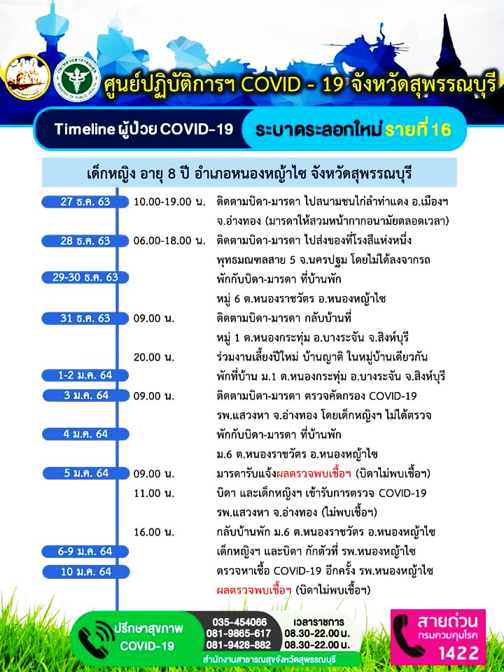Timeline ผู้ป่วย COVID-19 ระบาดระลอกใหม่ รายที่ 16 เด็กหญิง อายุ 8 ปี อำเภอหนองหญ้าไซ จังหวัดสุพรรณบุรี