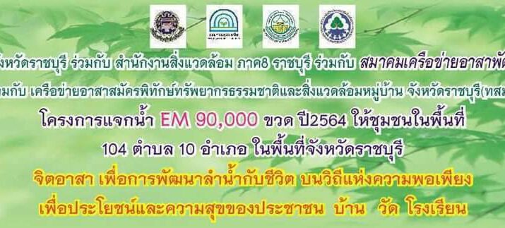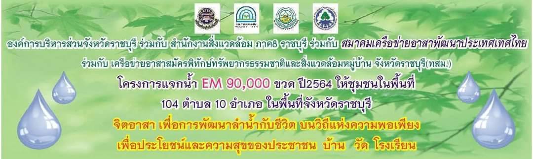 โดยถวายผ่าน. พระปิยทัสสี เจ้าคณะจังหวัดราชบุรี (ธรรมยุต) กิจกรรมโครงการ แจกน้ำEM 90,000 ขวด/ลิตร ปื2564 ให้ชุมชนในพื้นที่จังหวัดราชบุรี 104ตำบล 10อำเภอ ในพื้นที่จังหวัดราชบุรี **จิตอาสา เพื่อการพัฒนาลำน้ำกับชีวิต บนวิถีแห่งความพอเพียง เพื่อประโยชย์และความสุขของประชาชน บ้านวัด โรงเรียน ด้วยสถานการโควิด-19 จังหวัดราชบุรีเป็นจังหวัดที่ต้องระวังสูงสุด โดยพระปิยทัสสี เจ้าคณะจังหวัดราชบุรี (ธรรมยุต) เป็น ผู้แทน รับมอบน้ำจุลินทรีย์ EM เพื่อนำไปถวายวัดในเขตปกครอง วัด(ธรรมยุต) จำนวน100×10ลิตรรวม100วัด =1,000ลิตร ชุมชนรอบวัด200ขวด/ลิตร น้ำจุลินทรีย์EM ที่ดำเนินมอบครั้งนี้สนับสนุนจาก สมาคมเครือข่ายอาสาพัฒนาประเทศไทยทั้งนี้เพื่อ เป็นการรณรงค์ส่งเสริมให้ประชาชนในชุมชน นำวัตถุดิบน้ำอีเอ็ม EM ที่ผลิตขึ้นมาใช้ลดค่าใช้จ่ายที่มีมูลค่าเพิ่มอีกด้วย.