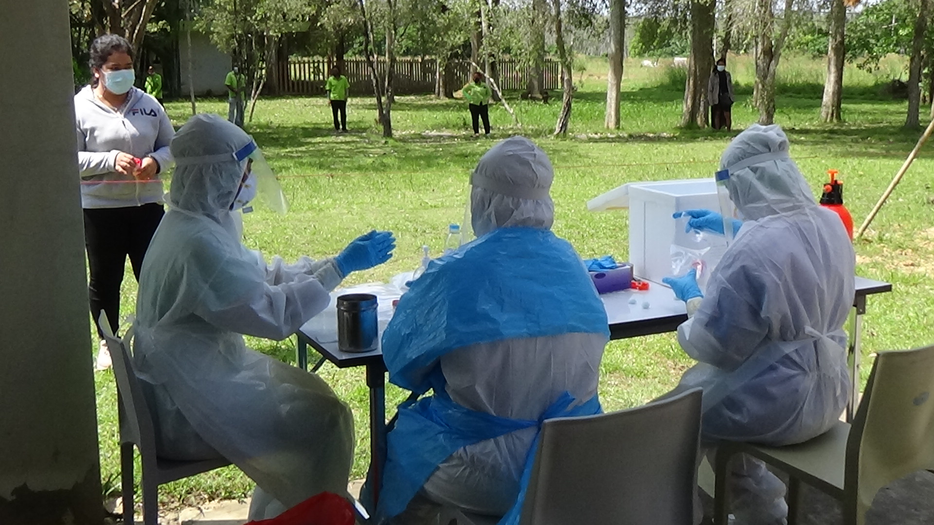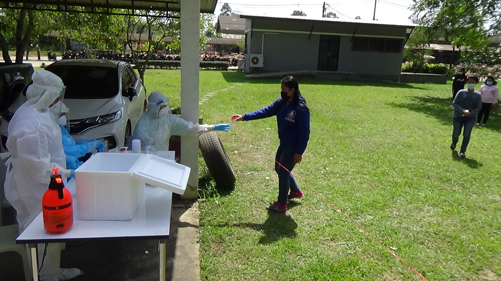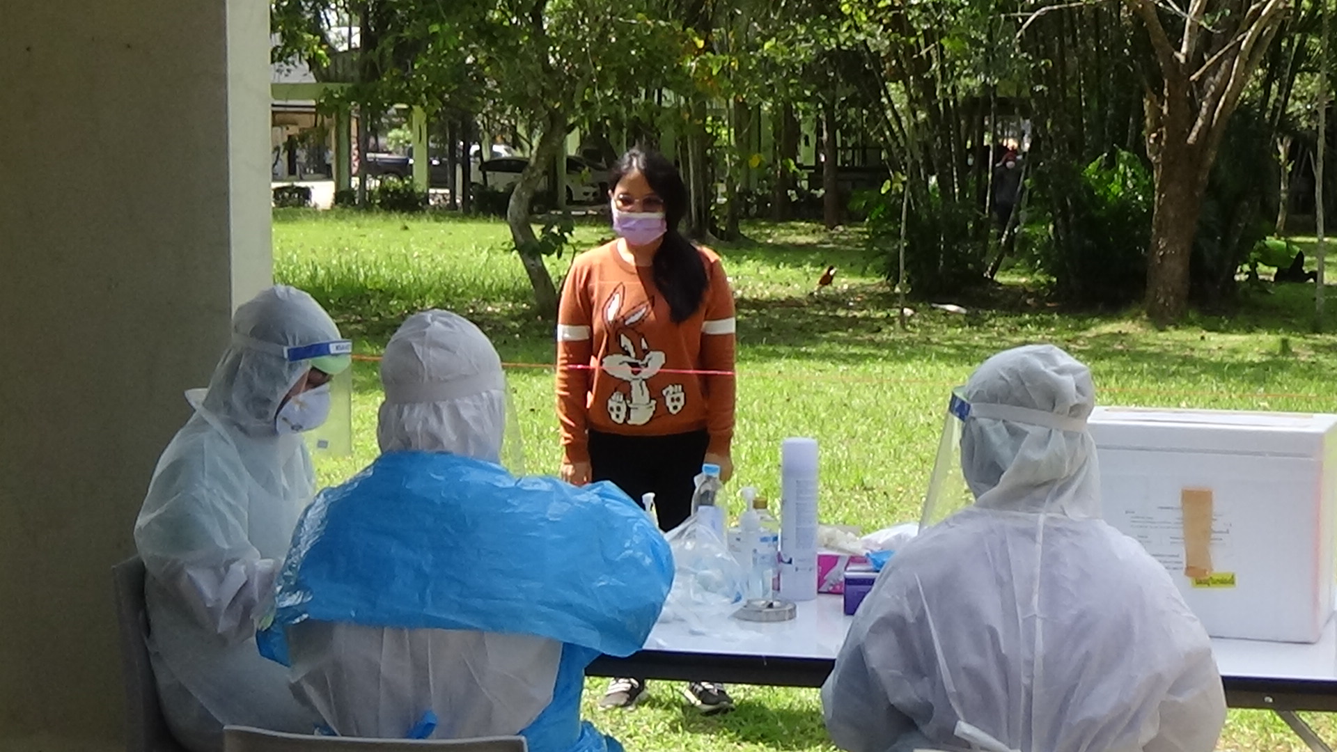 ที่โรงงานไม้ยางพารา บริษัท วู้ดเวอร์ค จำกัด ตำบลหนองช้างแล่น อำเภอห้วยยอด จังหวัดตรัง สำนักงานสาธารณสุขจังหวัดตรังประสานขอรถพระราชทาน BIOSAFTY MOBILE UNIT รถเก็บตัวอย่างชีวนิรภัย มาตรวจเจ้าหน้าที่ พนักงาน คนงานชาวไทยและแรงงานต่างชาติ โดยมอบหมายให้โรงพยาบาลห้วยยอดทำงานร่วมกับเจ้าหน้าที่ของรถพระราชทาน BIOSAFTY MOBILE UNIT รถเก็บตัวอย่างชีวนิรภัย ในการเก็บตัวอย่างน้ำลายของเจ้าหน้าที่ พนักงาน คนงานชาวไทยและแรงงานต่างชาติ เพื่อนำไปตรวจหาเชื้อโควิด -19 หลังจากที่ผ่านมามีการสุ่มตรวจและพบแรงงานต่างชาติ 2 คน ติดเชื้อโควิด -19 ทางเจ้าหน้าที่กำลังตรวจสอบว่าติดเชื้อได้อย่างไร เนื่องจากแรงงานต่างชาติทำงานอยู่ที่โรงงานไม้ยางพาราและไม่ได้เคลื่อนย้ายออกนอกพื้นที่แต่อย่างใด