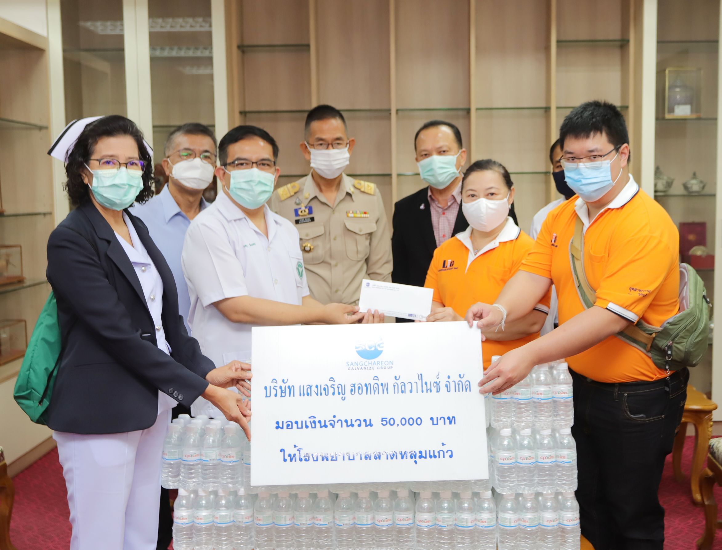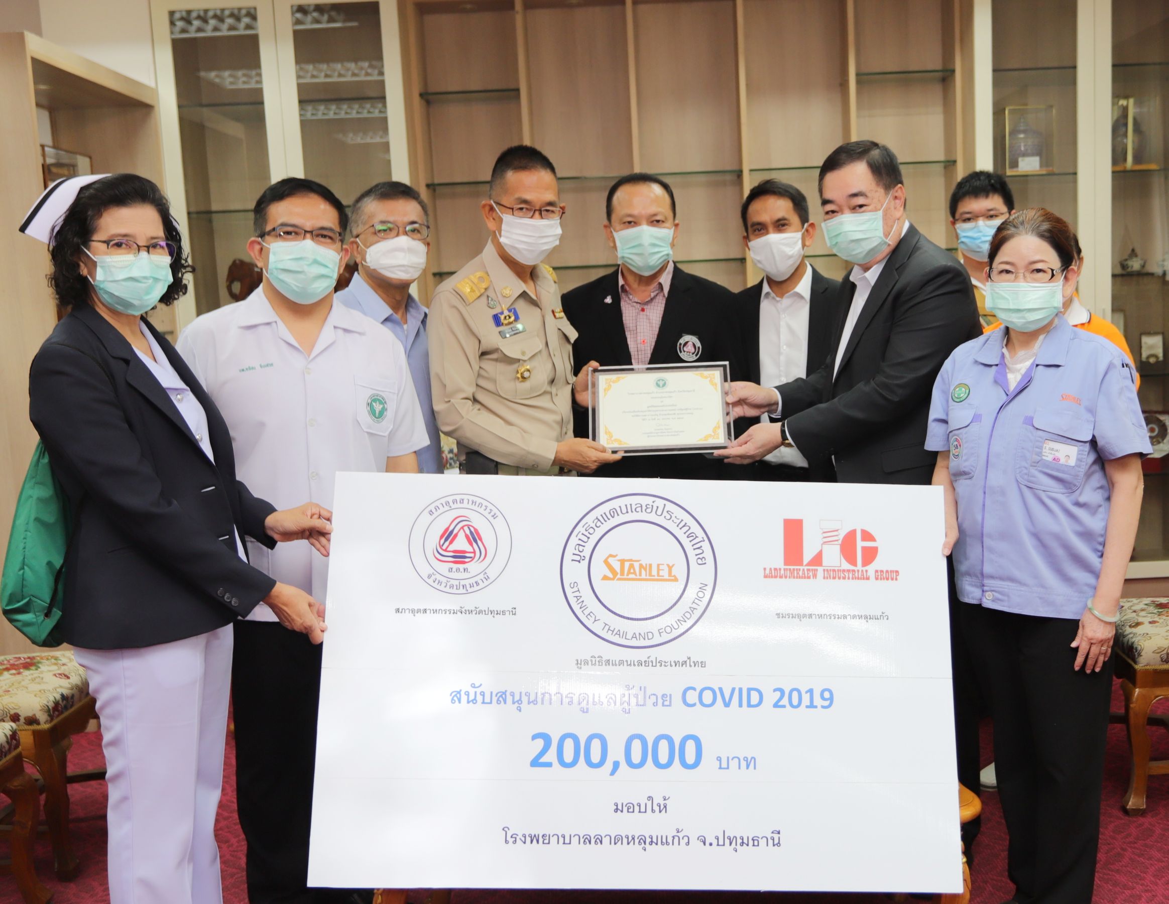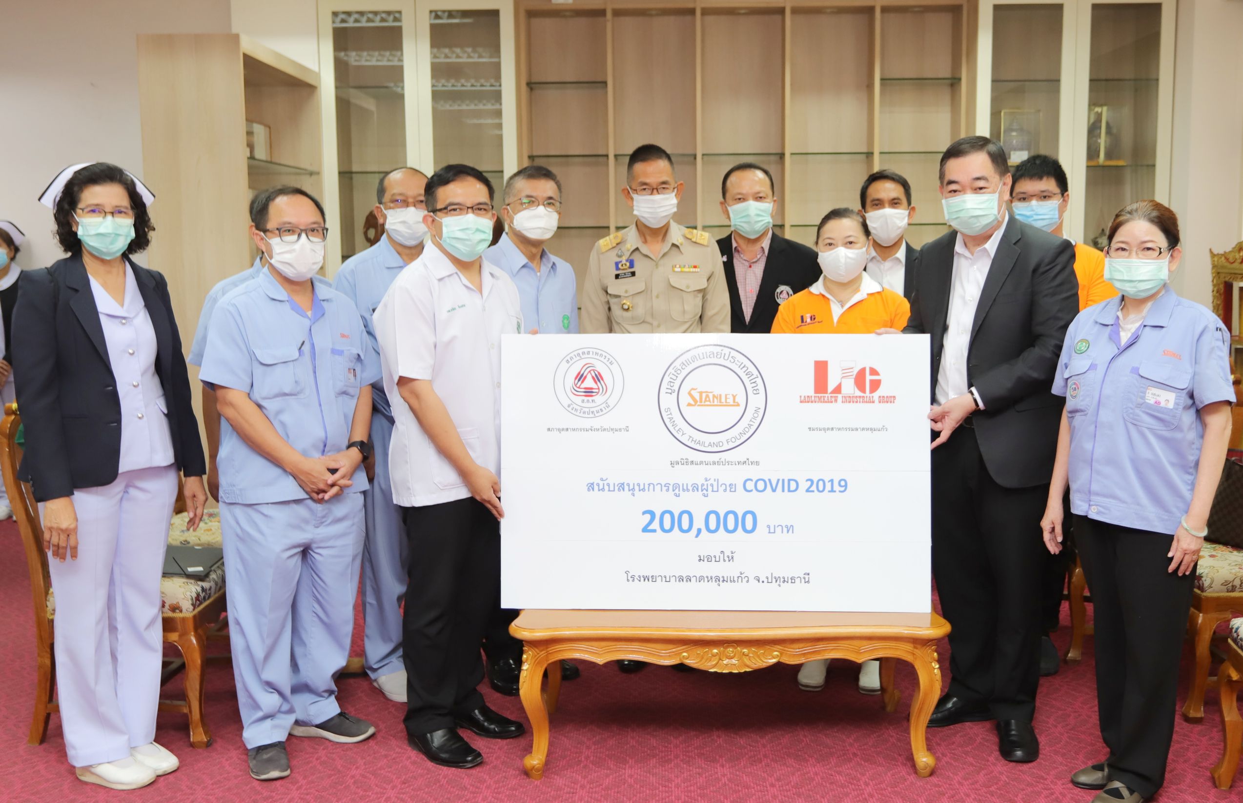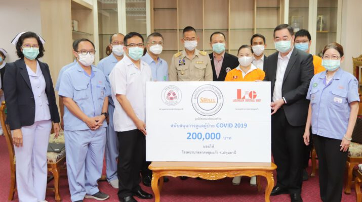 พร้อมทั้งสนับสนุนการดูแลผู้ป่วย COVID 2019 จำนวน เงิน 200,000 บาท มอบให้ โรงพยาบาลลาดหลุมแก้ว จังหวัดปทุมธานี และบริษัท แสงเจริญ ฮอทดิพ กัลวาไนซ์ จำกัด มอบเงินจำนวน 50,000 บาท ให้โรงพยาบาลลาดหลุมแก้วทั้งนี้เพื่อเพิ่มศักยภาพและประสิทธิภาพในการดูแลรักษาผู้ป่วยโรค Covid-19 โดยมี นายแพทย์สุรินทร์ สืบซึ้ง นายแพทย์สาธารณสุขจังหวัดปทุมธานี นพ.อภิชน จีนเสวก ผอ.รพ.ลาดหลุมแก้ว นายชวลิต ครองสิน ประธานสภาอุตสาหกรรมจังหวัดปทุมธานี นายเศรษฐรัชต์ เลือดสกุล อุตสาหกรรมจังหวัดปทุมธานี เข้าร่วมรับมอบ