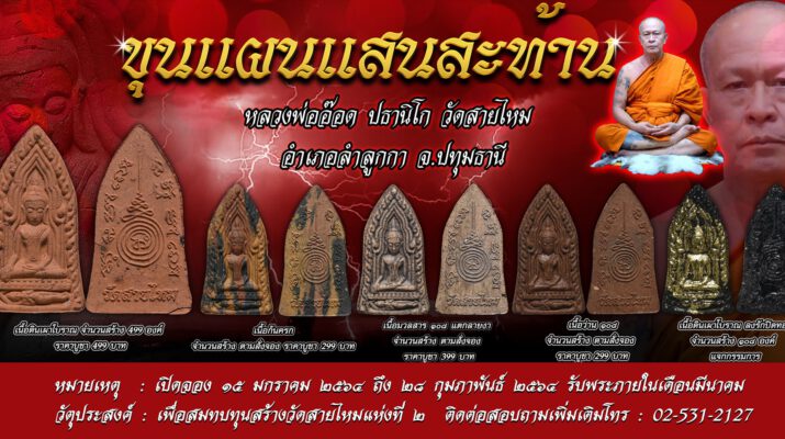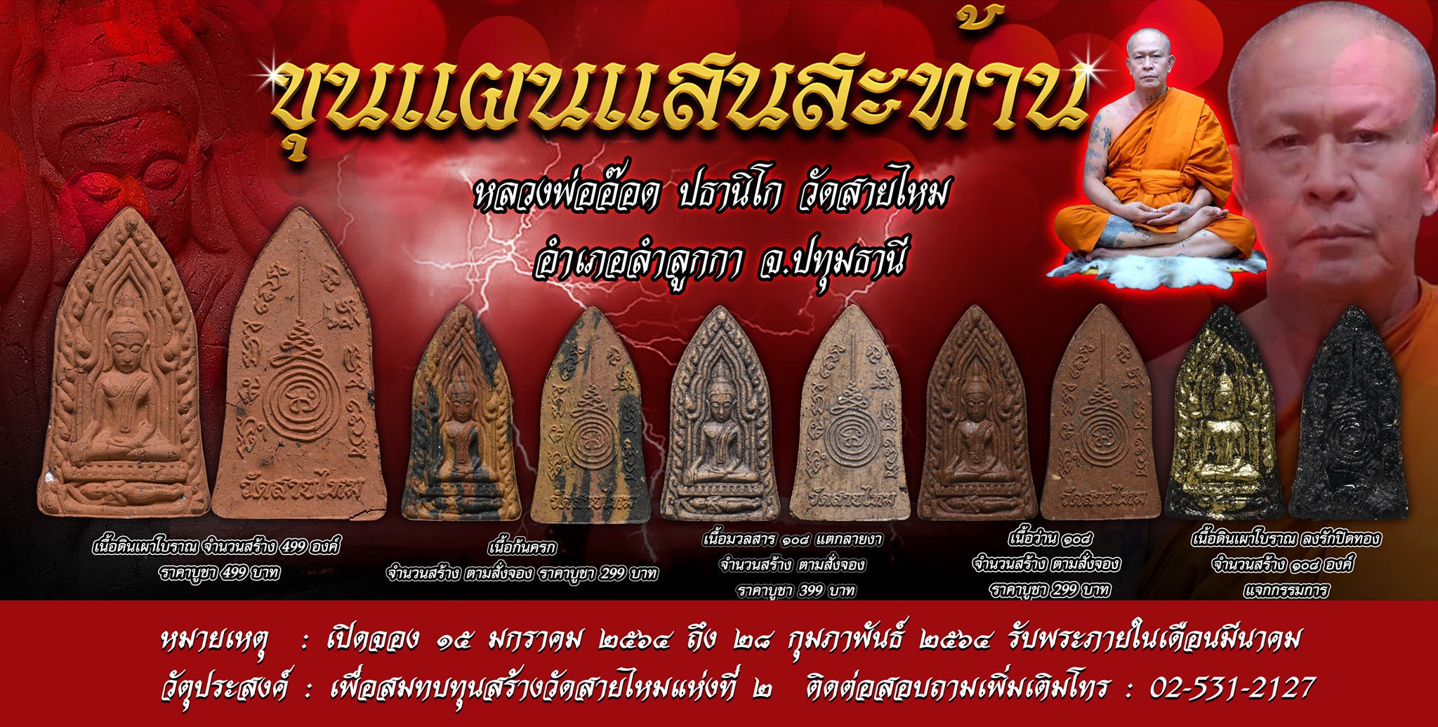 ติดต่อสั่งจองวัตถุมงคล ได้ที่เบอร์โทร. 02-5912127 วัดสายไหม ถึงวันที่ 28 กุมภาพันธ์ 2564 รับวัตถุมงคลภายในเดือนมีนาคม 2564