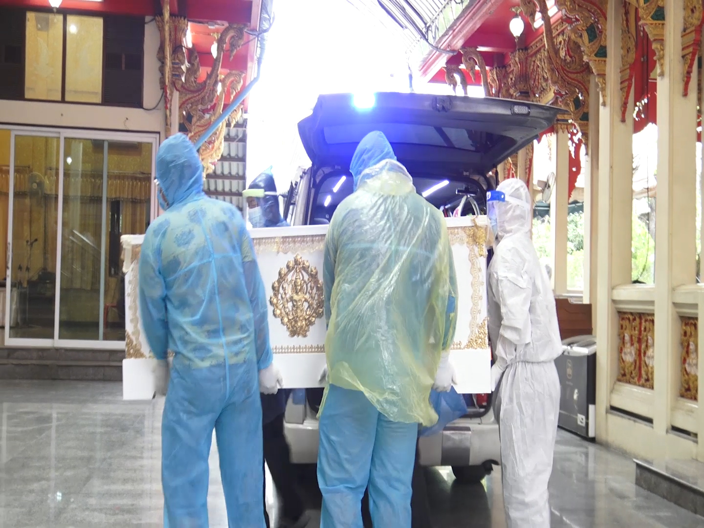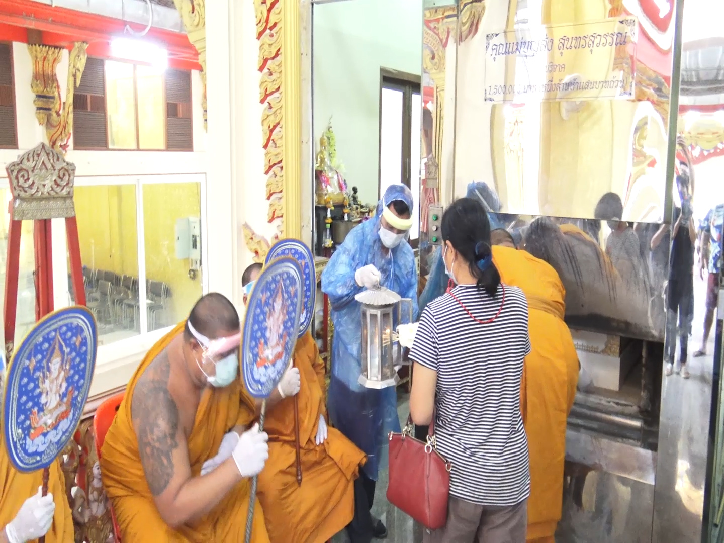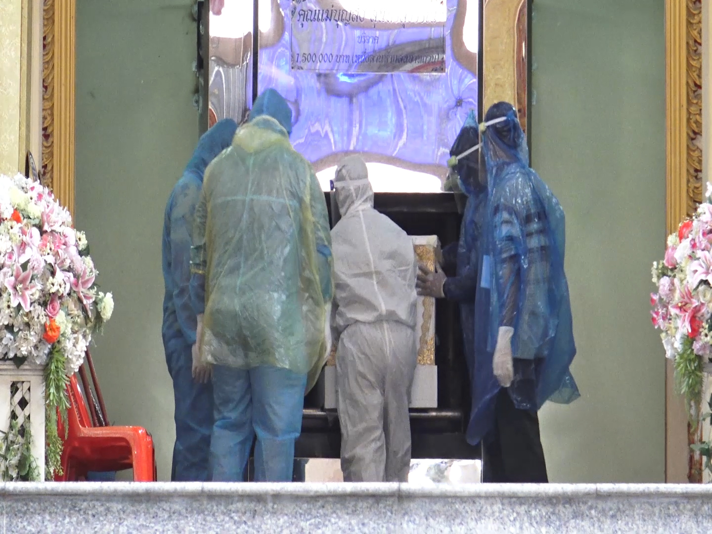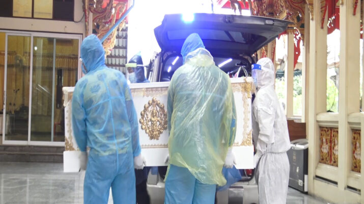 เมื่อรถมูลนิธิร่วมกตัญญูนำร่างผู้เสียชีวิต ที่บรรจุในโลงที่มีการซีนป้องกันเชื้อโรคมาเป็นอย่างดี เมื่อมาถึงเจ้าหน้าที่ ที่รับผิดชอบได้สวมชุดคลุม PPE ป้องกันร่างกายมีการนำน้ำยาฆ่าเชื้อฉีดที่โลงศพซึ่งภายในได้แพ๊คบรรจุด้วยการฆ่าเชื้อตามกระบวนการทางการแพทย์ ขึ้นสู่เตาเผา โดยมีคณะเจ้าหน้าที่ทีมสอบสวนโรคและเคลื่อนที่เร็ว สำนักงานสาธารณสุขจังหวัดนครปฐม ที่เดินทางมาช่วยประสานการเตรียมความพร้อมต่างๆ โดยมีคณะสงฆ์ ทำการ สวดอภิธรรม สวดบังสุกุล บทเจ็ดพระคัมภีร์ จากนั้น หลวงพี่น้ำฝนเป็นประธานฝ่ายสงฆ์ในการวางดอกไม้จันทน์ และเริ่มพิธีการเผาอย่างรวดเร็วโดยใช้เวลาประมาณ 30 นาที จึงแล้วเสร็จ
