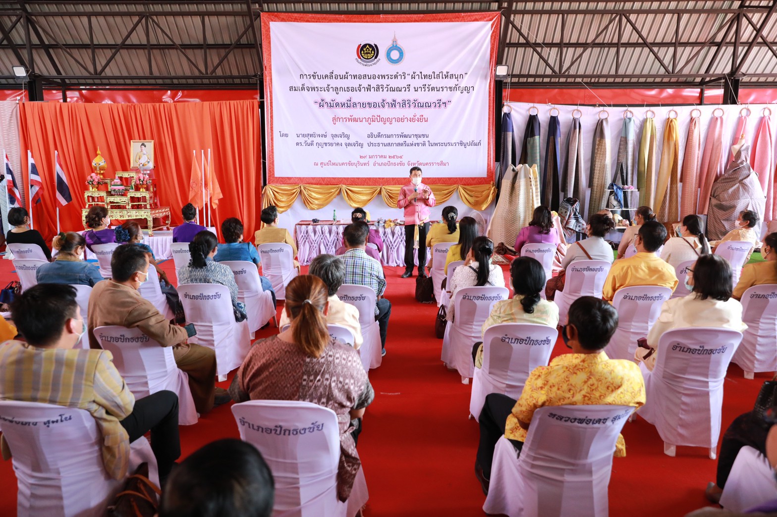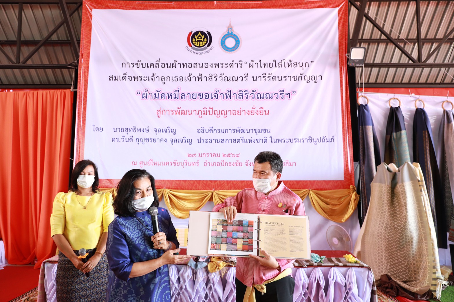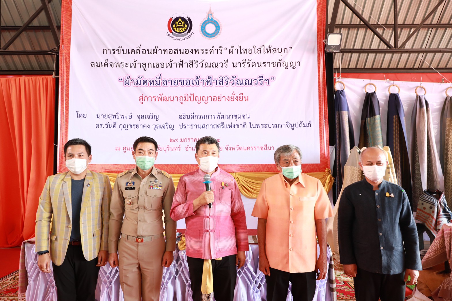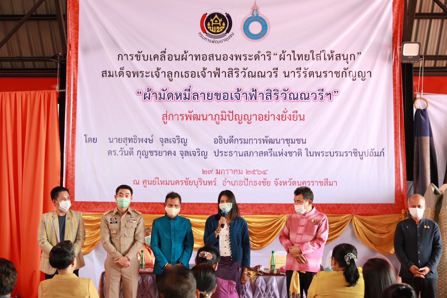 นายสุทธิพงษ์ จุลเจริญ อธิบดีกรมการพัฒนาชุมชน กระทรวงมหาดไทย เป็นประธานเวทีแลกเปลี่ยนการขับเคลื่อนผ้าทอ สนองพระดำริ “ผ้าไทยใส่ให้สนุก” ร่วมกับกลุ่มทอผ้า ผู้ผลิตผู้ประกอบการ OTOP ในการขับเคลื่อนกระบวนการ “ต้นน้ำ กลางน้ำ ปลายน้ำ” การสืบสาน “อนุรักษ์ศิลป์ผ้าถิ่นไทย ดำรงไว้ในแผ่นดิน” และเยี่ยมชมความก้าวหน้าการทอผ้าลาย “ผ้ามัดหมี่ลายขอเจ้าฟ้าสิริวัณณวรีฯ” สู่การพัฒนาภูมิปัญญาอย่างยั่งยืน โดยมี นายวิเชียร จันทรโณทัย ผู้ว่าราชการจังหวัดนครราชสีมา นายสุรศักดิ์ อักษรกุล รองอธิบดีกรมการพัฒนาชุมชน นายบัลลังก์ ไวทย์ศิริ นายอำเภอปักธงชัย นางสาวฑัชชา ปรีดาวิจิตรกุล ประธานเครือข่ายOTOP นายนุวัฒน์ พรมจันทึก ผู้แทนศูนย์หม่อนไหมเฉลิมพระเกียรติฯ นครราชสีมา พร้อมด้วย หัวหน้าส่วนราชการระดับจังหวัด คณะผู้บริหารกรมการพัฒนาชุมชนและเจ้าหน้าที่กรมการพัฒนาชุมชน ทั้ง 32 อำเภอ และกลุ่มทอผ้าจากกลุ่มนครชัยบุรินทร์ ใน 4 จังหวัด (นครราชสีมา,ชัยภูมิ,บุรีรัมย์,สุรินทร์) จำนวน 78 กลุ่ม และกลุ่มทอผ้า จ.มหาสารคาม จำนวน 3 กลุ่ม จ.สกลนคร จำนวน 5 กลุ่ม รวมทั้งหมด จำนวน 86 กลุ่ม เข้าร่วม ณ ศูนย์ไหมนครชัยบุรินทร์ อำเภอปักธงชัย จังหวัดนครราชสีมา