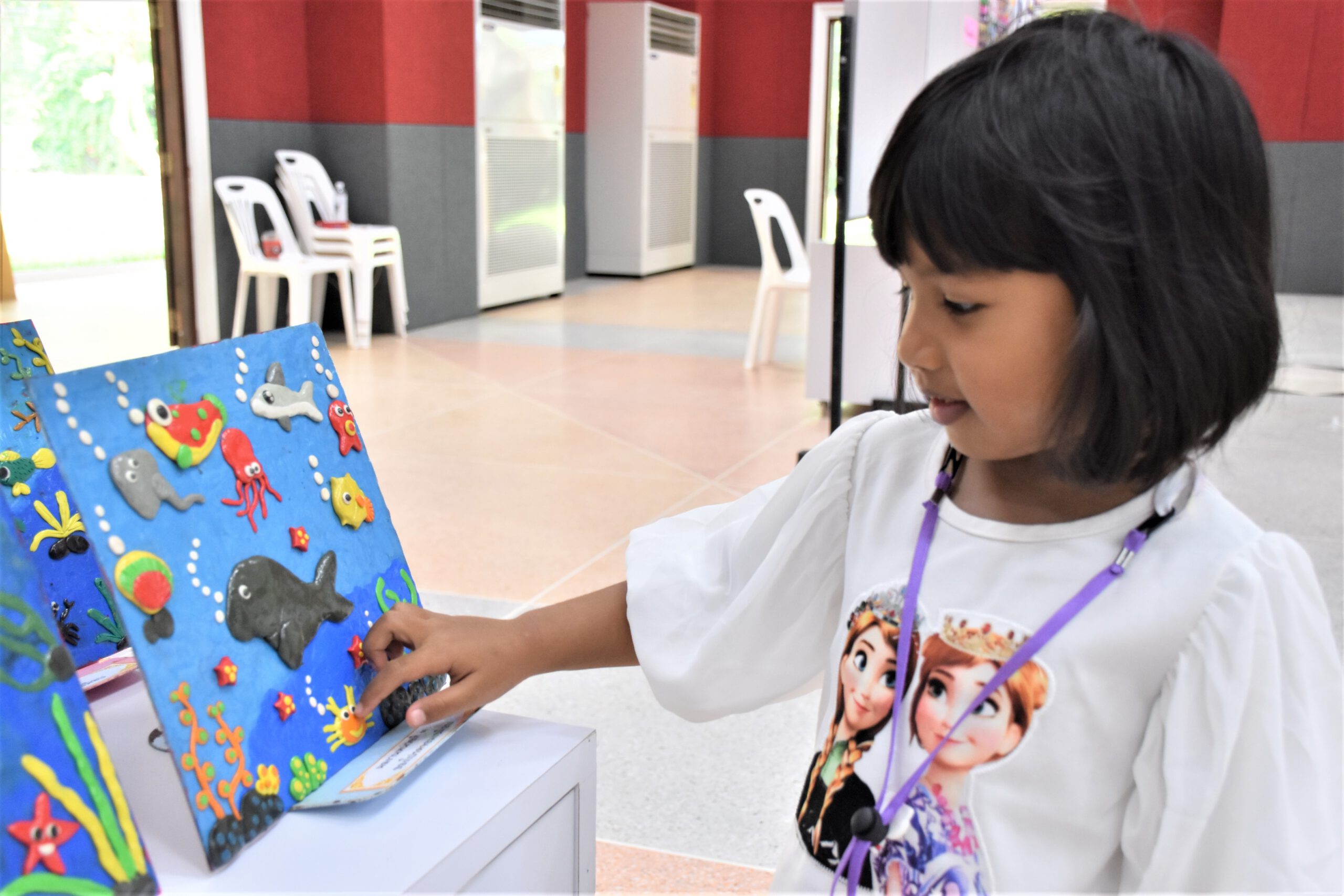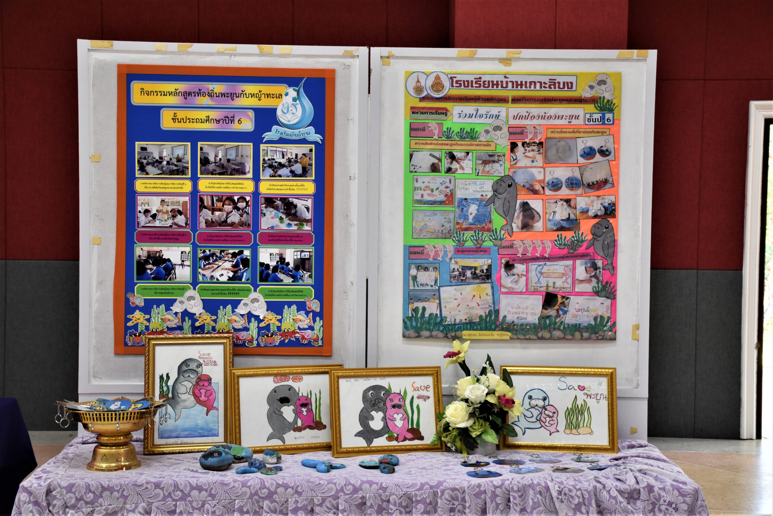 หลังจากนั้นคุณครูที่เข้ารับการอบรมจาก 8 โรงเรียน นำเสนอจากการสอนและนิเทศน์การสอนผ่านป้ายนิทรรศการเพื่อสรุปรายงานการจัดการเรียนการสอนด้วยหลักสูตรท้องถิ่นหน่วยบูรณาการอนุรักษ์พะยูนและหญ้าาทะเล ตั้งแต่กระบวนการที่ 1 จนนำสู่กระบวนการสอนในชั้นเรียนตั้งแต่ระดับชั้นประถมศึกษาปีที่ 1 ถึง ชั้นประถมศึกษาปีที่ 6 เพื่อนำสู่เรียนรู้ผลงานเพื่อนครู และร่วมโหวตผลงานที่เป็นตัวอย่างที่ดี แลกเปลี่ยนเรียนรู้สะท้อนคิดถึงผลการจัดการเรียนรู้เพื่อการต่อยอด ผลการโหวตได้แก่ คุณครูอตินุช บุญนวล สอนชั้นประถมศึกษาปีที่ 1 โรงเรียนบ้านควนตุ้งกู อำเภอกันตัง จังหวัดตรัง