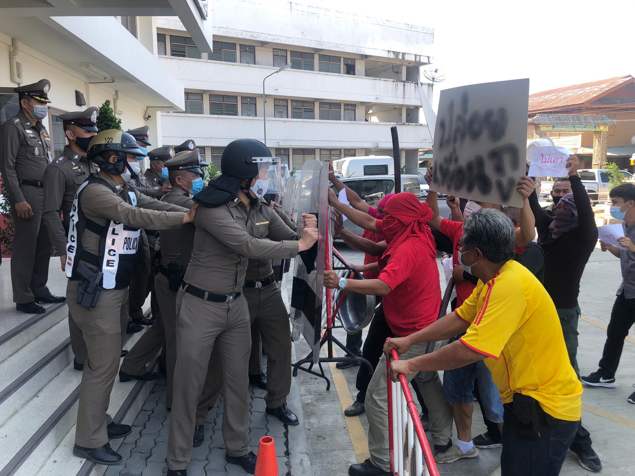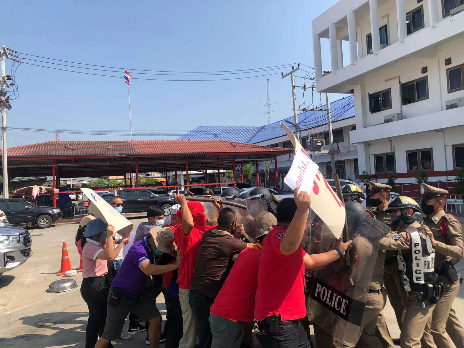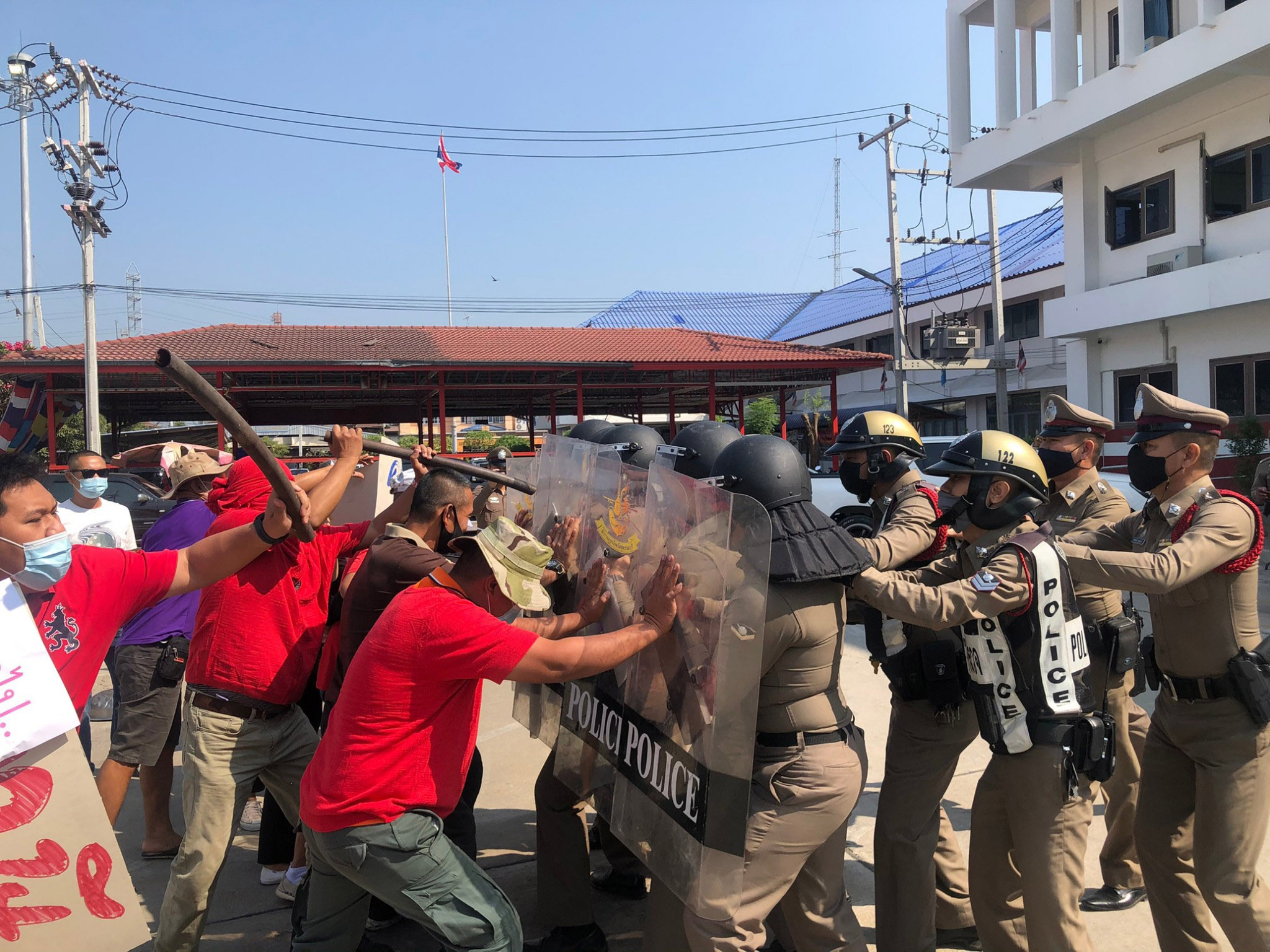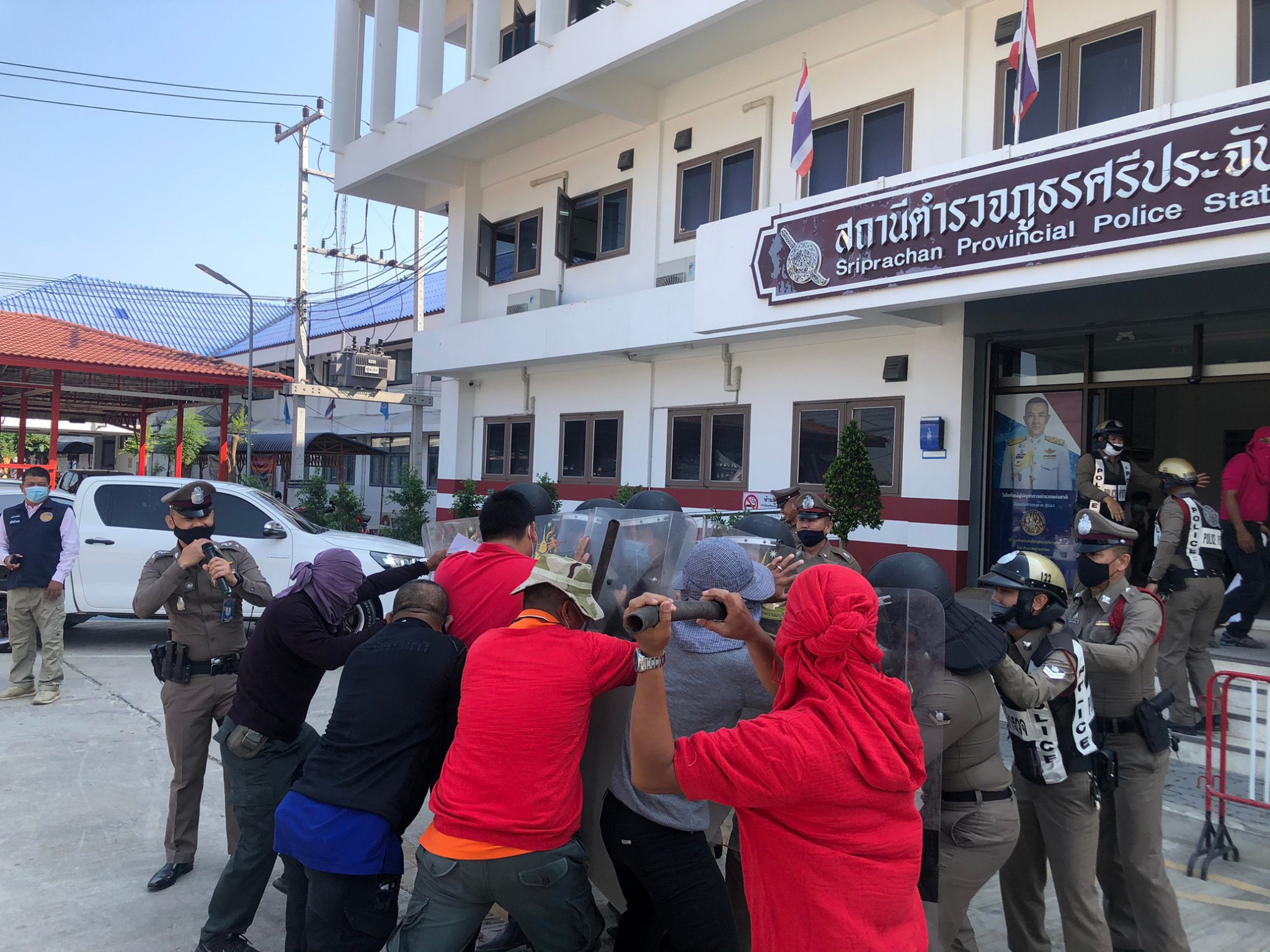 กรณี มีกลุ่มผู้ชุมนุมจำนวนมากถือป้ายข้อความต่างๆมารวมกันตัวเรียกร้อง และพยายามบุกเข้าไปในโรงพัก และพยายามทำลายทรัพย์สินของทางราชการเช่นการปลดธงชาติ หน้าโรงพัก รวมทั้งการที่ม็อบใช้กำลังเข้าปะทะเพื่อฝ่าแนวกั้นกับเจ้าหน้าที่เข้าไปกำลังเจ้าหน้าที่ตำรวจชุดควบคุมฝูงชนก็พยายามจับกุมตามยุทธวิธีจากการฝึกอบรมมาปรับใช้ทั้งนี้ได้มุ่งเน้นความปลอดภัย และการเจรจาเป็นหลักทั้งนี้เพื่อลดการบาดเจ็บและการสูญเสียของทั้งสองฝ่ายเป็นหลัก