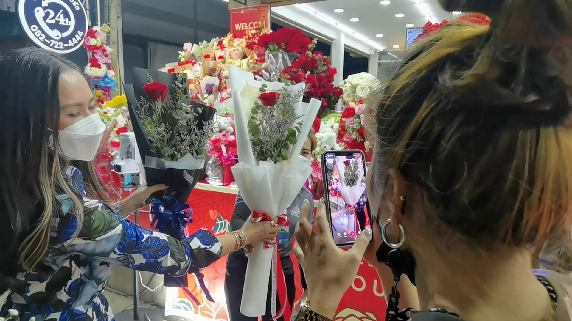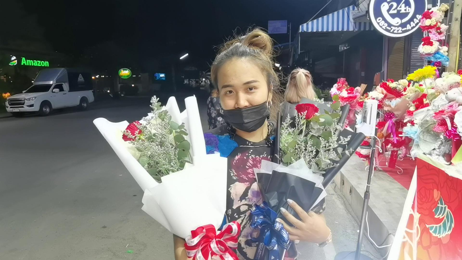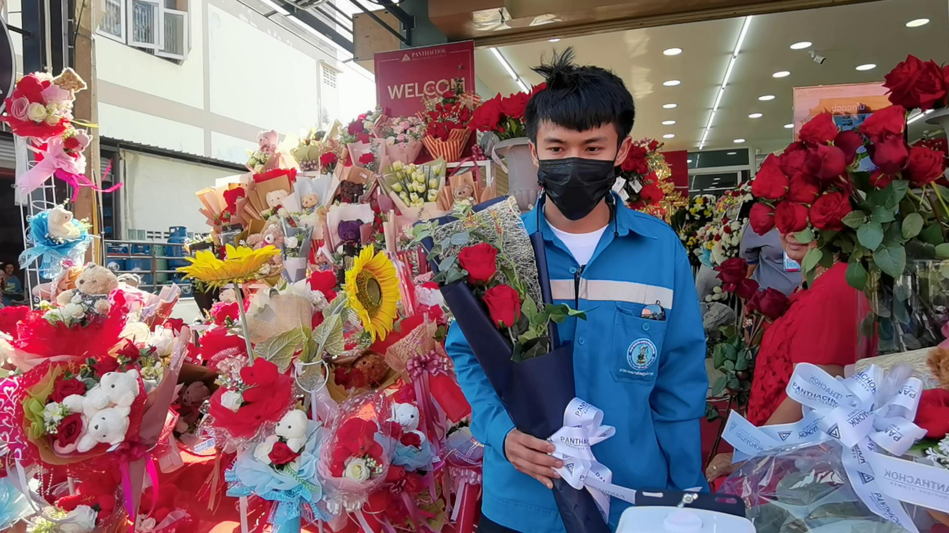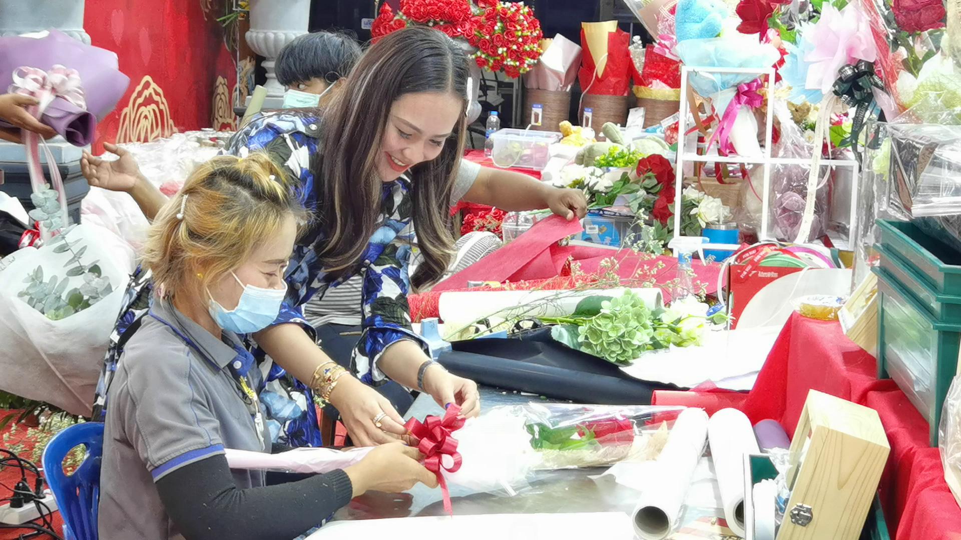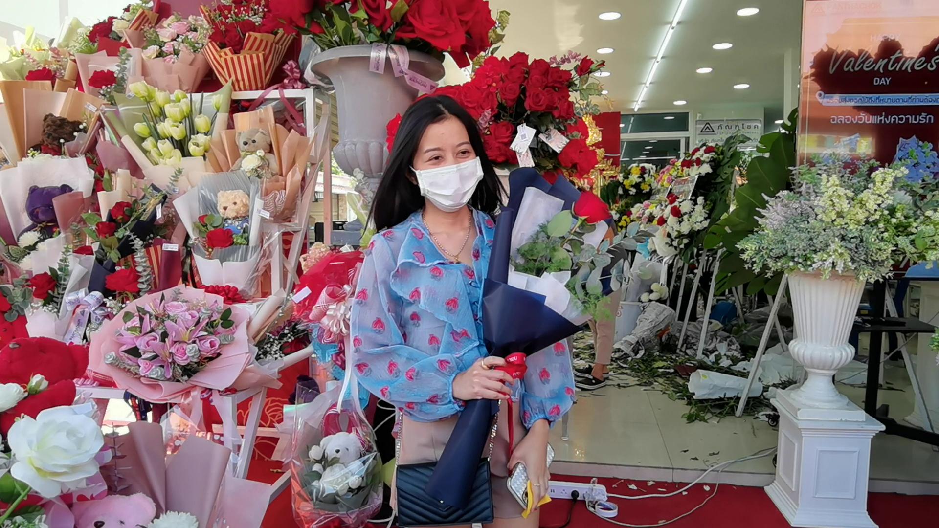 นางสาวปฐมาภรณ์ เกตุมาลา อายุ 27 ปี เจ้าของร้านภัณฑโชค ฟิวเนอรัล เล่าให้ฟังว่า เทศกาลวาเลนไทน์ปีนี้ คึกคักซึ่งทางร้านมีการปรับตัวเพื่อสู้กับสถานการณ์การแพร่ระบาดของโควิด-19 และเศรษฐกิจที่ฝืดเคือง จากรายได้ที่ลดลง ลูกค้าซื้อน้อยลง ทางร้านจึงต้องปรับหารูปแบบใหม่ๆ รวมไปถึงการบริการลูกค้า การบริการจัดช่อ และ การเป็นคนส่งมอบดอกไม้ เพื่อการบริการให้ลูกค้าประทับใจ สำหรับของขวัญวันวาเลนไทน์ จะเป็นอื่นไม่ได้คือ “ดอกกุหลาบ” ซึ่งสีที่ได้รับความนิยมมากที่สุดยังคงเป็นกุหลาบสีแดง รองลงมาเป็นสีชมพูและสีขาว สำหรับราคาขายดอกกุหลาบ ที่เป็นที่นิยมอย่างมากคือ ดอกกุหลาบฮอลแลนด์ มีลักษณะดอกใหญ่ สีสด ก้านโต และสามารถเก็บไว้ได้นานนับสัปดาห์ เวลาที่นำไปมอบให้แฟนหรือคนพิเศษ หลังจากที่เก็บไว้เมื่อกลับมาเห็นก็ยังมีความสวยสดคงทนถาวรที่มีความพิเศษสามารถเก็บไว้ได้นานถ้าแช่น้ำไว้ โดยตอนนี้เรามีออร์เดอร์สั่งมากกว่า 200 ออร์เดอร์ ซึ่งเป็นที่นิยมกันเป็นอย่างมาก ทั้งช่อเล็ก ดอกเดียว ช่อ 2 ดอก หรือ จะเป็นช่อใหญ่