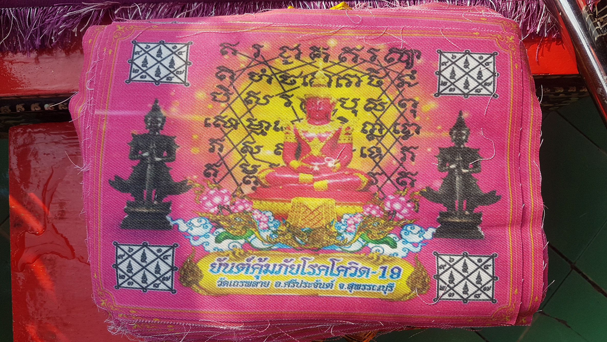 หลังเสร็จพิธีพระครูพิสุทธิรัตนาภรณ์ เจ้าอาวาสวัดเถรพลาย อ.ศรีประจันต์ จ.สุพรรณบุรี แจกผ้ายันต์คุ้มภัยโควิด19 หลวงพ่อสีชมพู รุ่นแรก ด้านในผ้ายันต์เป็นองค์หลวงพ่อสีชมพู มียันต์เกราะเพชร ป้องกันสิ่งอัปมงคล ที่มุมผ้ายันต์มียันต์ ตรีนิสิงเห อยู่ 4 ทิศ โดยยันต์ตรีนิสิงเห โบราณาจารย์ท่าน อักขระคาถา คาถาสำคัญโบราณ เพื่อป้องกันภัยอันตรายและโรคภัยไข้เจ็บ คุ้มกันภัย ด้านซ้ายและด้านขวาเป็นองค์ท้าวเวสสุวรรณ เป็นเทพเจ้าแห่งยักษ์ เป็นหนึ่งในจาตุมหาราช ผู้คุ้มครองและดูแลโลกมนุษย์ สถิตอยู่บนสวรรค์ชั้นจาตุมหาราชิกา ทรงอิทธิฤทธิ์อานุภาพมากประทับ ณ โลกบาล นำแจกให้ผู้ที่มาร่วมพิธีทุกคนไว้เพื่อความเป็นสิริมงคลและเป็นที่ยึดเหนี่ยวทางจิตใจ ช่วงโควิด19 แพร่ระบาด นอกจากนี้ยังแจกล็อกเก็ตหลวงพ่อสีชมพู ประดับพลอย รุ่นแรก ให้กับผู้ที่เกิดวันที่ 14 กุมภาพันธ์ ให้นำบัตรประชนมาแสดงเพื่อขอรับแจกล็อกเก็ตหลวงพ่อสีชมพูไว้เป็นสิริมงคลต่อชีวิตได้ตั้งแต่วันที่ 14-28 กุมภาพันธ์ 2564