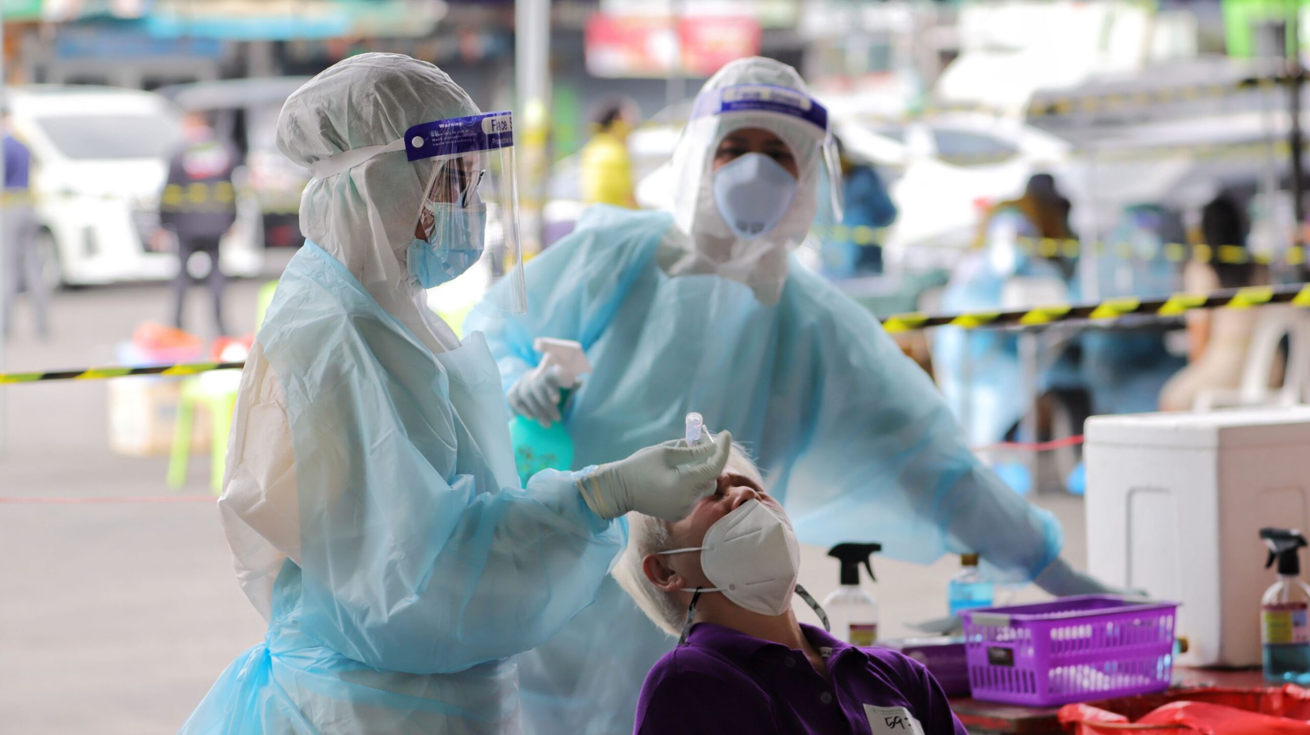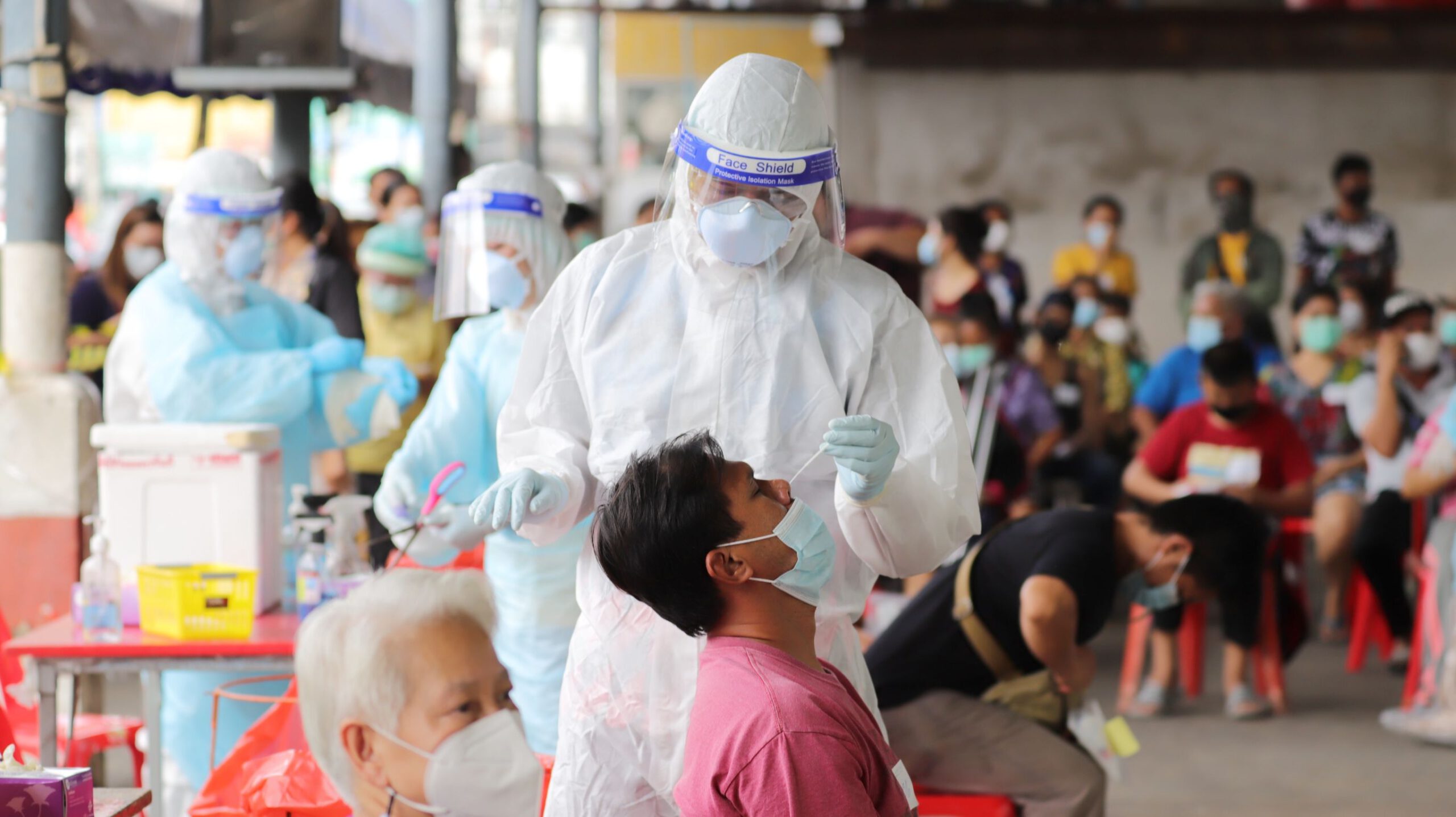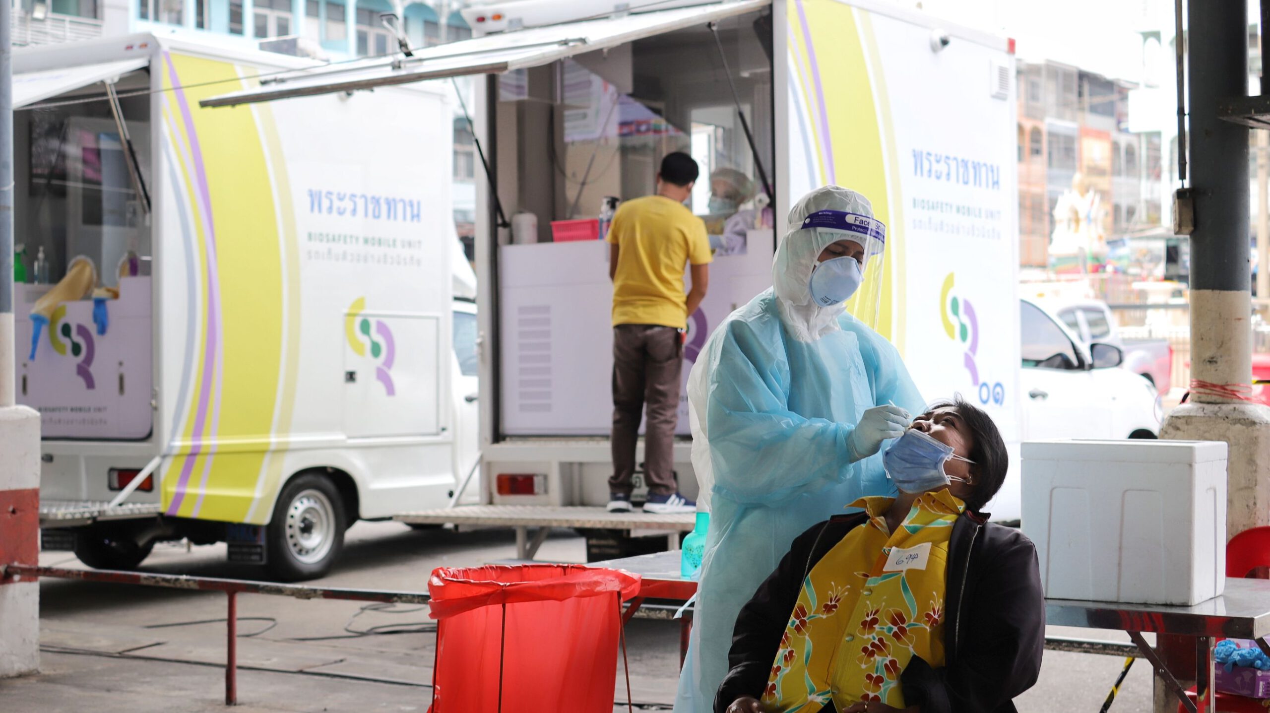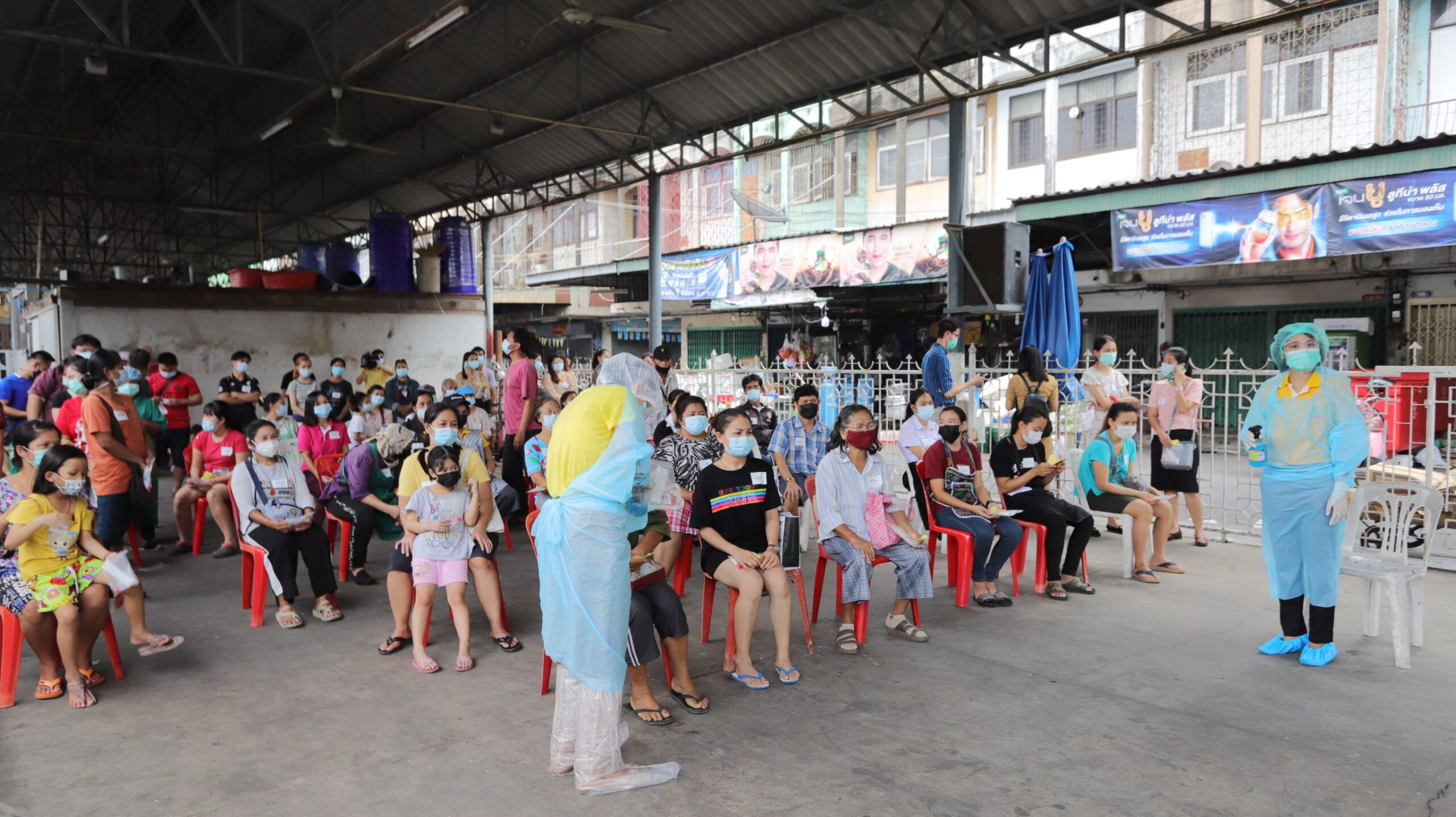 ที่ตลาดพรพัฒน์ ตำบล ประชาธิปัตย์ อำเภอธัญบุรี จังหวัดปทุมธานี พล.ต.ท.คำรณวิทย์ ธูปกระจ่าง นายก อบจ.ปทุมธานี นายพิษณุ ประภาธนานันท์ นายอำเภอธัญบุรี นายแพทย์รังสรรค์ บุตรชา ผู้อำนวยการโรงพยาบาลประชาธิปัตย์ พร้อมรถตรวจโรคติดเชื้อชีวนิรภัย พระราชทานของในหลวงรัชกาลที่ 10 จากสถาบันป้องกันควบคุมโรคเขตเมือง จำนวน 4 คัน ลงพื้นที่ตลาดพรพัฒน์ ตำบลประชาธิปัตย์ อำเภอธัญบุรี จังหวัดปทุมธานี เพื่อมาตรวจคัดกรองและเก็บตัวอย่าง การ Swab จากเยื่อโพรงจมูก เพื่อตรวจหาเชื้อโควิด-19 ในแรงงานชาวต่างด้าวและคนไทย ในพื้นที่ ตลาดพรพัฒน์ และตำบลประชาธิปัตย์ ซึ่งเป็นพื้นที่กลุ่มเสี่ยง เพื่อปฏิบัติการเชิงรุกสร้างความเชื่อมั่นและเน้นย้ำมาตรการป้องกันการแพร่เชื้อ