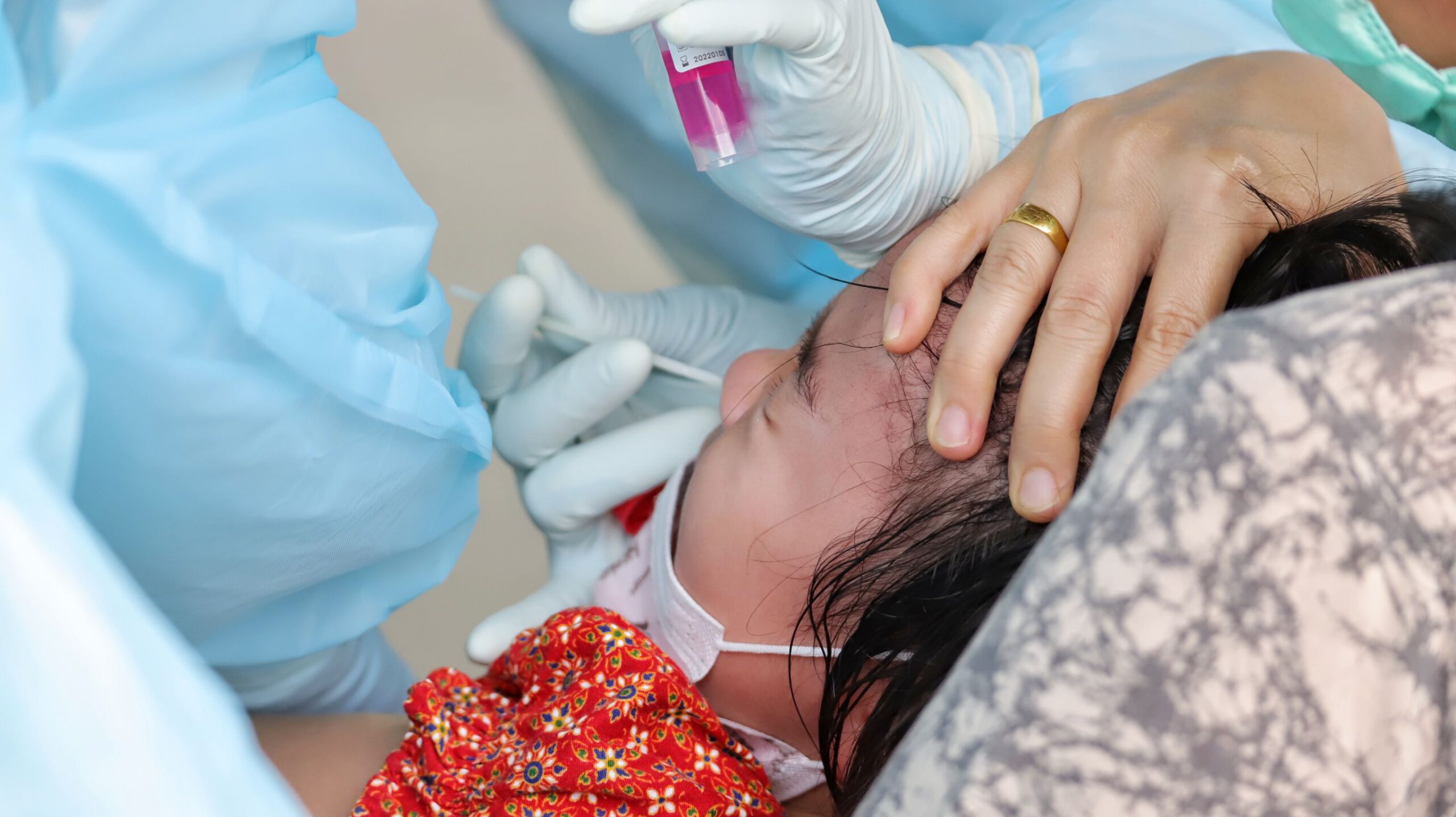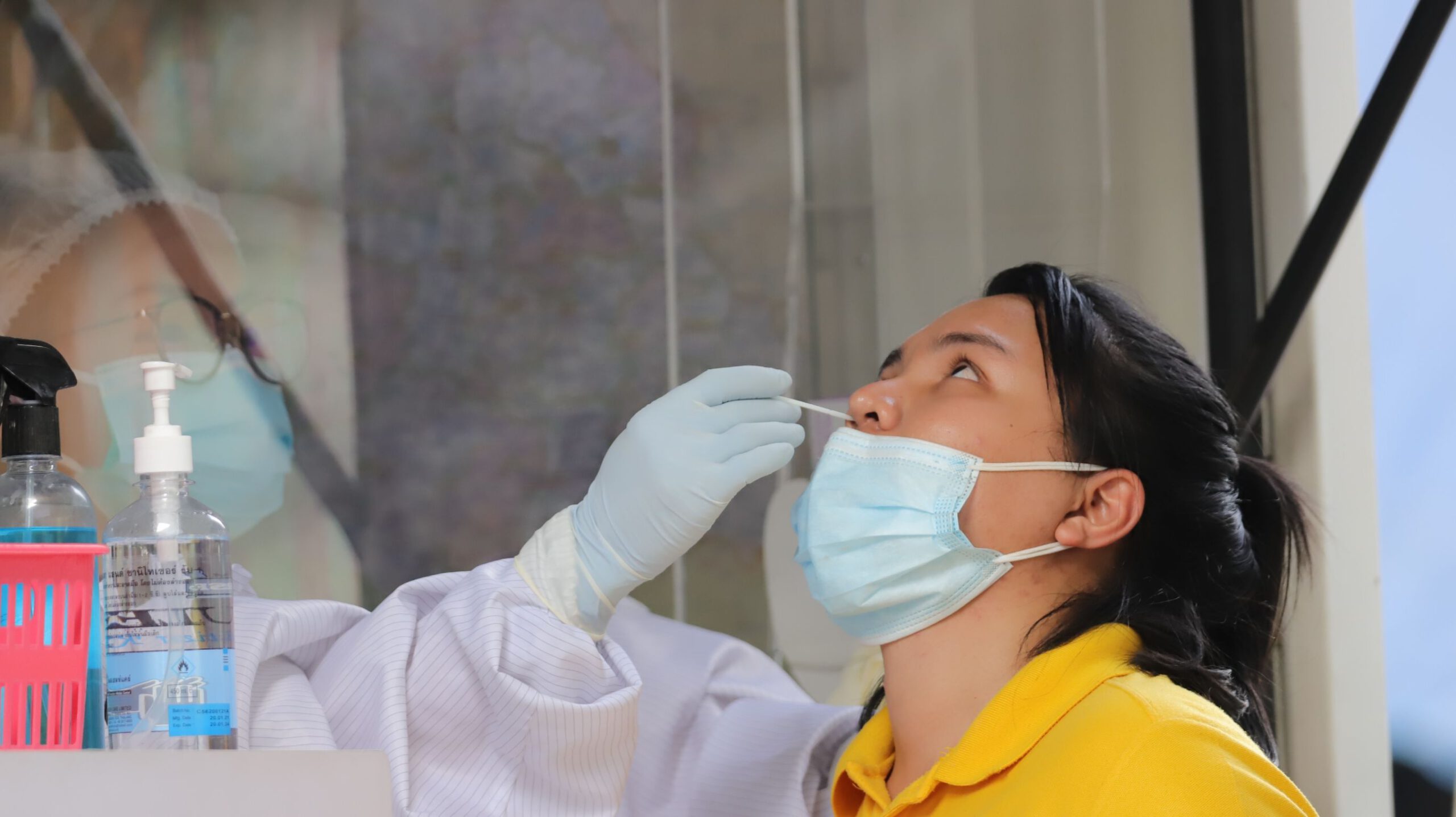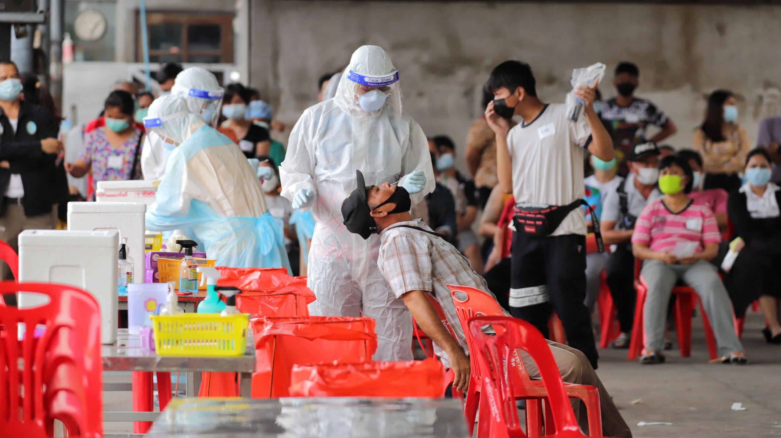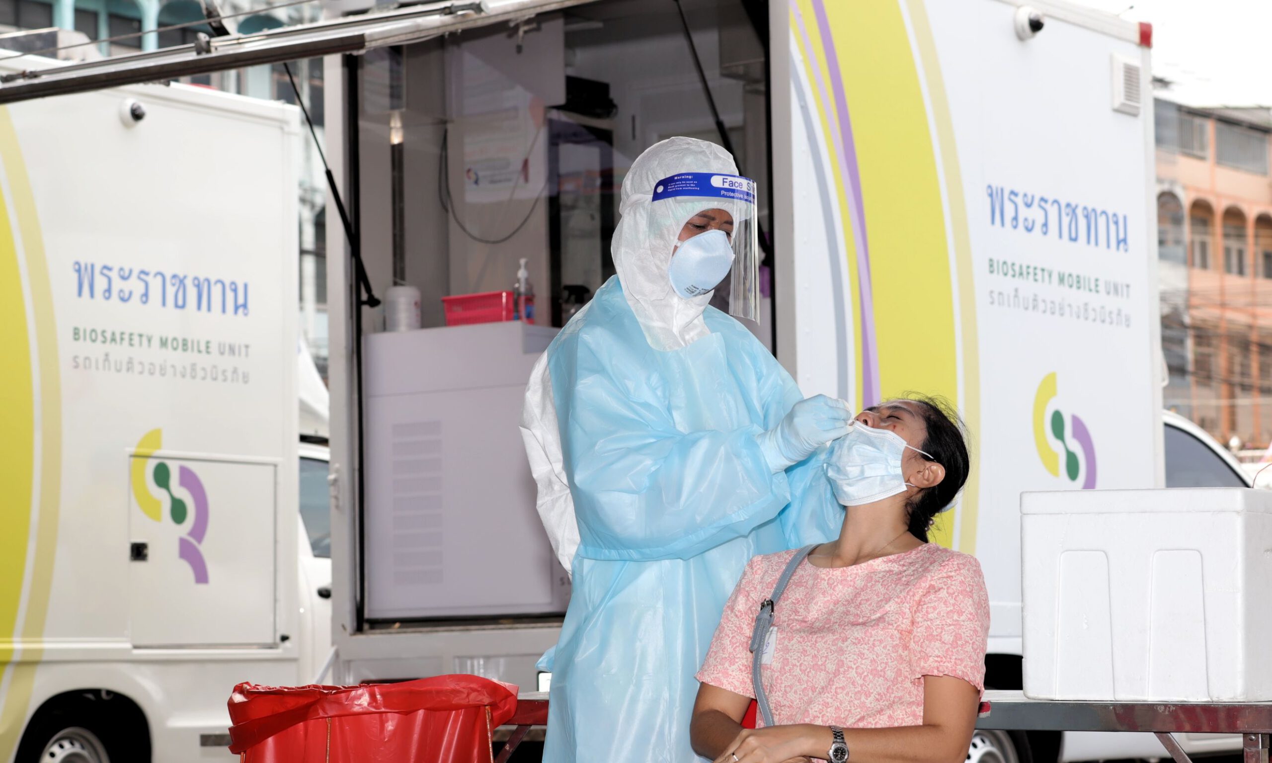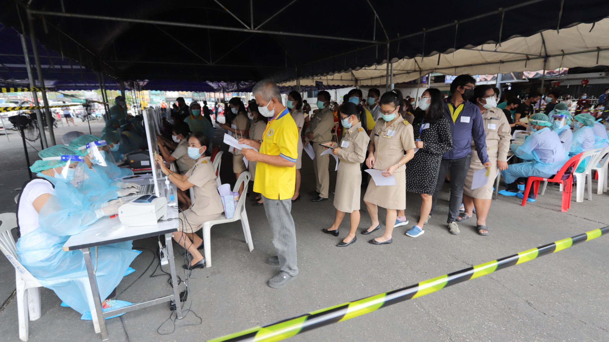 ที่ตลาดพรพัฒน์ ตำบล ประชาธิปัตย์ อำเภอธัญบุรี จังหวัดปทุมธานี พล.ต.ท.คำรณวิทย์ ธูปกระจ่าง นายก อบจ.ปทุมธานี นายพิษณุ ประภาธนานันท์ นายอำเภอธัญบุรี นายแพทย์รังสรรค์ บุตรชา ผู้อำนวยการโรงพยาบาลประชาธิปัตย์ พร้อมรถตรวจโรคติดเชื้อชีวนิรภัย พระราชทานของในหลวงรัชกาลที่ 10 จากสถาบันป้องกันควบคุมโรคเขตเมือง จำนวน 4 คัน ลงพื้นที่ตลาดพรพัฒน์ ตำบลประชาธิปัตย์ อำเภอธัญบุรี จังหวัดปทุมธานี เพื่อมาตรวจคัดกรองและเก็บตัวอย่าง การ Swab จากเยื่อโพรงจมูก เพื่อตรวจหาเชื้อโควิด-19 ในแรงงานชาวต่างด้าวและคนไทย ในพื้นที่ ตลาดพรพัฒน์ และตำบลประชาธิปัตย์ ซึ่งเป็นพื้นที่กลุ่มเสี่ยง เพื่อปฏิบัติการเชิงรุกสร้างความเชื่อมั่นและเน้นย้ำมาตรการป้องกันการแพร่เชื้อ