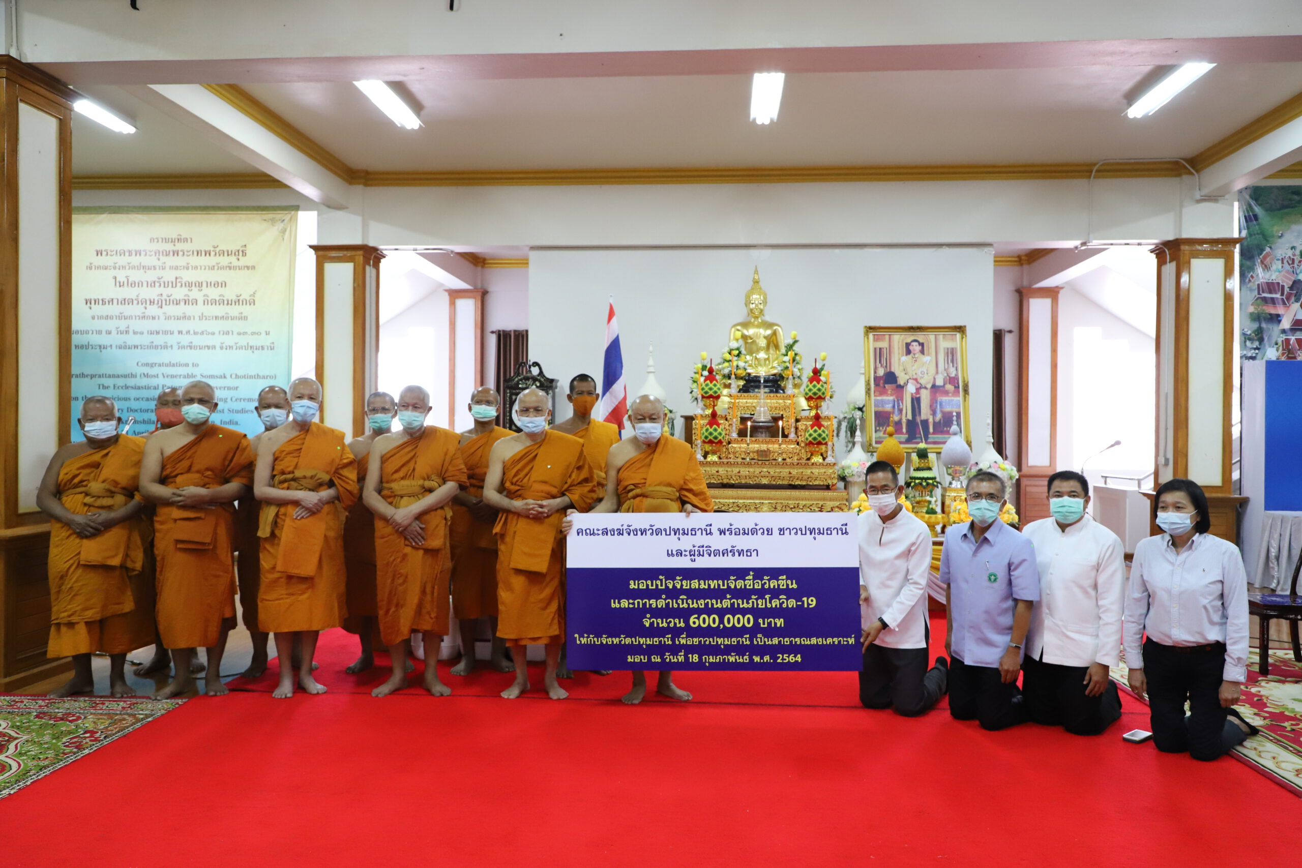 โดยส่วนแรก ได้มอบปัจจัยจำนวน 600,000 บาท เพื่อสบทบการจัดซื้อวัคซีน และสนับสนุนการดำเนินงานต้านภัยโควิด-19 เพื่อชาวปทุมธานี เป็นสาธารณสงเคราะห์ ให้กับจังหวัดปทุมธานี ผ่านผู้ว่าราชการจังหวัดปทุมธานี และส่วนที่สอง ได้มอบปัจจัยจำนวน 500,000 บาท พร้อมด้วยน้ำยาฆ่าเชื้อโควิด-19 สำหรับฉีดพ่นภายใน-ภายนอกอาคาร มูลค่ารวม 952,400 บาท สนับสนุนการดำเนินงานต้านภัยโควิด-19 เพื่อชาวปทุมธานี เป็นสาธารณสงเคราะห์ ให้กับองค์การบริหารส่วนจังหวัดปทุมธานี ผ่านนายกองค์การบริหารส่วนจังหวัดปทุมธานี