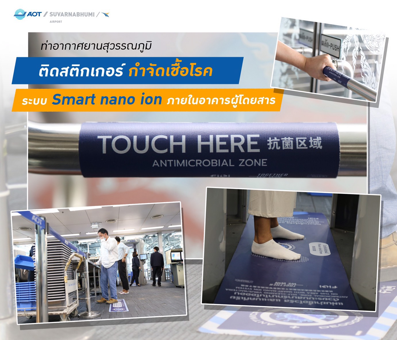 ท่าอากาศยานสุวรรณภูมิติดสติ๊กเกอร์กำจัดเชื้อโรคด้วยระบบ Smart nano ion ภายในอาคารผู้โดยสาร