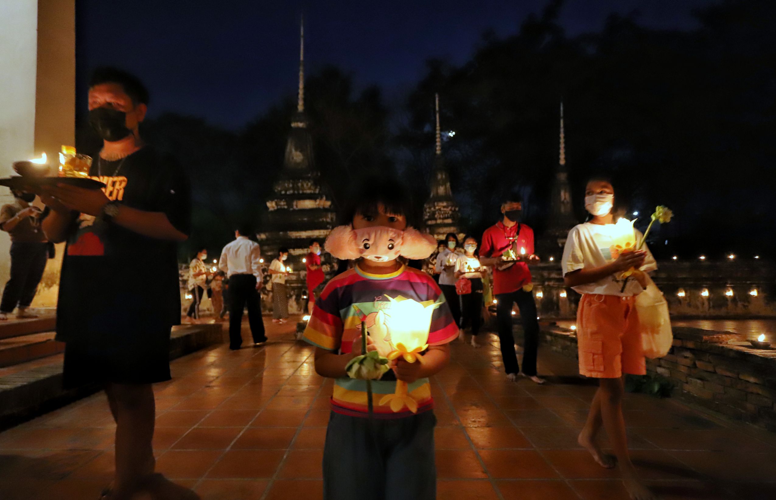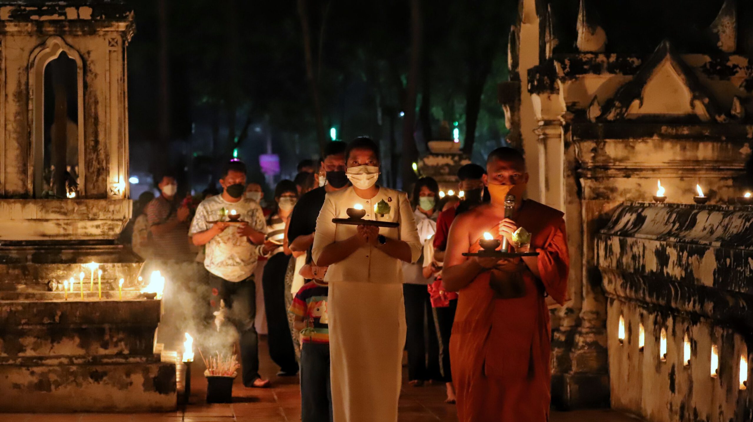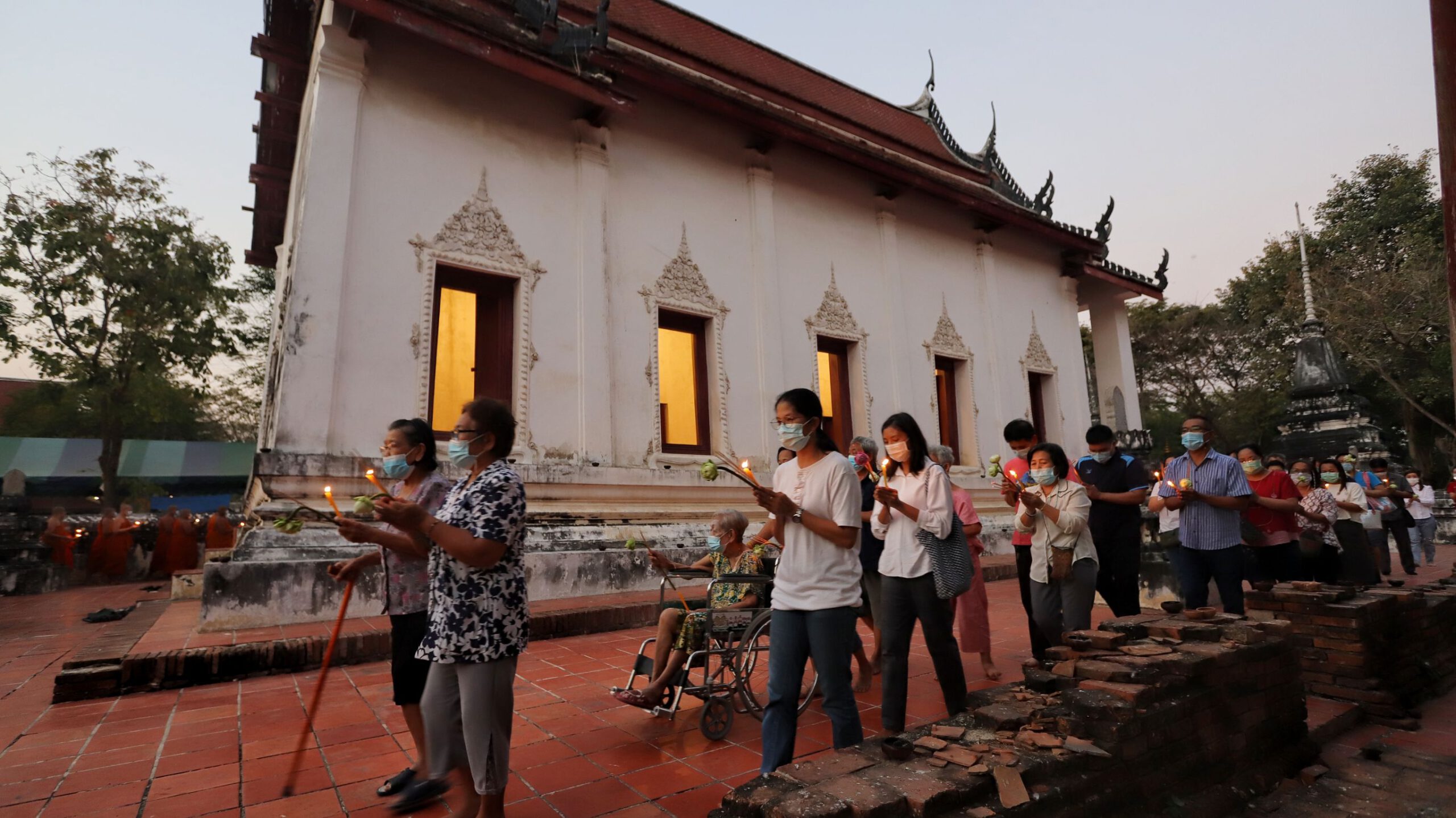 พุทธศาสนิกชนพาครอบครัวเวียนเทียนพร้อมจุดประทีปรอบอุโบสถเก่าแก่วัดสิงห์สามโคกถวายเป็นพุทธบูชาวันมาฆบูชา
